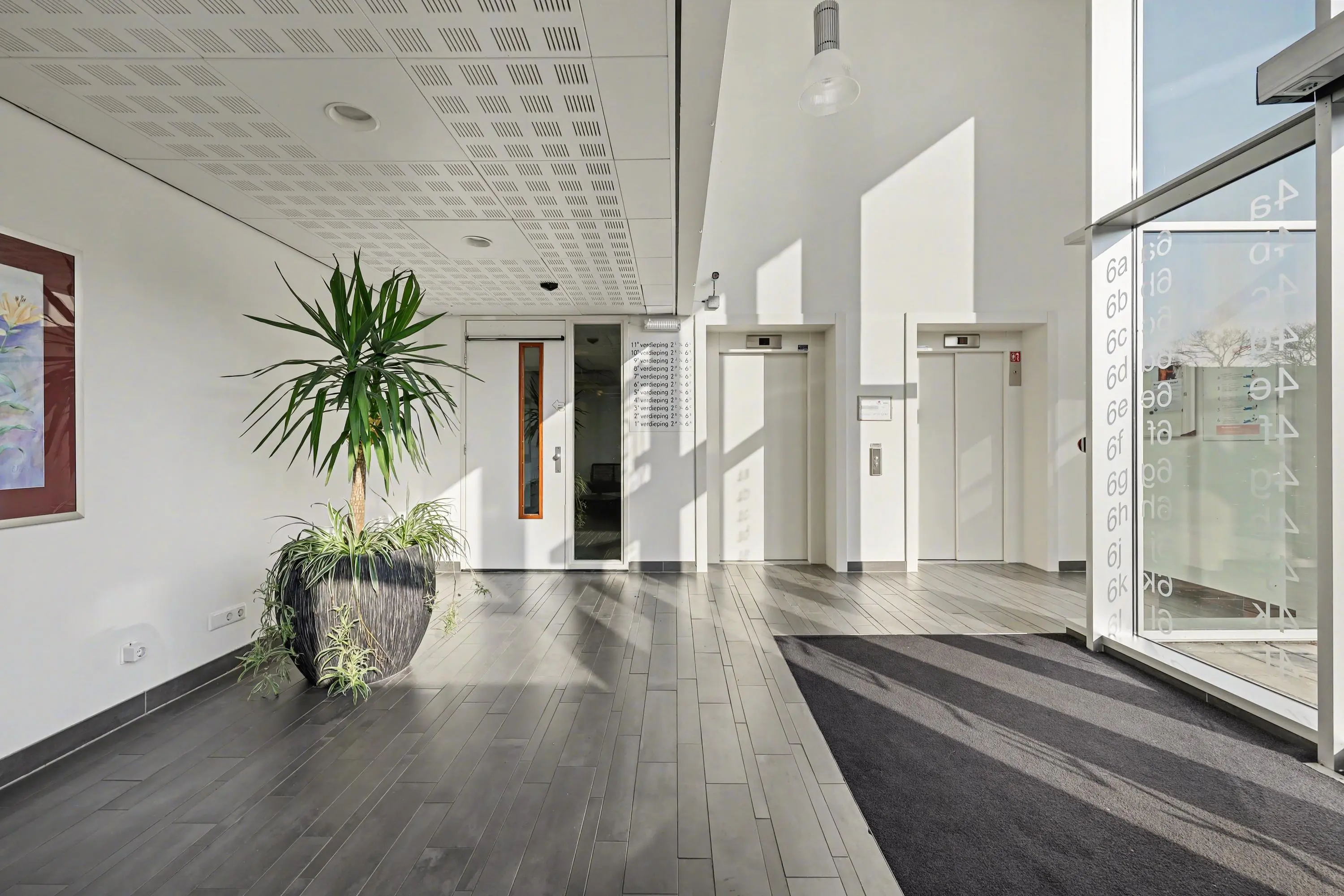 Videophone, centrale hal met grote raampartijen en veel lichtinval, toegang tot de bergingen.