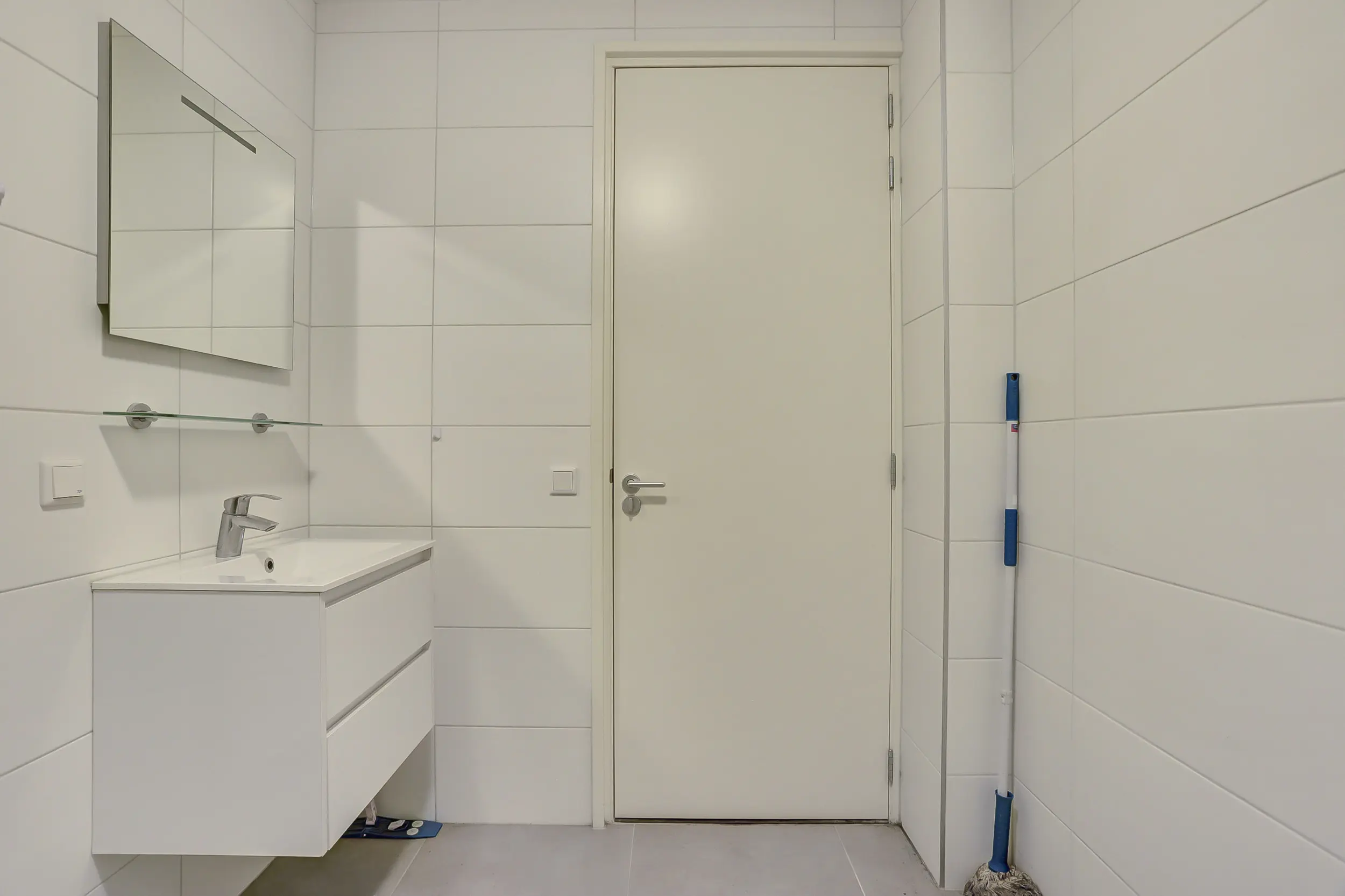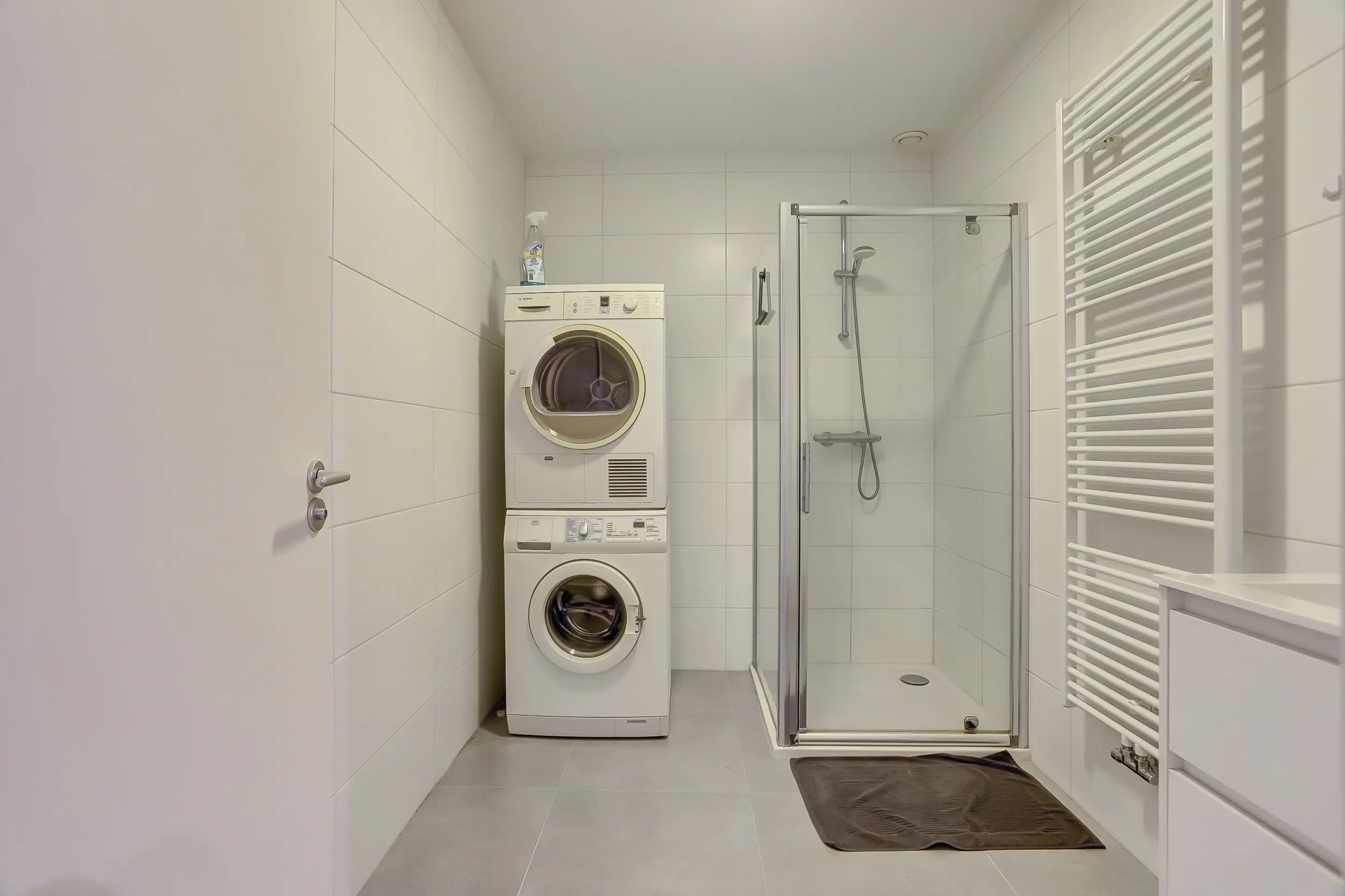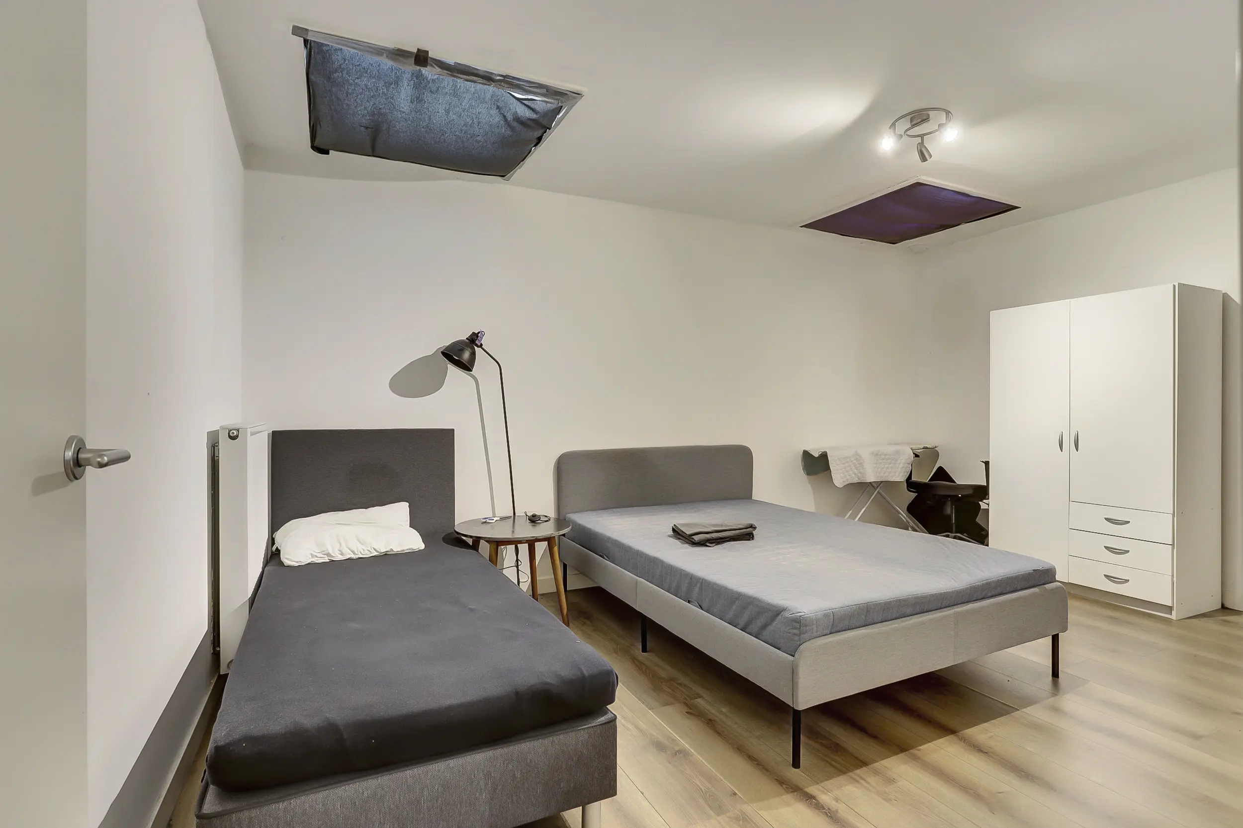 Aan de achterzijde bevindt zich de ruime slaapkamer, waar twee dakramen zorgen voor een prettige lichtinval. Vanuit de slaapkamer heb je toegang tot de badkamer. Deze is volledig betegeld en uitgerust met een douche, wastafelmeubel, designradiator en een aansluiting voor de wasmachine. Daarnaast is er een separaat toilet aanwezig.