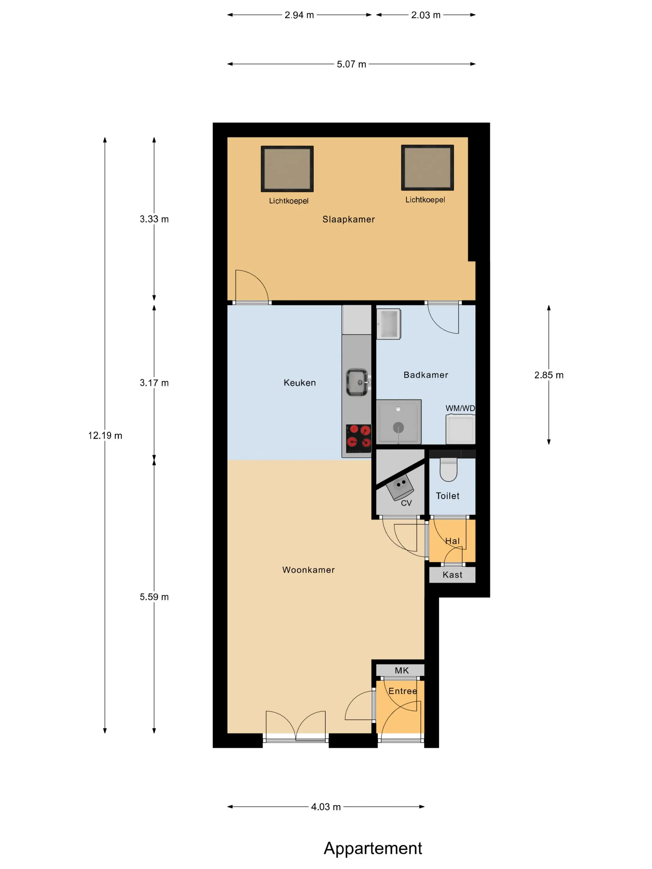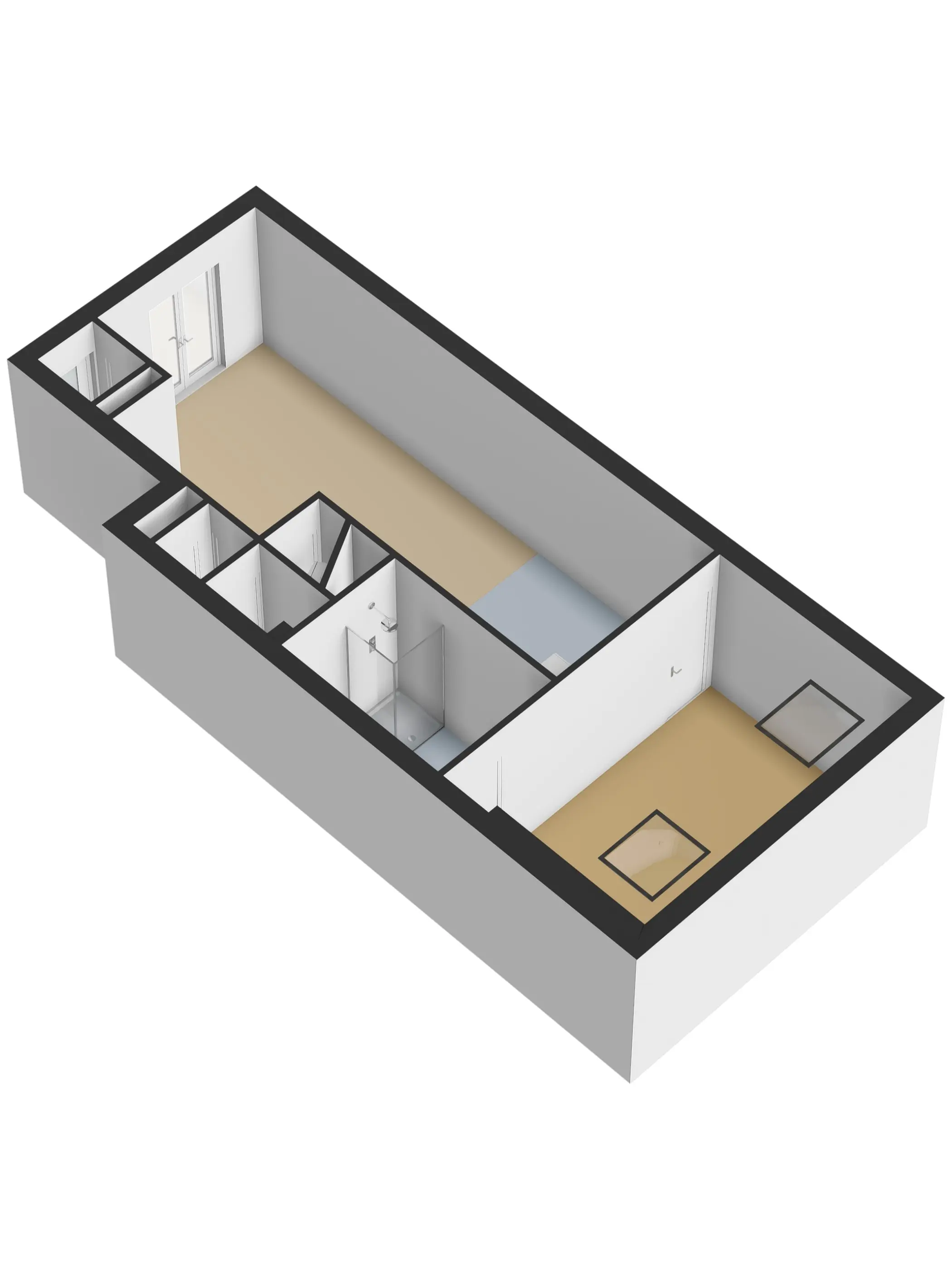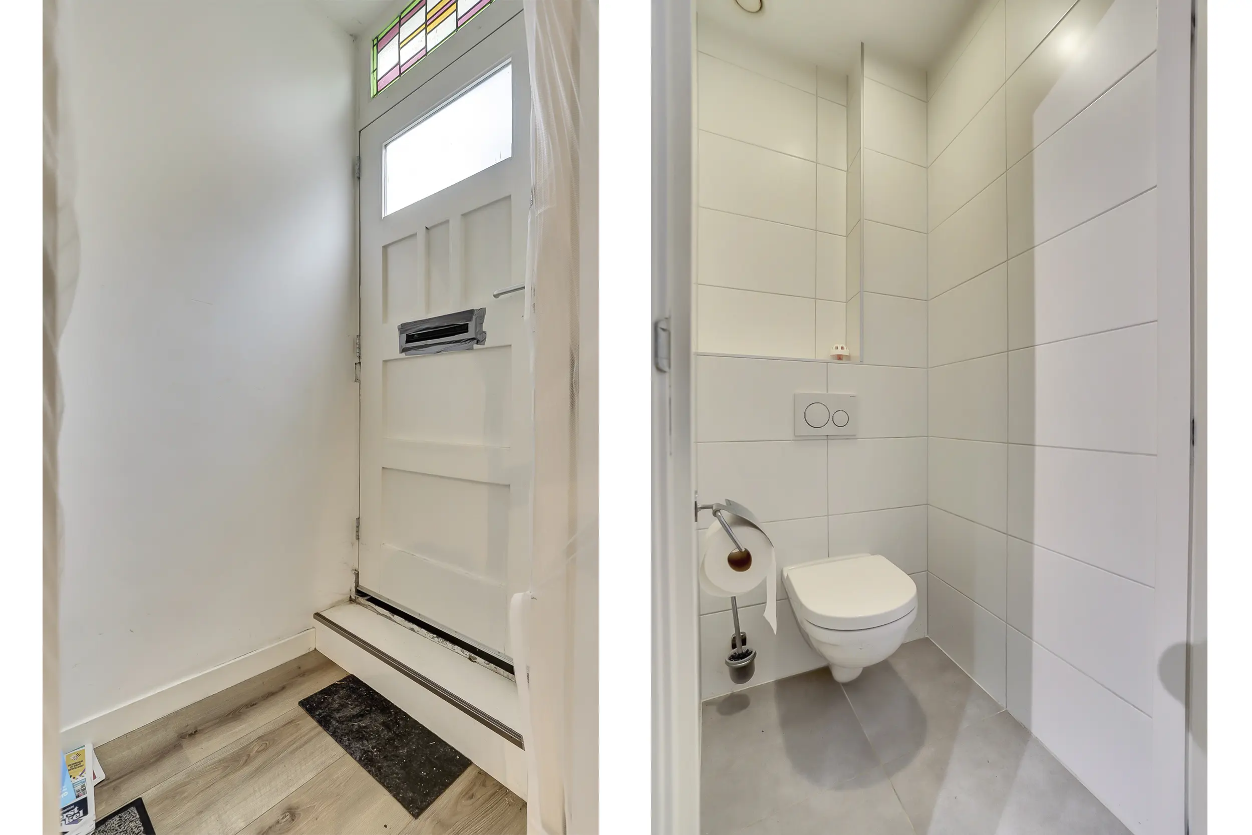 Aan de achterzijde bevindt zich de ruime slaapkamer, waar twee dakramen zorgen voor een prettige lichtinval. Vanuit de slaapkamer heb je toegang tot de badkamer. Deze is volledig betegeld en uitgerust met een douche, wastafelmeubel, designradiator en een aansluiting voor de wasmachine. Daarnaast is er een separaat toilet aanwezig.