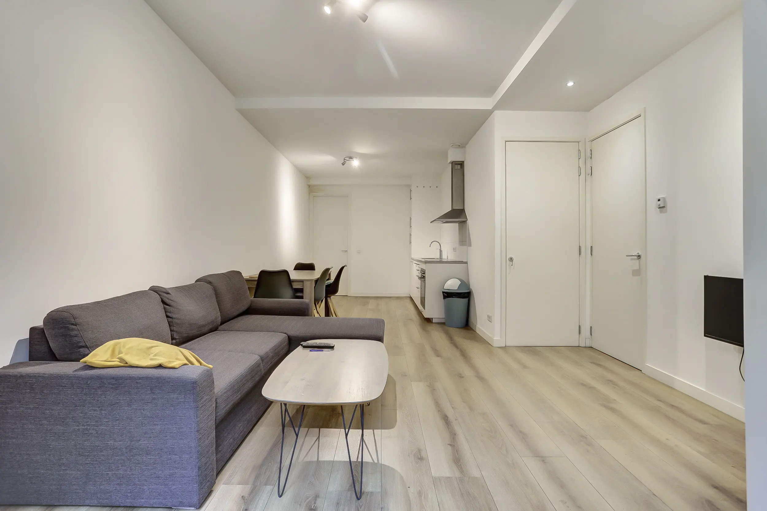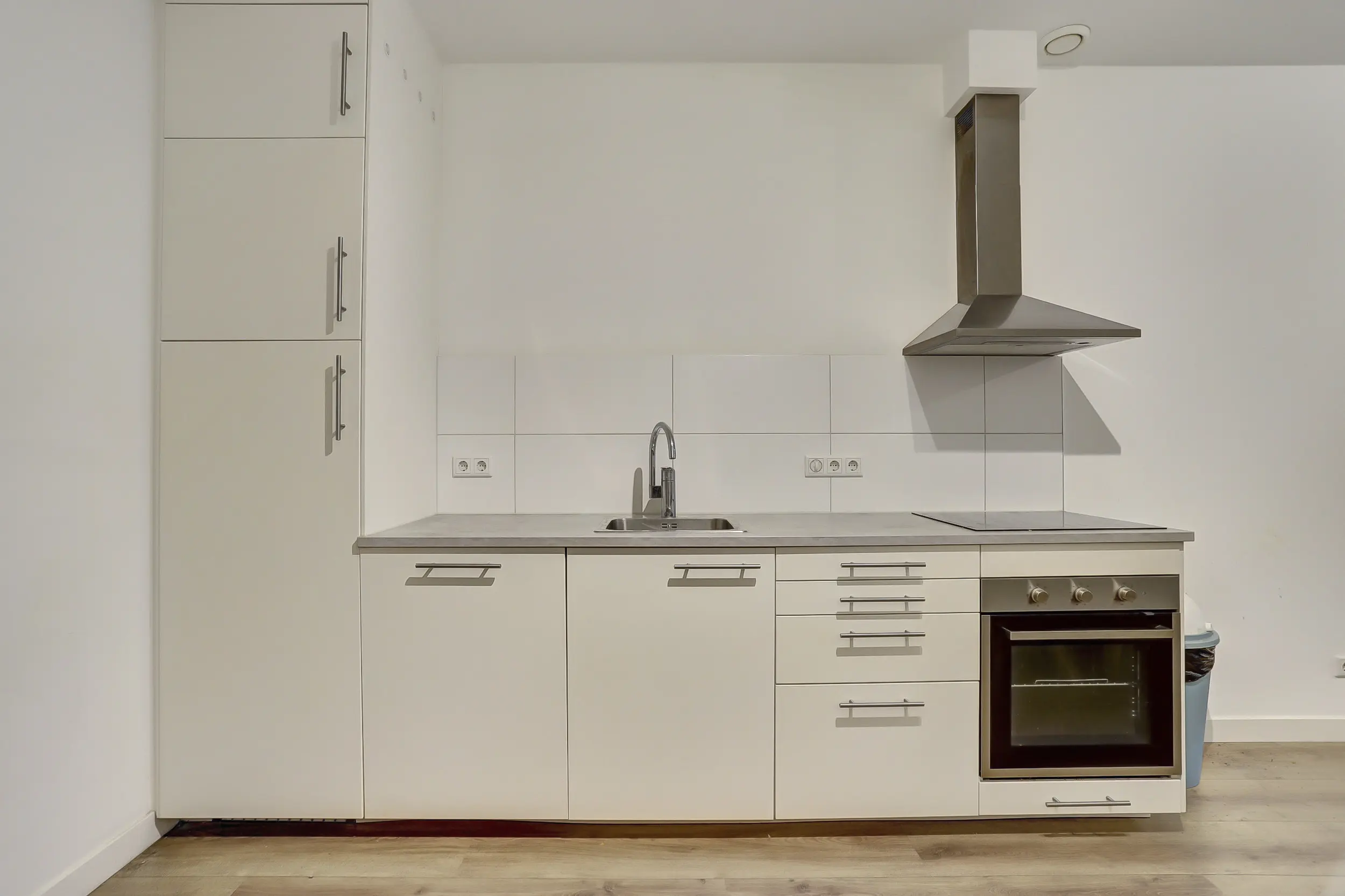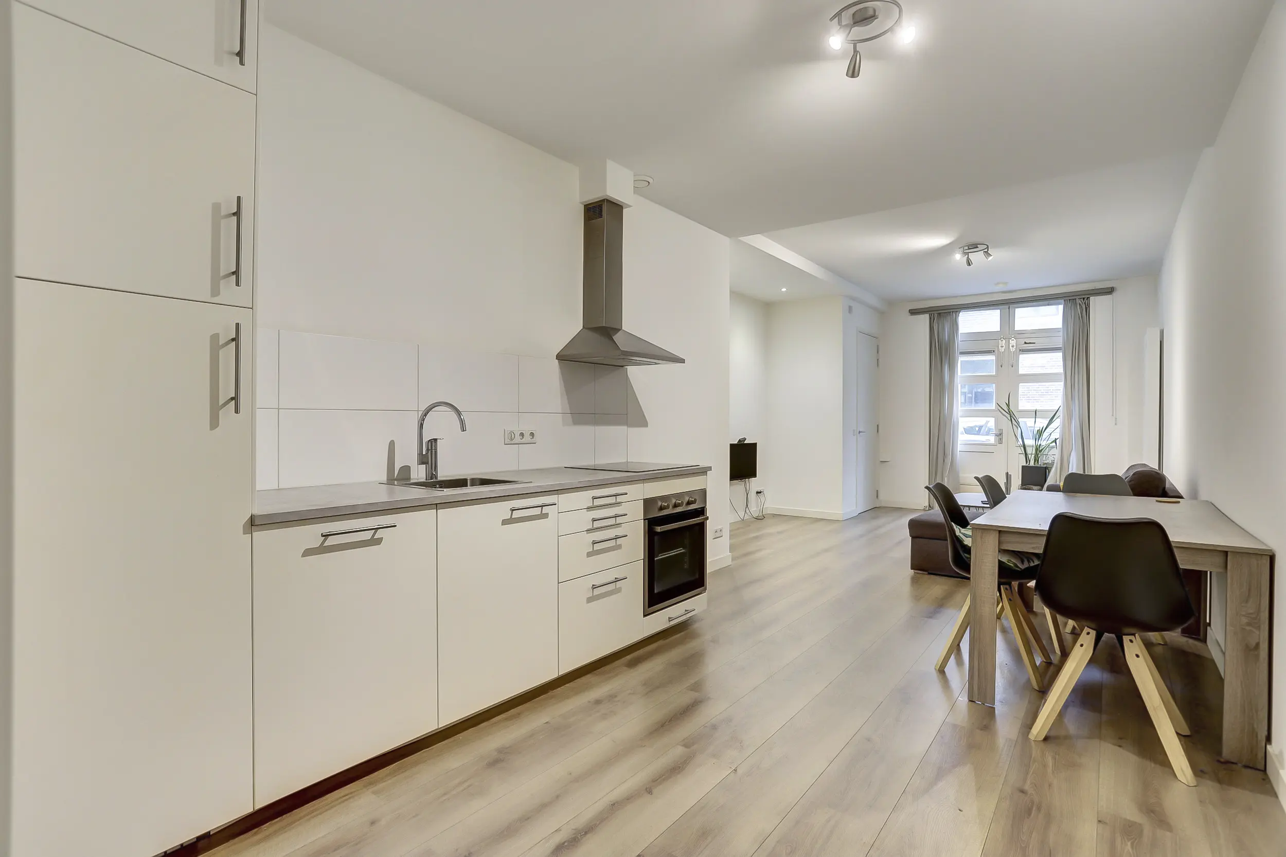 Bij binnenkomst kom je in de lichte woonkamer aan de voorzijde van de woning. Vanuit deze ruimte loop je direct door naar de open keuken, die in strak wit is uitgevoerd en is voorzien van diverse inbouwapparatuur, waaronder een elektrische kookplaat, afzuigkap, oven, koel-vriescombinatie en een vaatwasser.