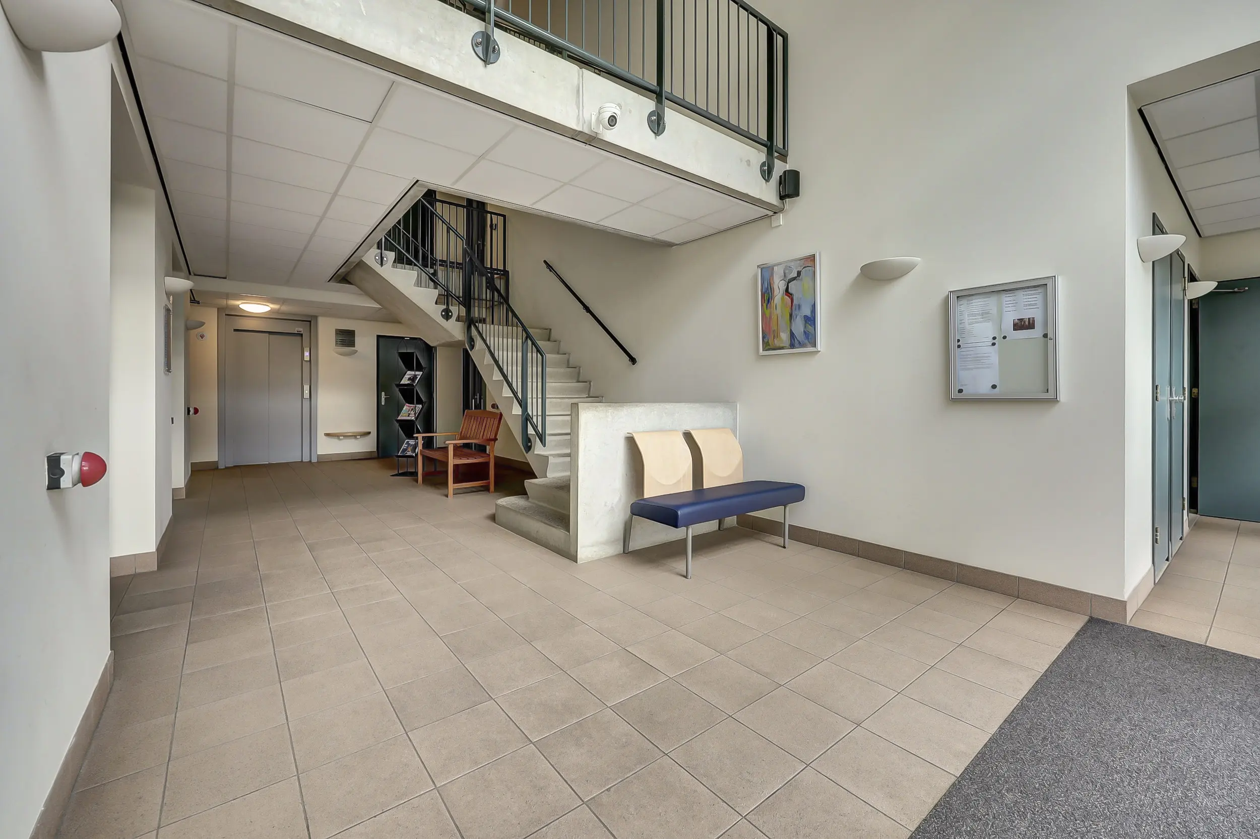Via de gezamenlijke entree op de begane grond betreed je de ruime hal met trap en lift. Op deze verdieping bevinden zich de gemeenschappelijke fietsenberging en een royale en gezellige ruimte voor algemeen gebruik, waar bewoners samenkomen voor activiteiten en ontmoetingen.
