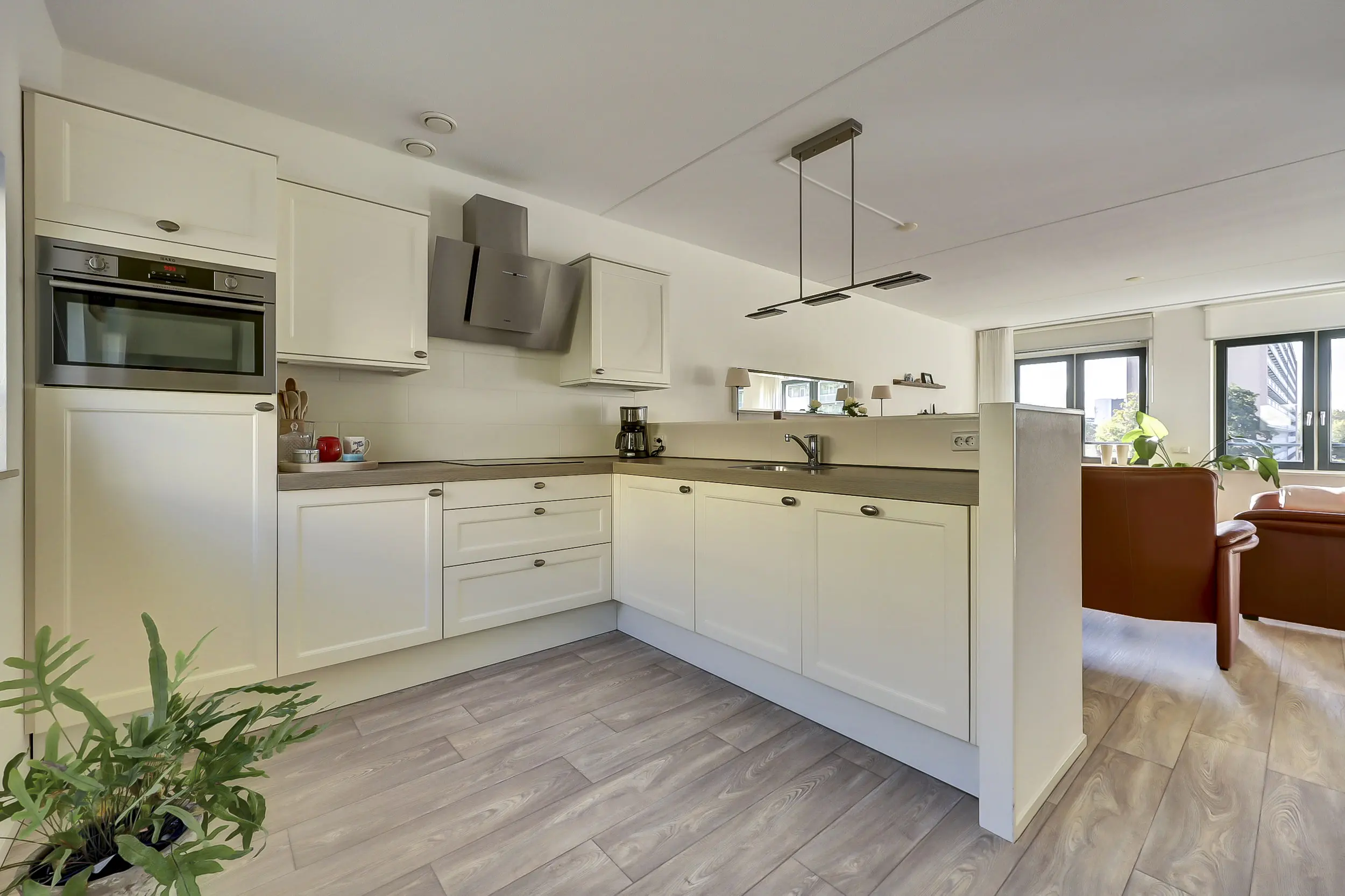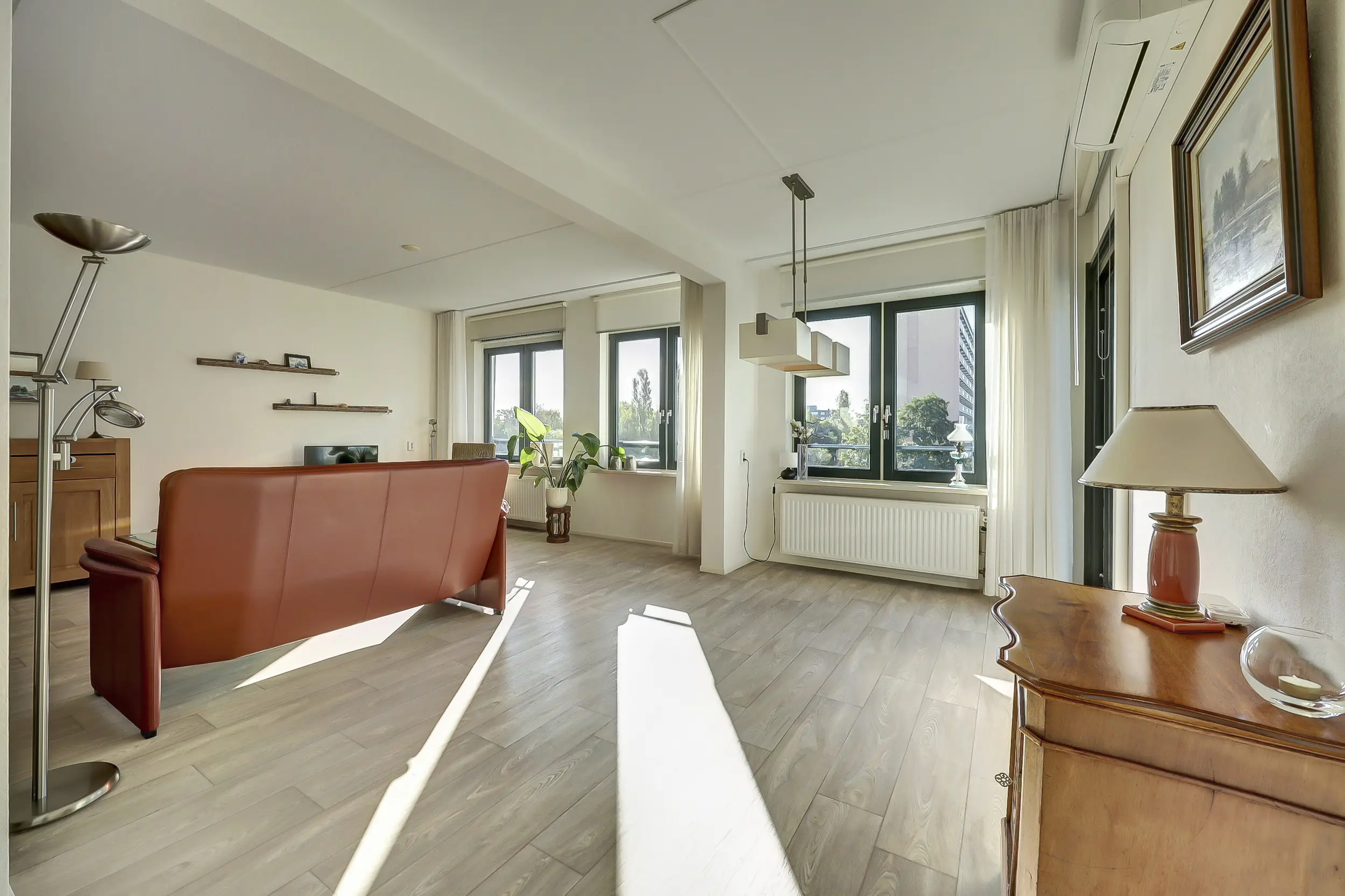 De woonkamer ligt aan de voorzijde van het gebouw en heeft dankzij de gunstige ligging en grote raampartijen veel natuurlijke lichtinval. Oorspronkelijk bestond deze ruimte uit twee kamers, waardoor het eenvoudig mogelijk is om weer een extra slaapkamer te realiseren. Vanuit de woonkamer is er toegang tot het zonnige balkon met vrij uitzicht. Tevens is de woonkamer voorzien van elektrisch bediende zonneschermen, wat zorgt voor extra comfort tijdens zonnige dagen.
