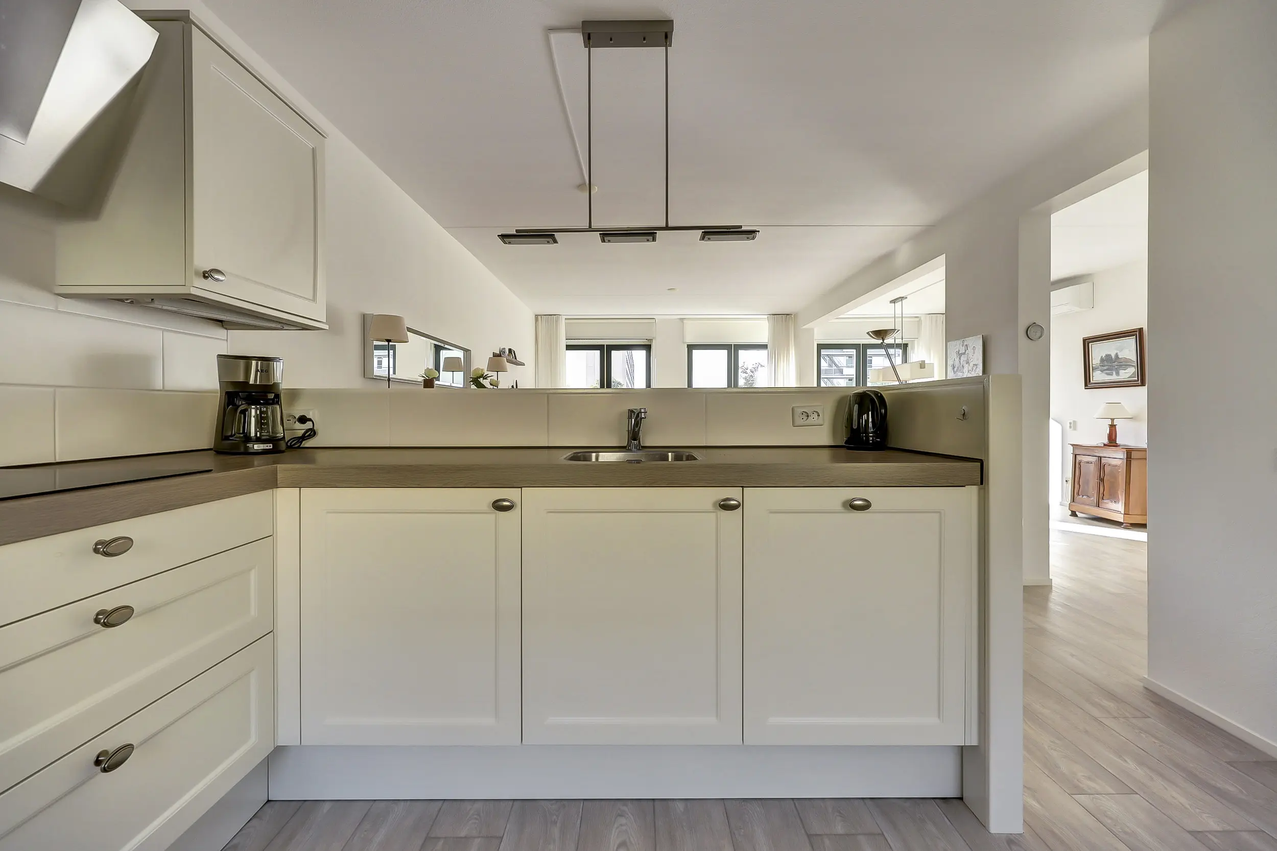 De open keuken in L-opstelling is praktisch ingericht en voorzien van diverse inbouwapparatuur, waaronder een inductiekookplaat met afzuigkap, koelkast, tafelmodel vriezer, vaatwasser en magnetron.