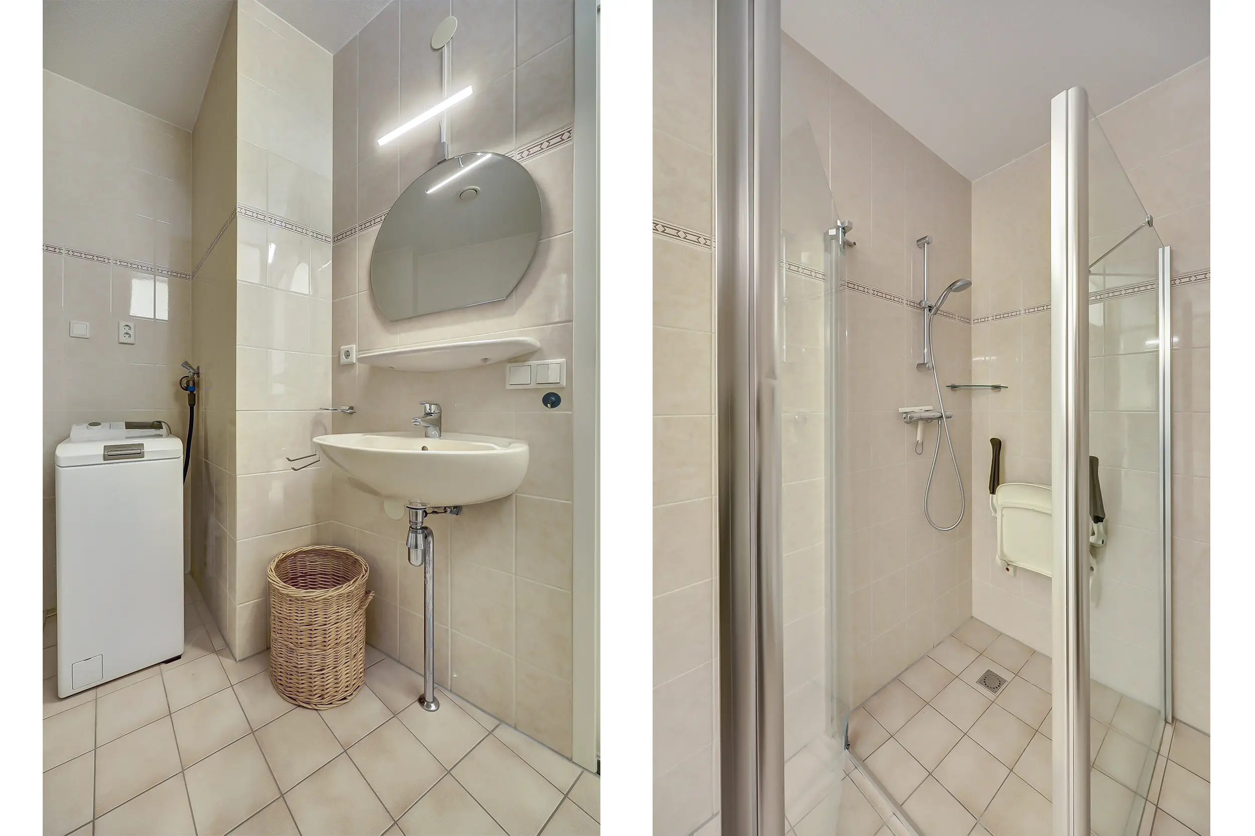 De slaapkamer, heeft directe toegang tot zowel het balkon als de badkamer. Deze is volledig betegeld en ruim opgezet, met een douche, tweede toilet, wastafel en aansluitingen voor wasmachine en droger. De badkamer is zo ingericht dat het geschikt is voor mindervaliden.