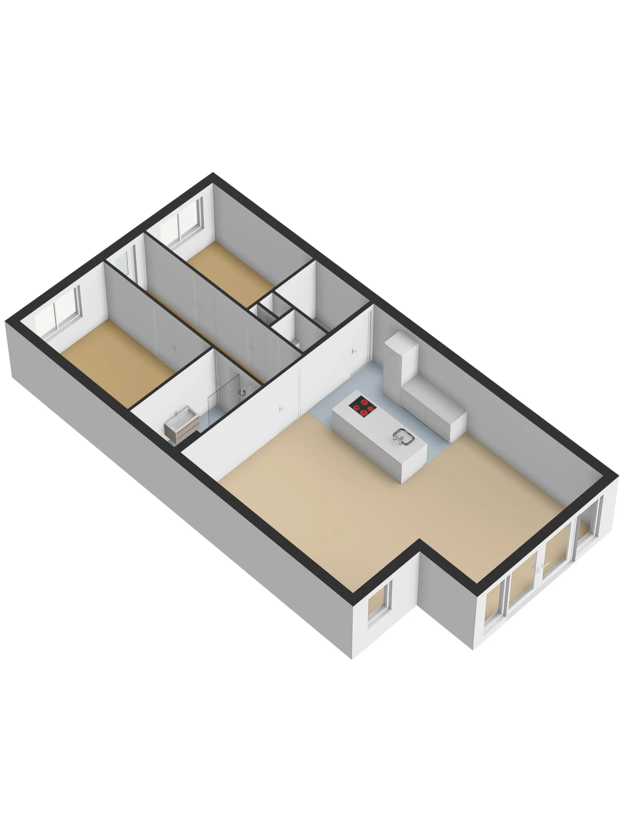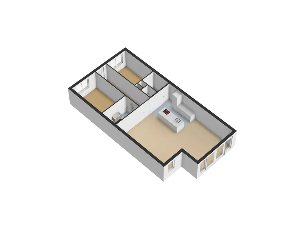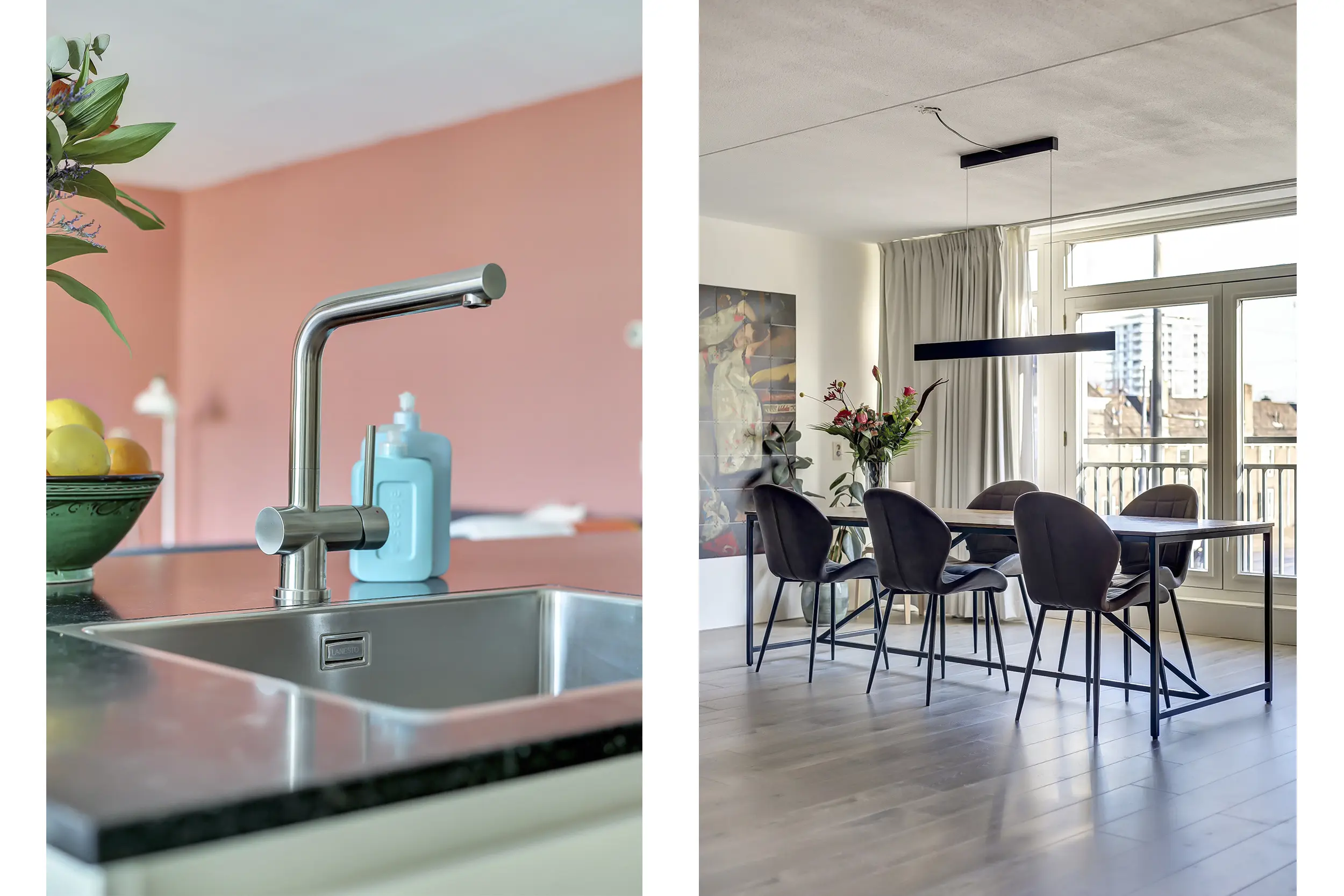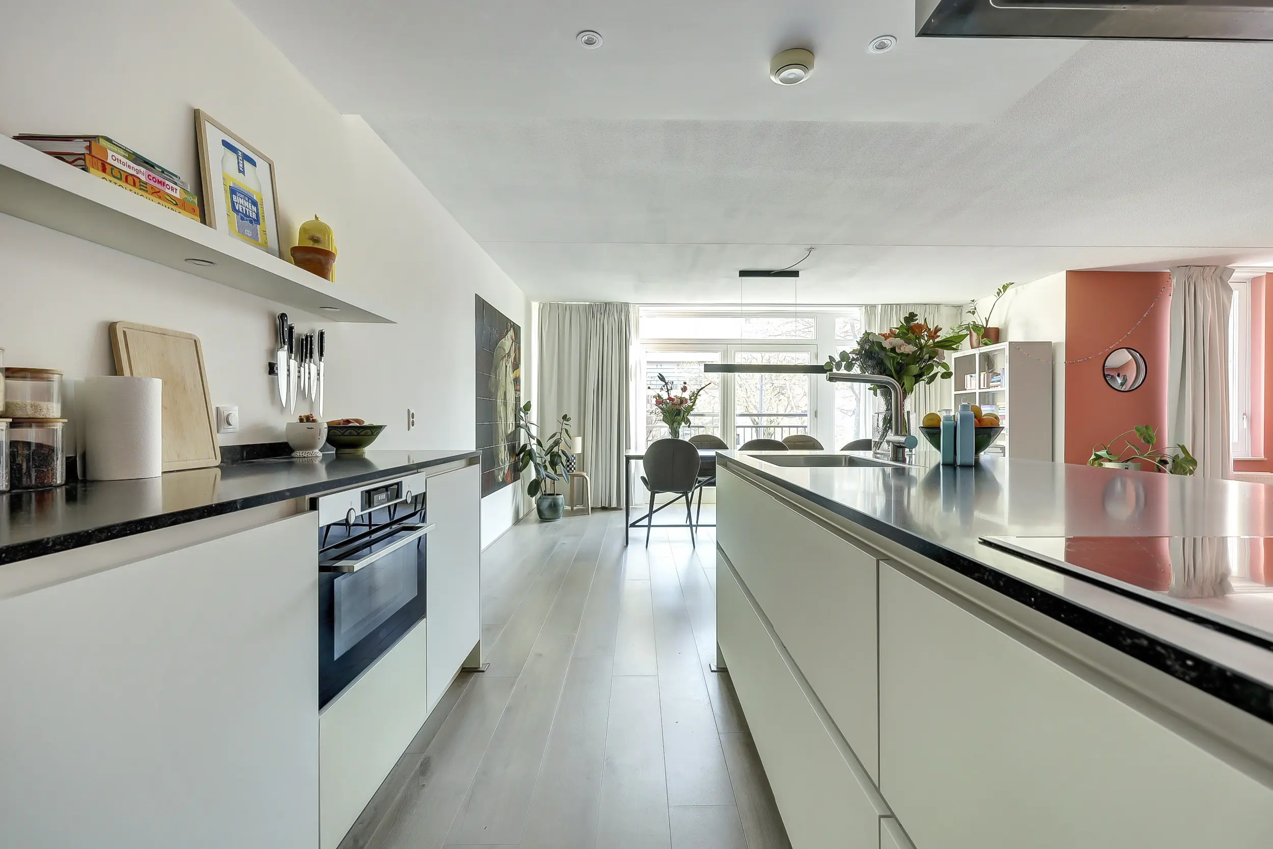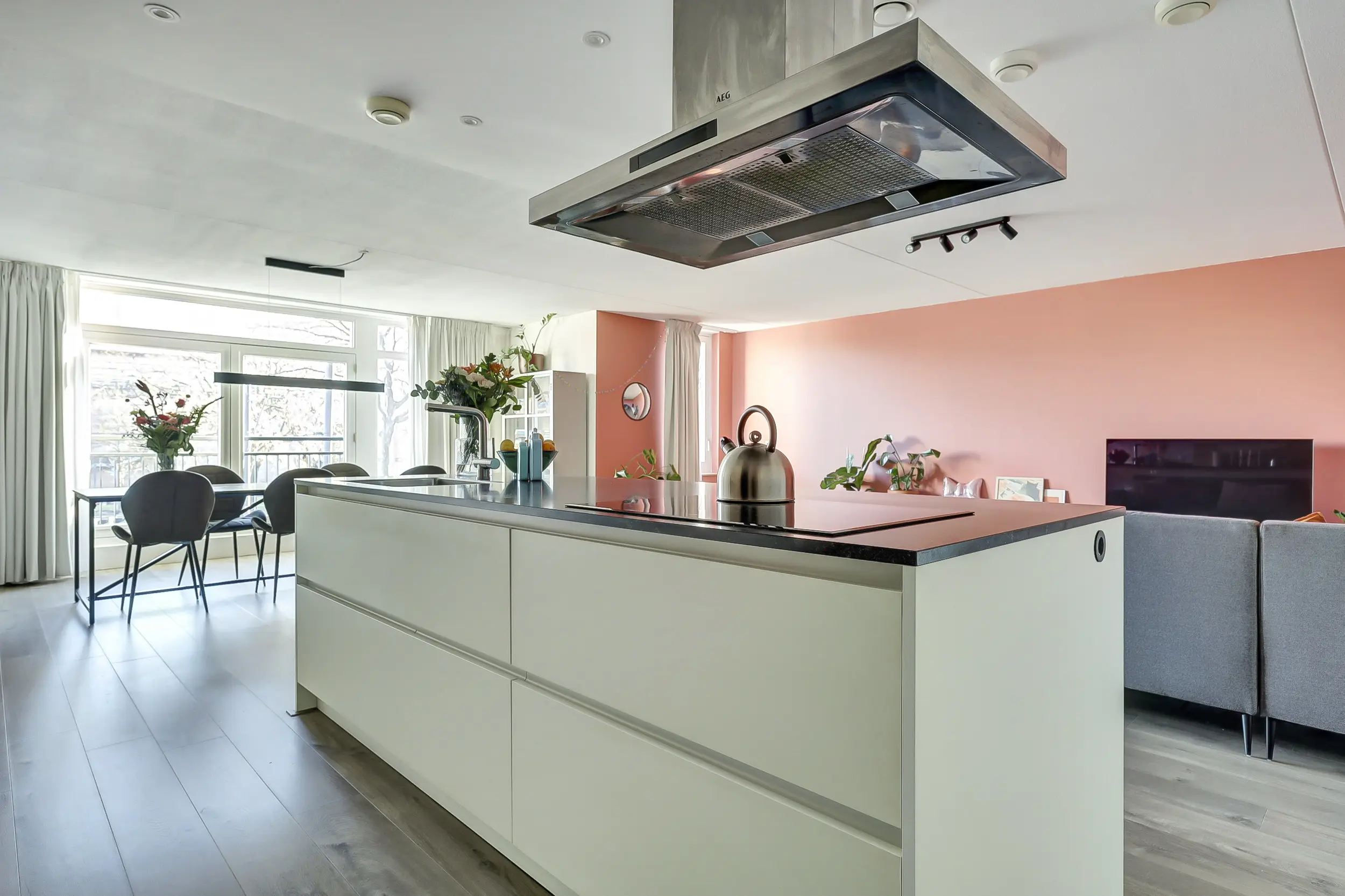 De riante woonkamer is licht en ruim opgezet, met een grote raampartij en openslaande deuren met Frans balkon. De open keuken vormt het hart van de woning en is modern uitgevoerd met een kookeiland voorzien van inductiekookplaat, afzuigkap en spoelbak. Daarnaast is er een ruim werkblad met oven, losse koel-vriescombinatie en volop bergruimte, perfect voor wie van koken en gezelligheid houdt.