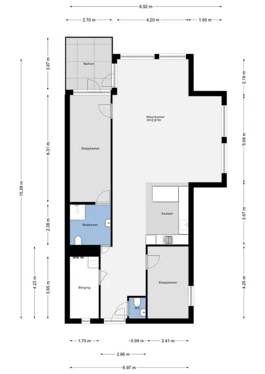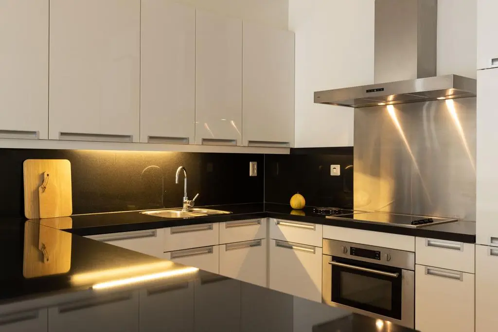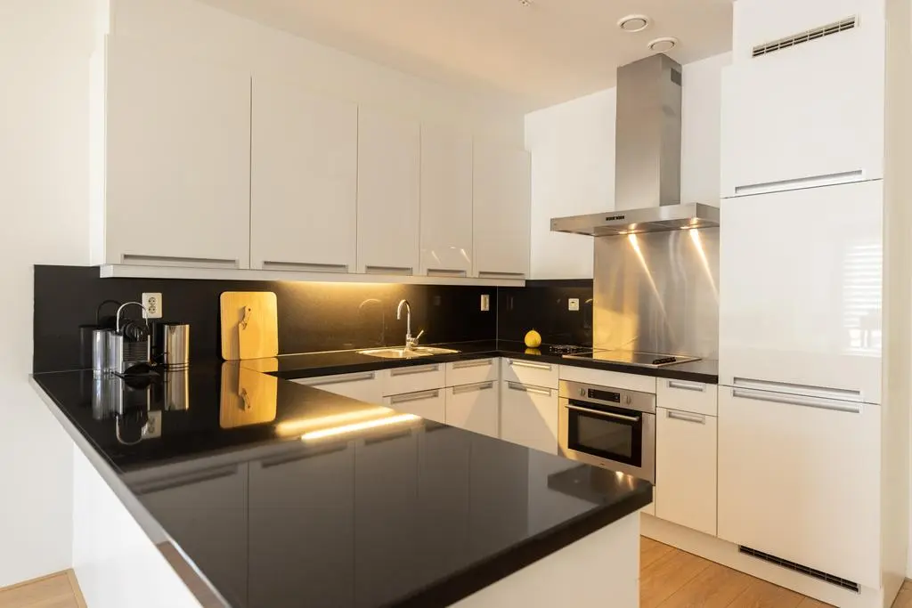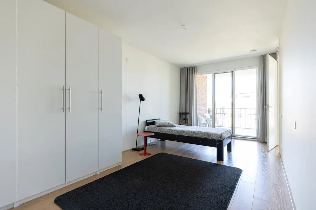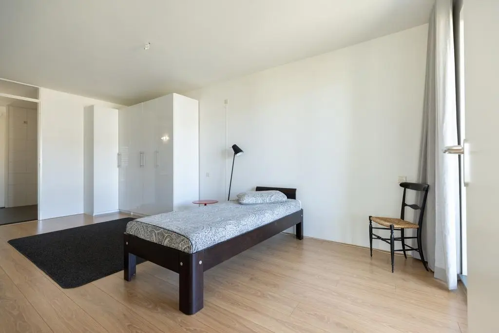 slaapkamer. De open inbouwkeuken met stenen blad met zitgedeelte heeft een