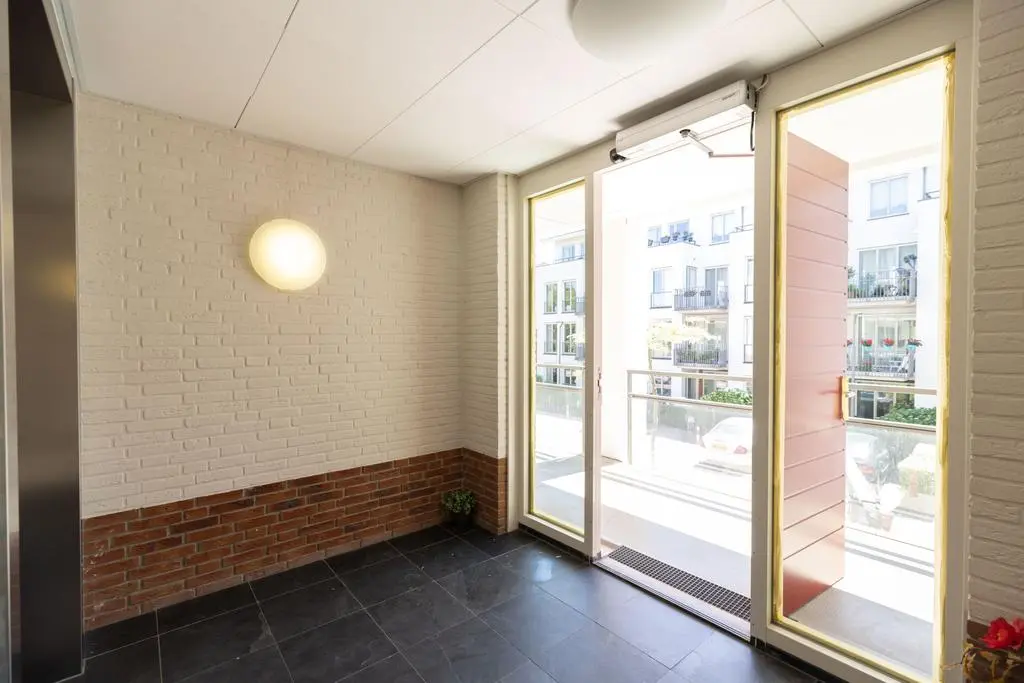 Afgesloten centrale hal met brievenbussen, lift en ruime trap, gezamenlijke fietsen
