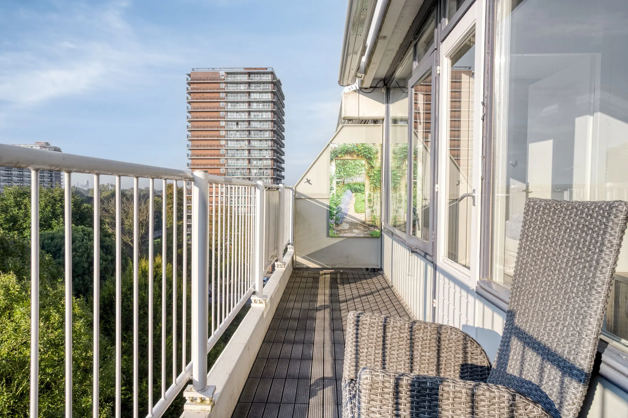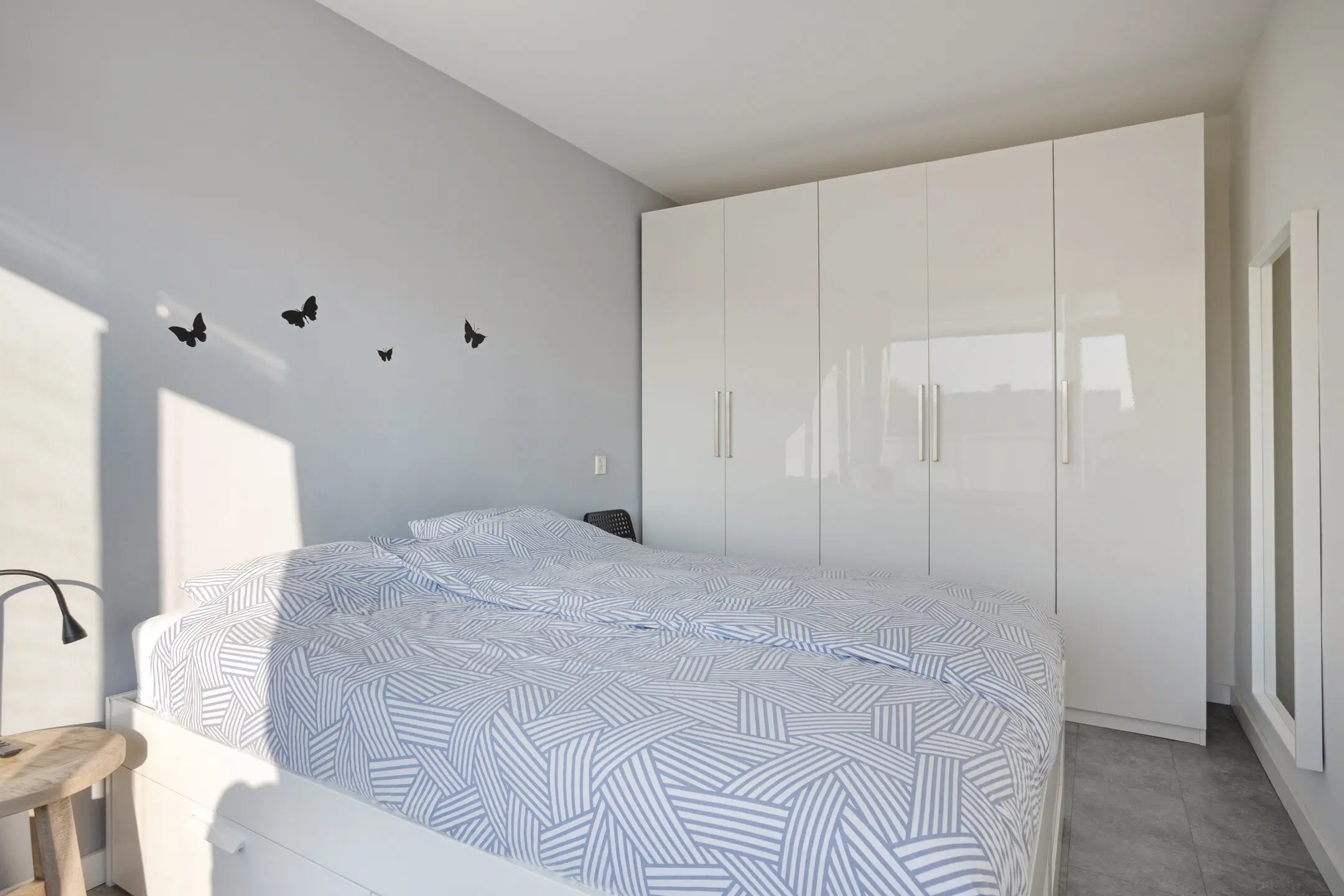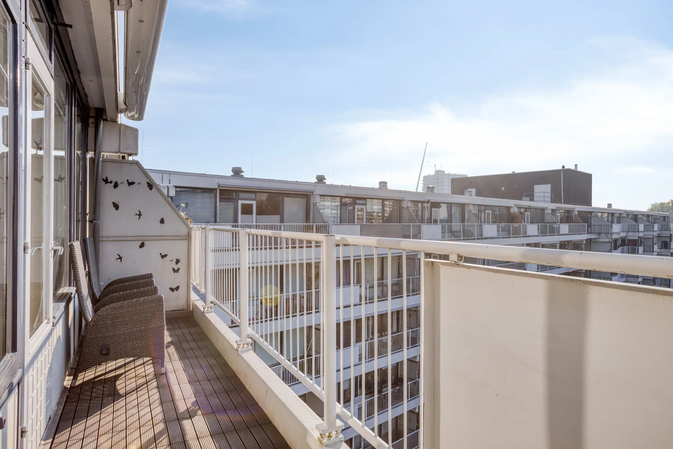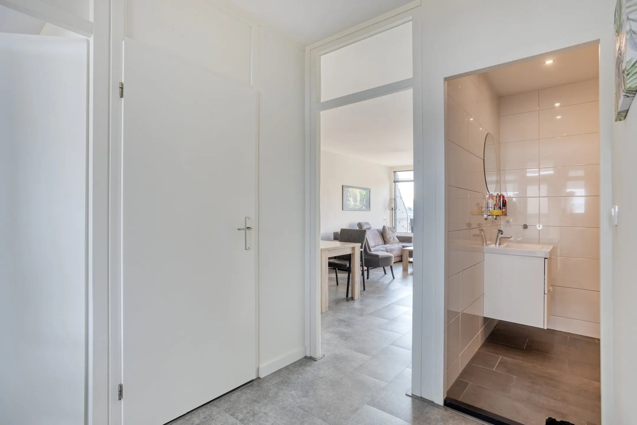 Galerij met toegang tot de woning. Bij binnenkomst kom je in de hal met intercom, meterkast en een deur met glas die toegang biedt tot de tussenhal. Vanuit de tussenhal bereik je alle vertrekken. De eerste slaapkamer bevindt zich aan de voorzijde van de woning. Hiernaast is er een praktische inpandige berging/inloopkast die volop opbergruimte biedt.