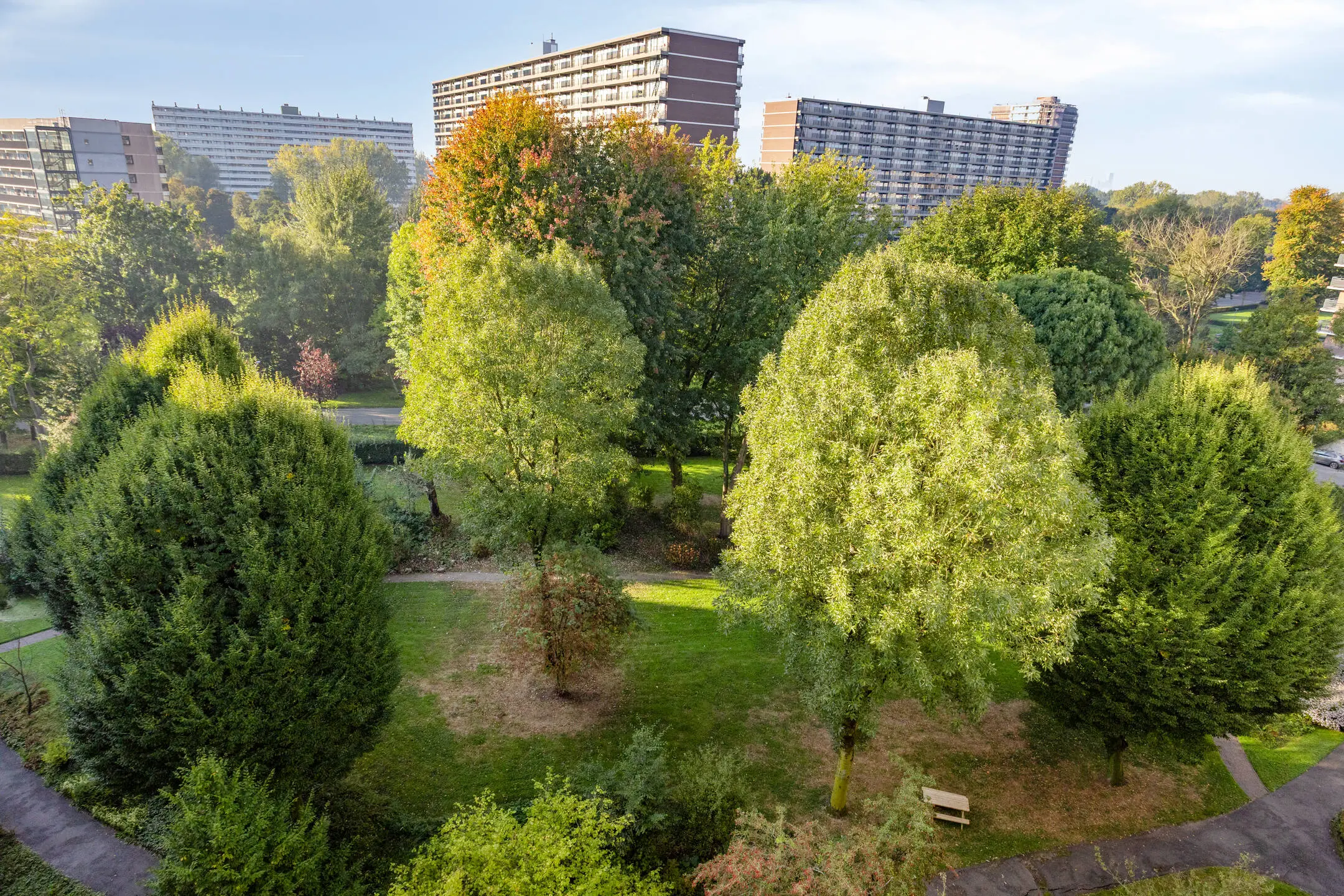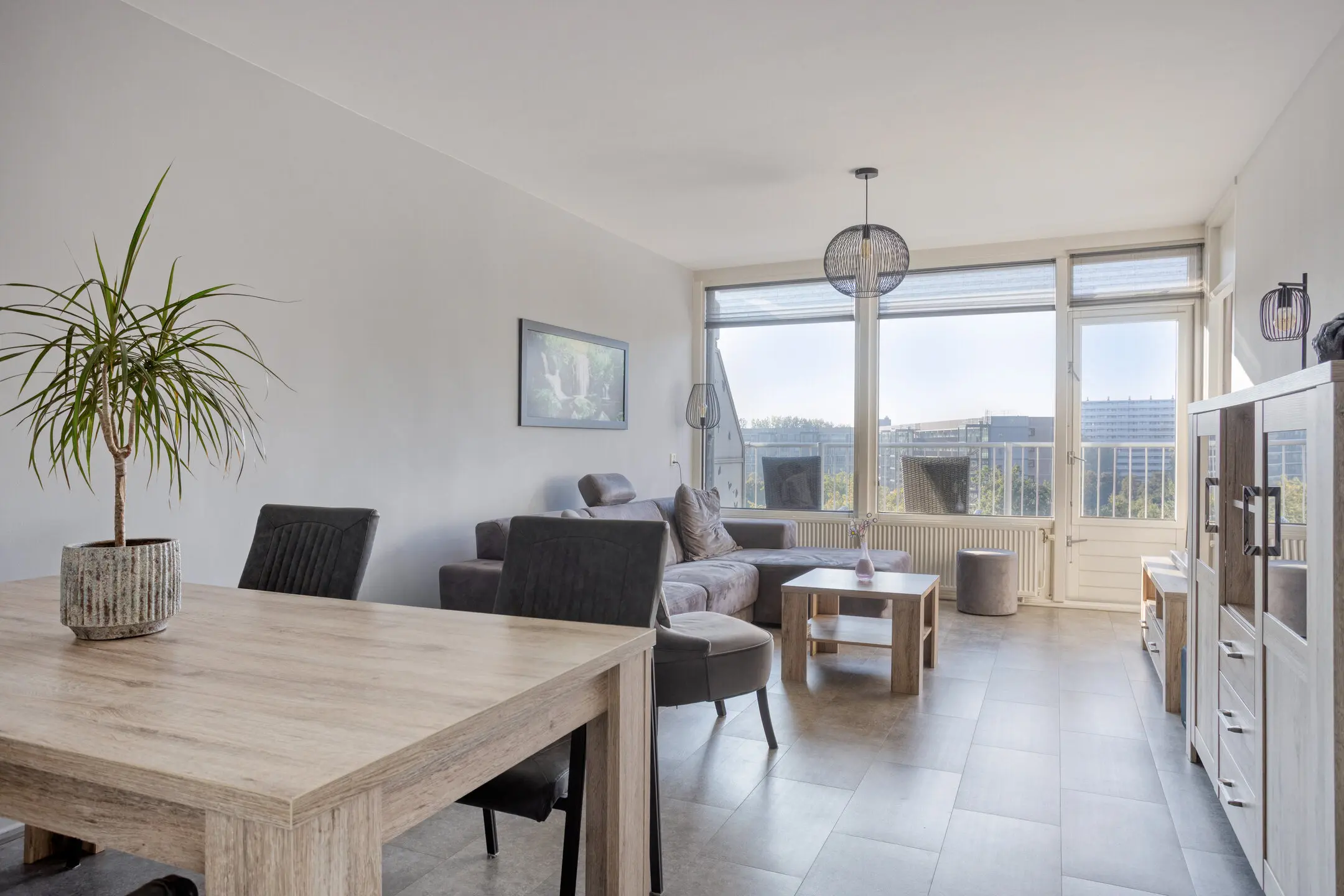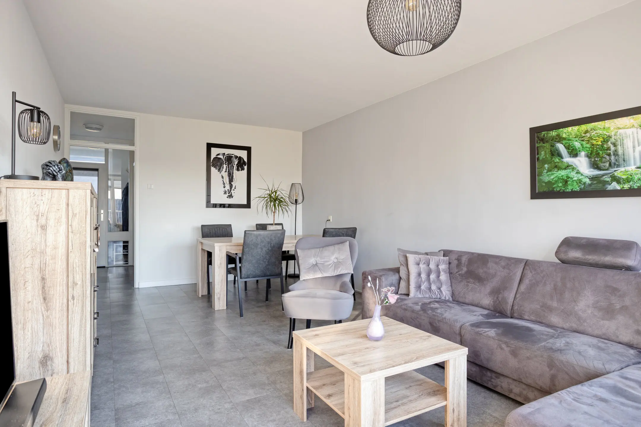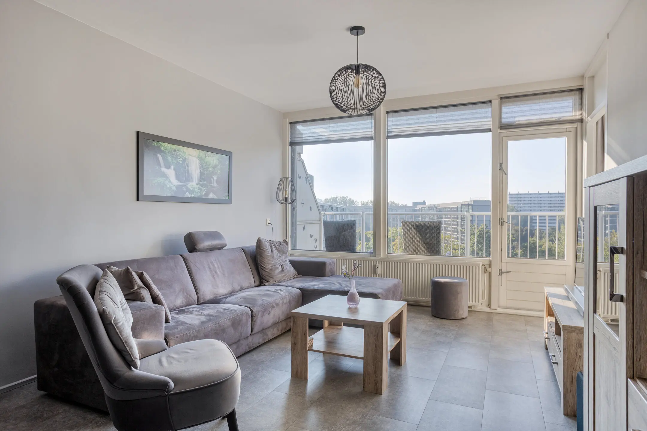 De ruime woonkamer is gelegen aan de achterzijde en is erg licht door de grote raampartij met deur naar het zonnige balkon dat gunstig op het zuid/zuidoosten is gelegen. Hier kun je genieten van de zon en de rust, terwijl je uitkijkt over het aangrenzende parkje. De (rood/wit/grijs gestreepte) zonneschermen met elektrische bediening zorgen ervoor dat de warmte buiten blijft. De tweede slaapkamer ligt aan achterzijde van het appartement. De volledig betegelde badkamer is uitgerust met een douche, wandcloset, wastafelmeubel en de aansluitingen voor de wasmachine en droger. Aan de voorzijde van de woning bevindt zich de open keuken. Deze is geplaatst in L-opstelling en is uitgerust met een gasfornuis met wokbrander, RVS afzuigkap (recirculatie), vaatwasmachine, koel-/vriescombinatie (2021), oven (2021) en spoelbak onder het raam. Het appartement is m.u.v. de natte ruimtes voorzien van grijze PVC tegels welke drempelloos zijn doorgelegd.