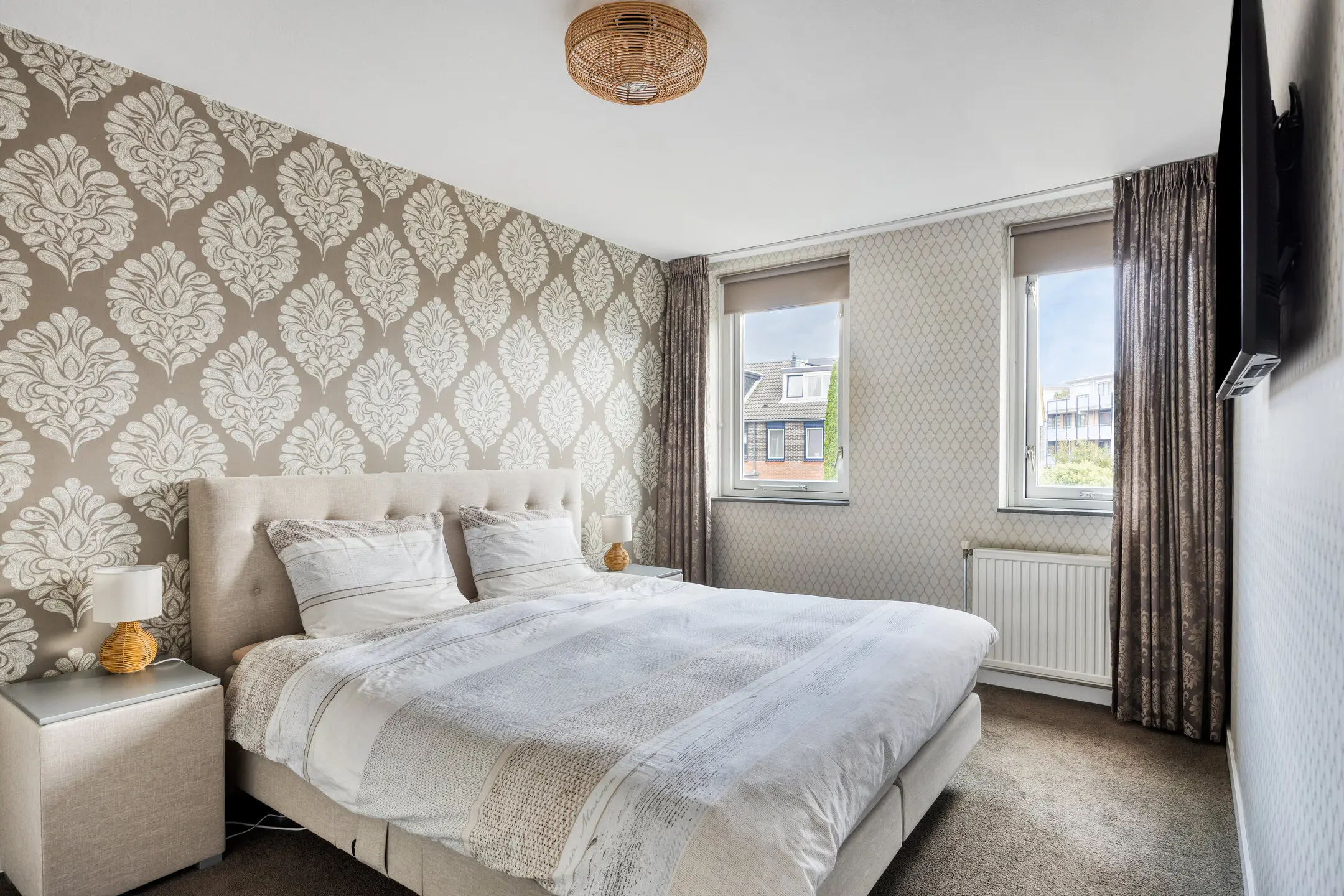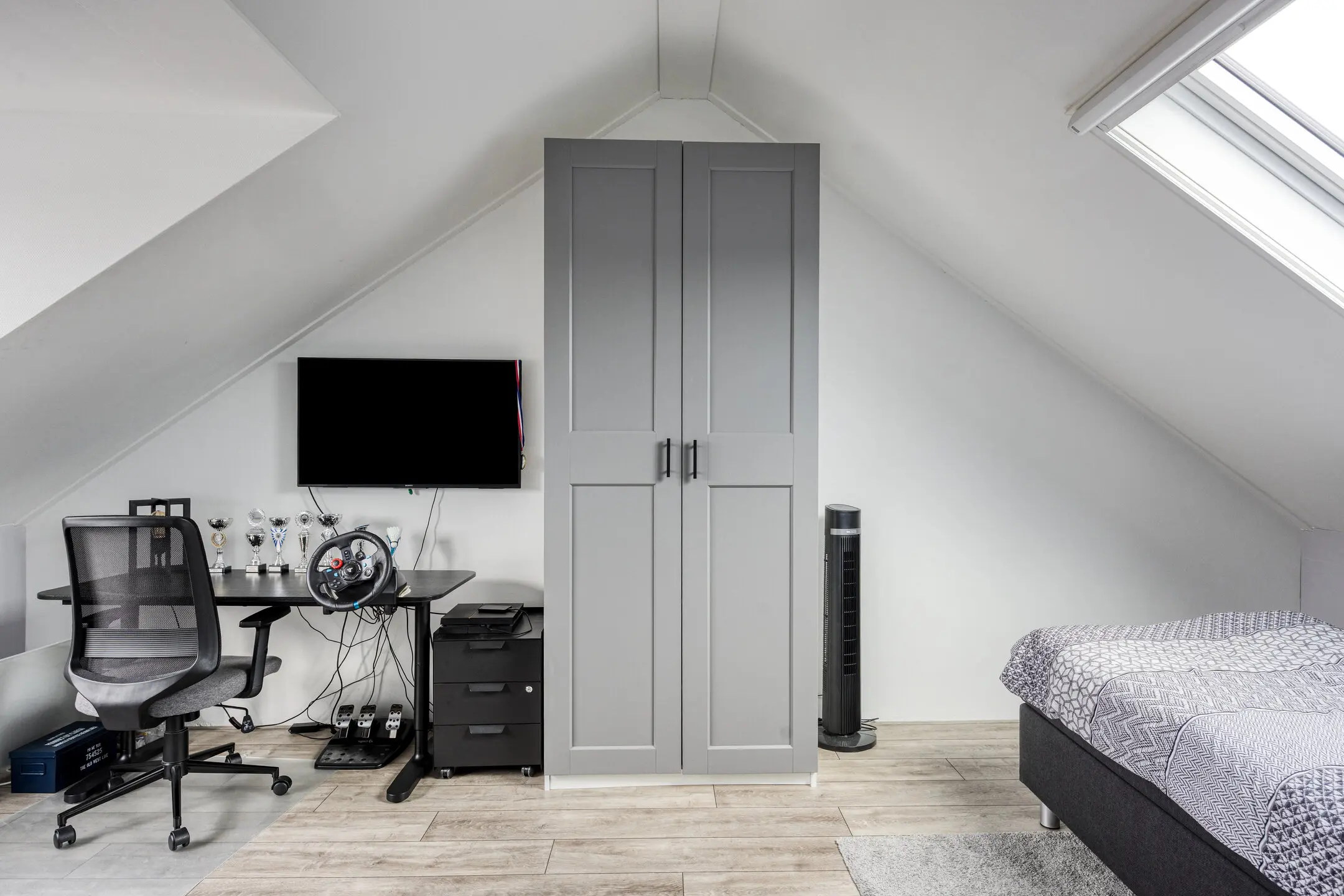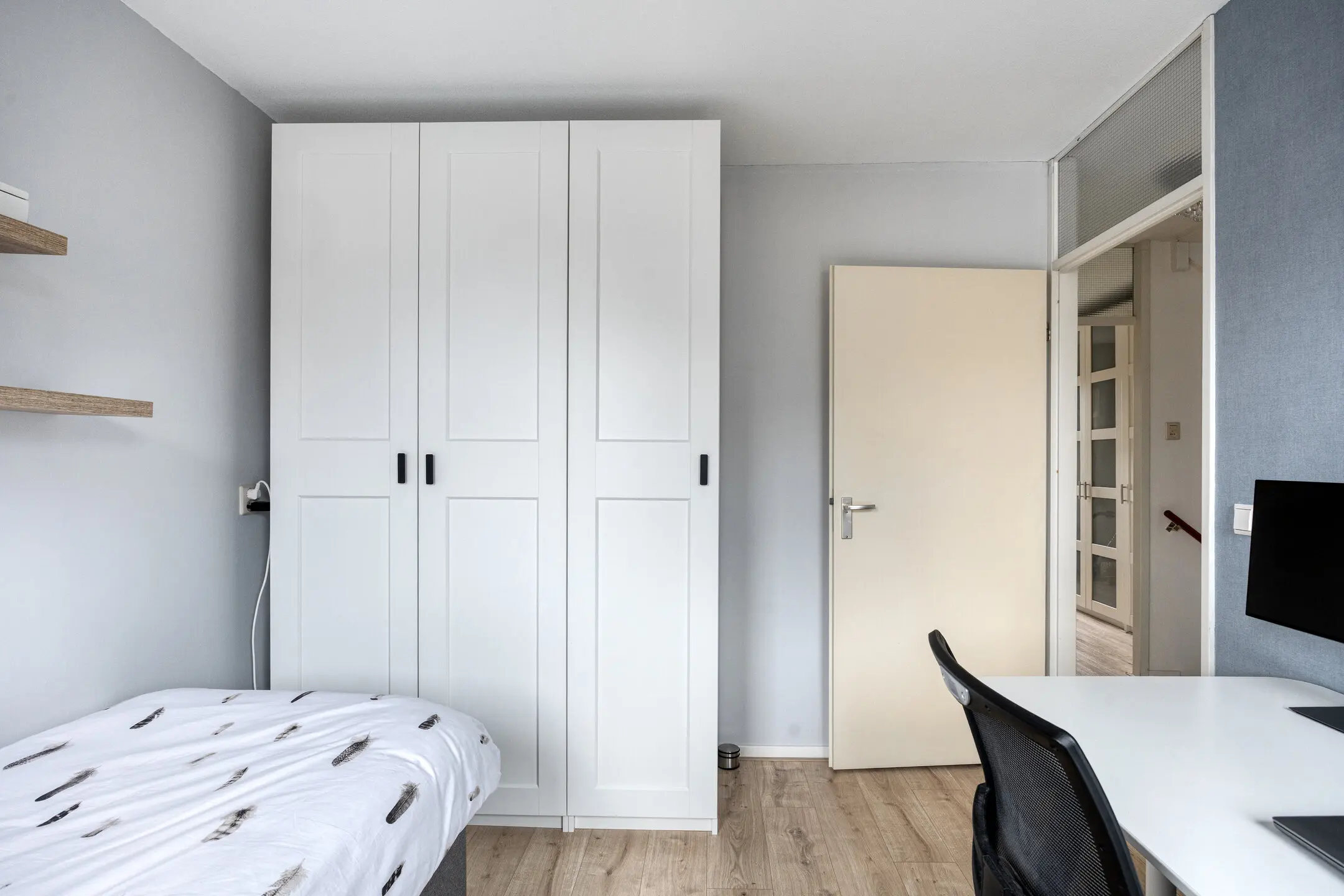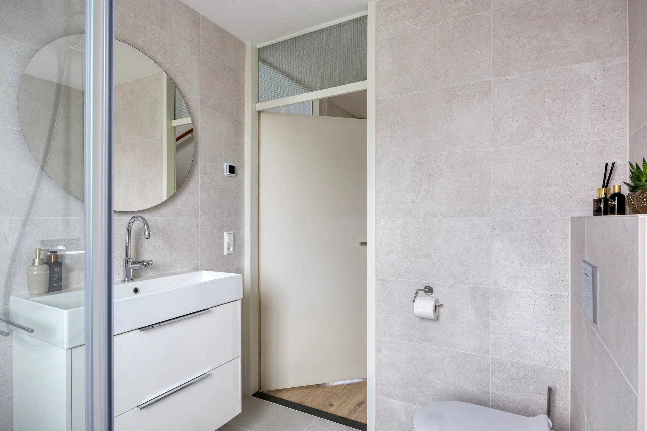 Overloop met toegang tot de vertrekken. Twee slaapkamers van een fijn formaat aan de achterzijde van het huis. Slaapkamer drie ligt aan de voorzijde van de woning. De badkamer is de eyecatcher van deze verdieping; deze is in maart 2025 vernieuwd en uitgevoerd in een neutrale lichte kleurstelling. Hier zijn een inloopdouche, wandcloset, design radiator, wastafelmeubel en ronde spiegel aanwezig. Onder de vloertegels ligt elektrische vloerverwarming. Prettig is het raam dat open kan zodat er naast de mechanische ventilatie ook op een natuurlijke manier geventileerd kan worden.