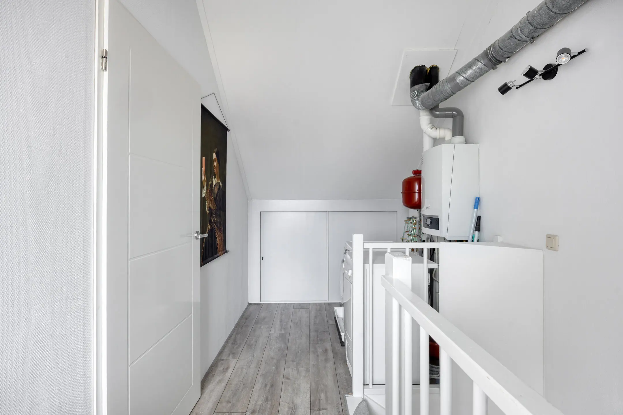 Voorzolder met de C.V.-combiketel, de mechanische ventilatie unit en de aansluitingen voor de wasmachine en droger. Ruime zolderkamer welke prettig licht is door de dakkapel aan de voor- en het dakraam aan de achterzijde. Op de vloer ligt laminaat en achter de knieschotten op deze verdieping is er veel praktische bergruimte.