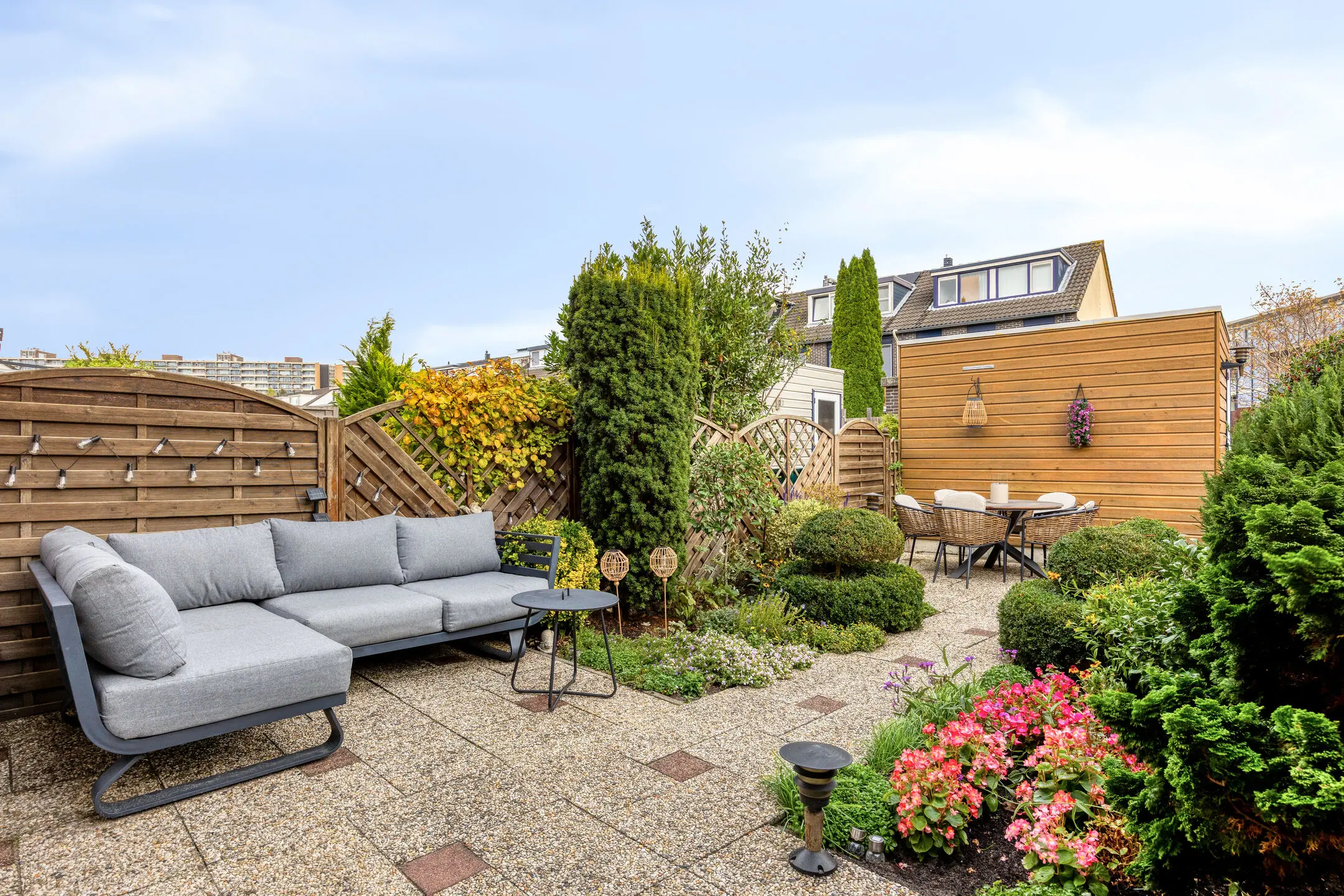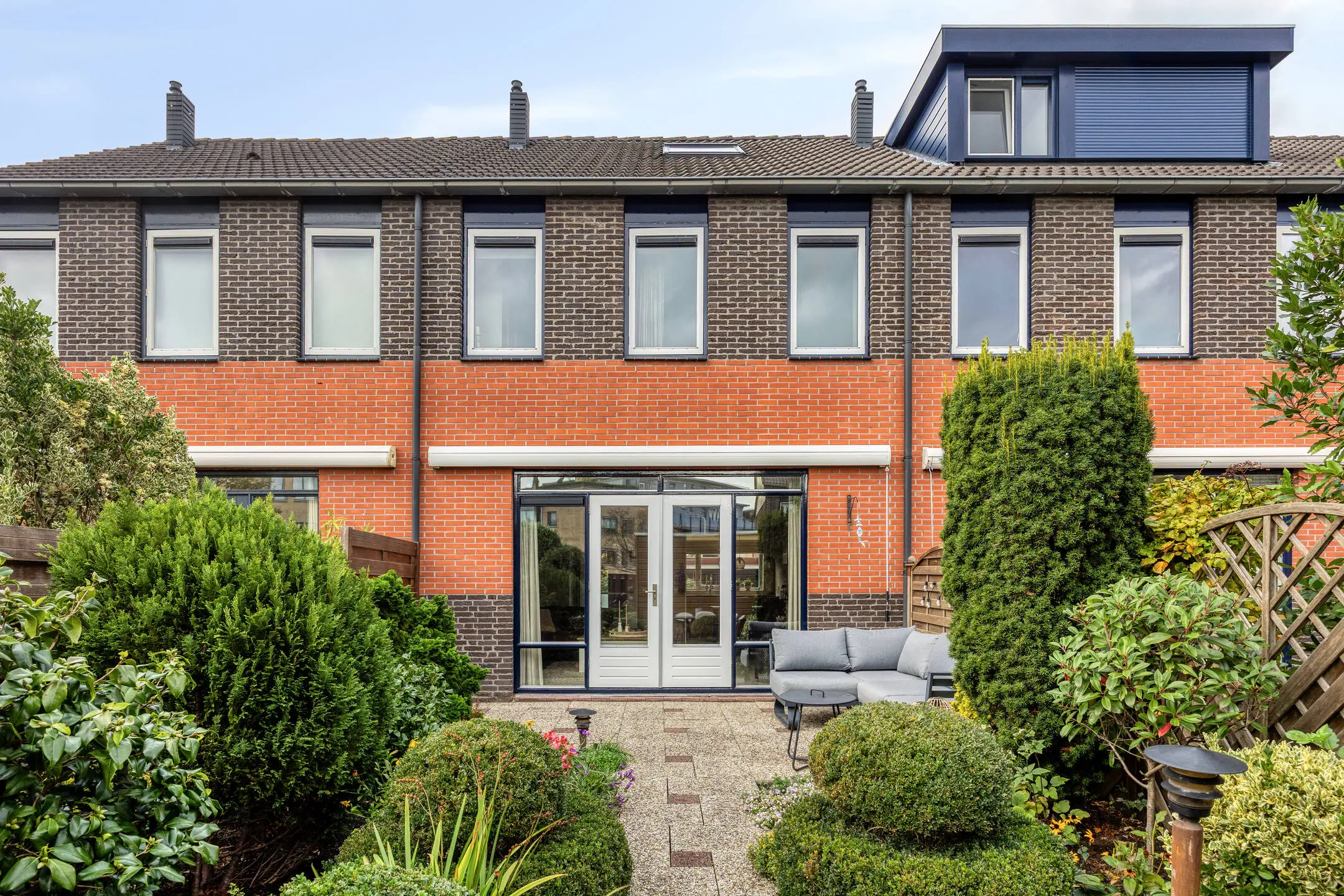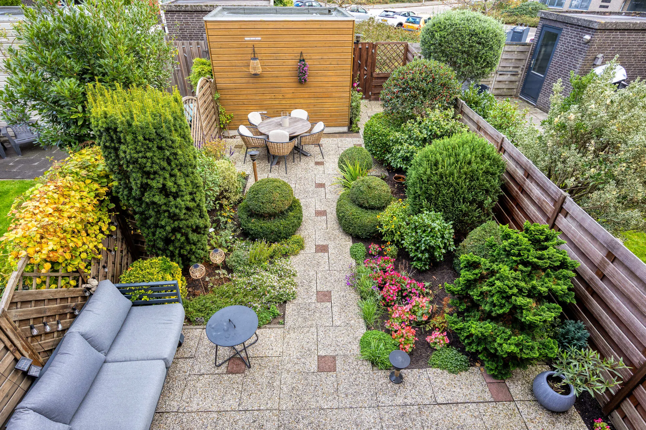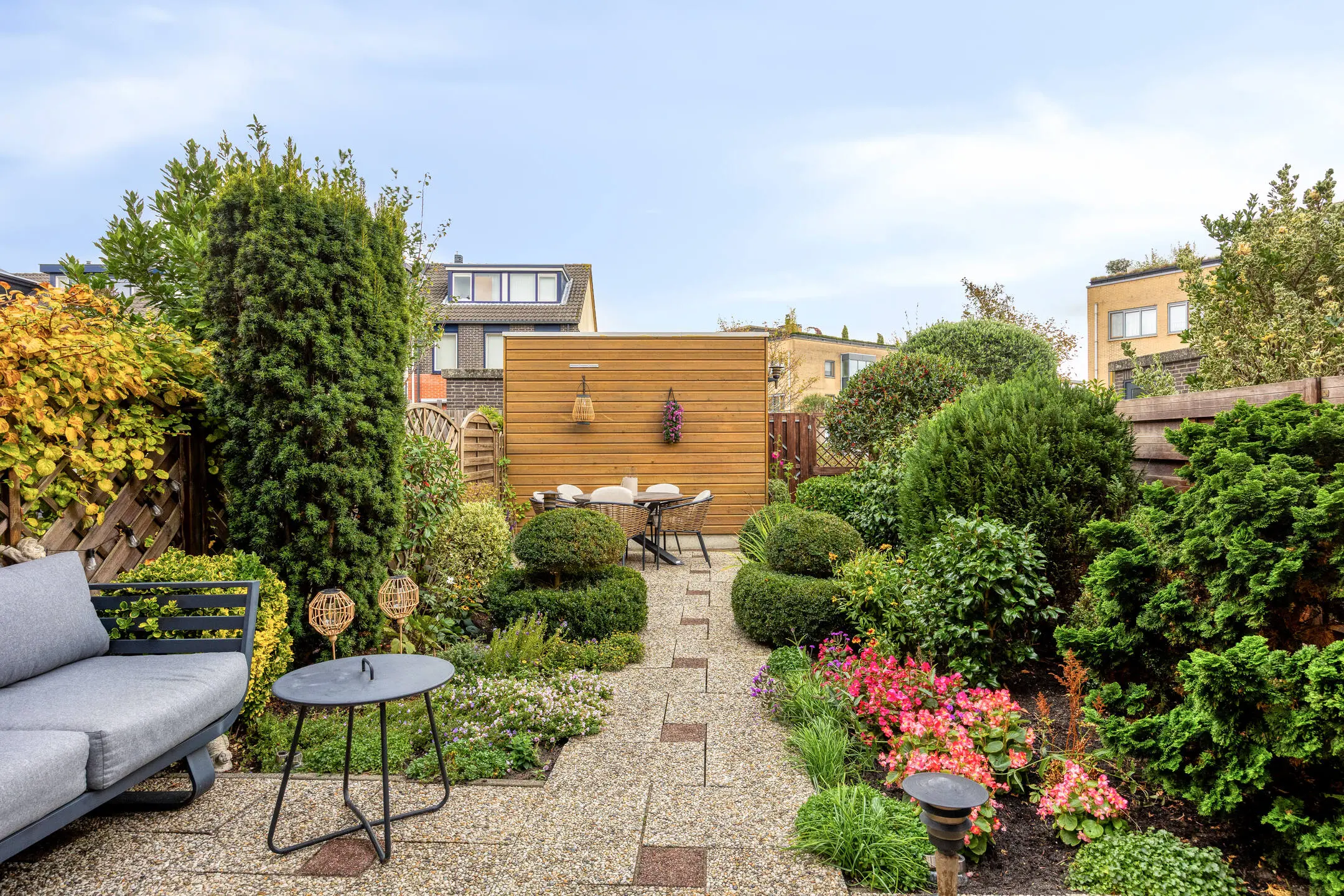 Op het noordwesten gelegen voortuin met buitenkraan en vaste beplanting. De verzorgde achtertuin heeft eveneens een buitenkraan en is bereikbaar vanuit de woonkamer en via de achterpoort. De achtertuin ligt op het zuidoosten en is eveneens aangelegd met vaste beplanting en er is een berging aanwezig met elektra. Het gestreepte zonnescherm (handmatige bediening) houdt de zon uit de woonkamer.