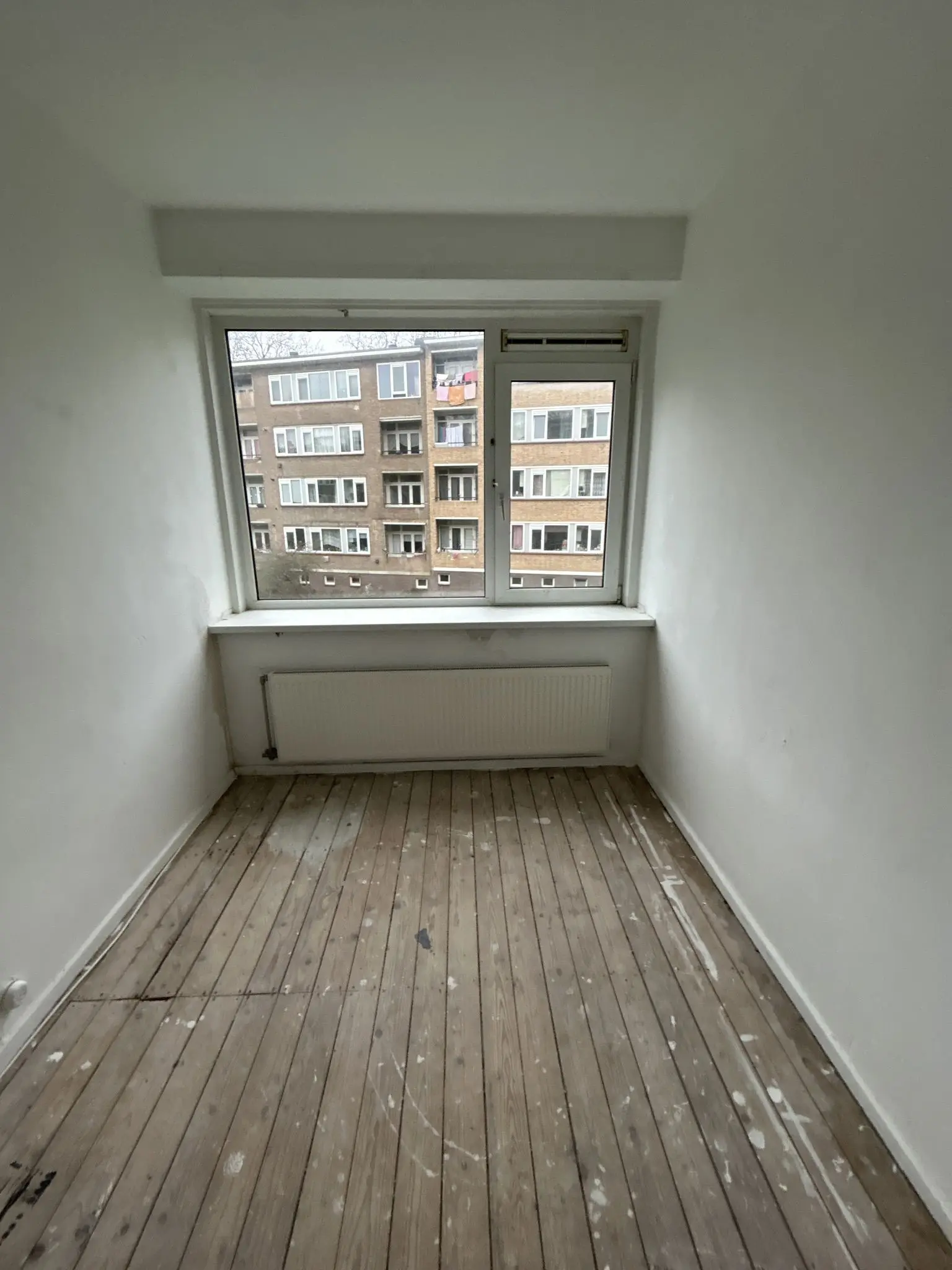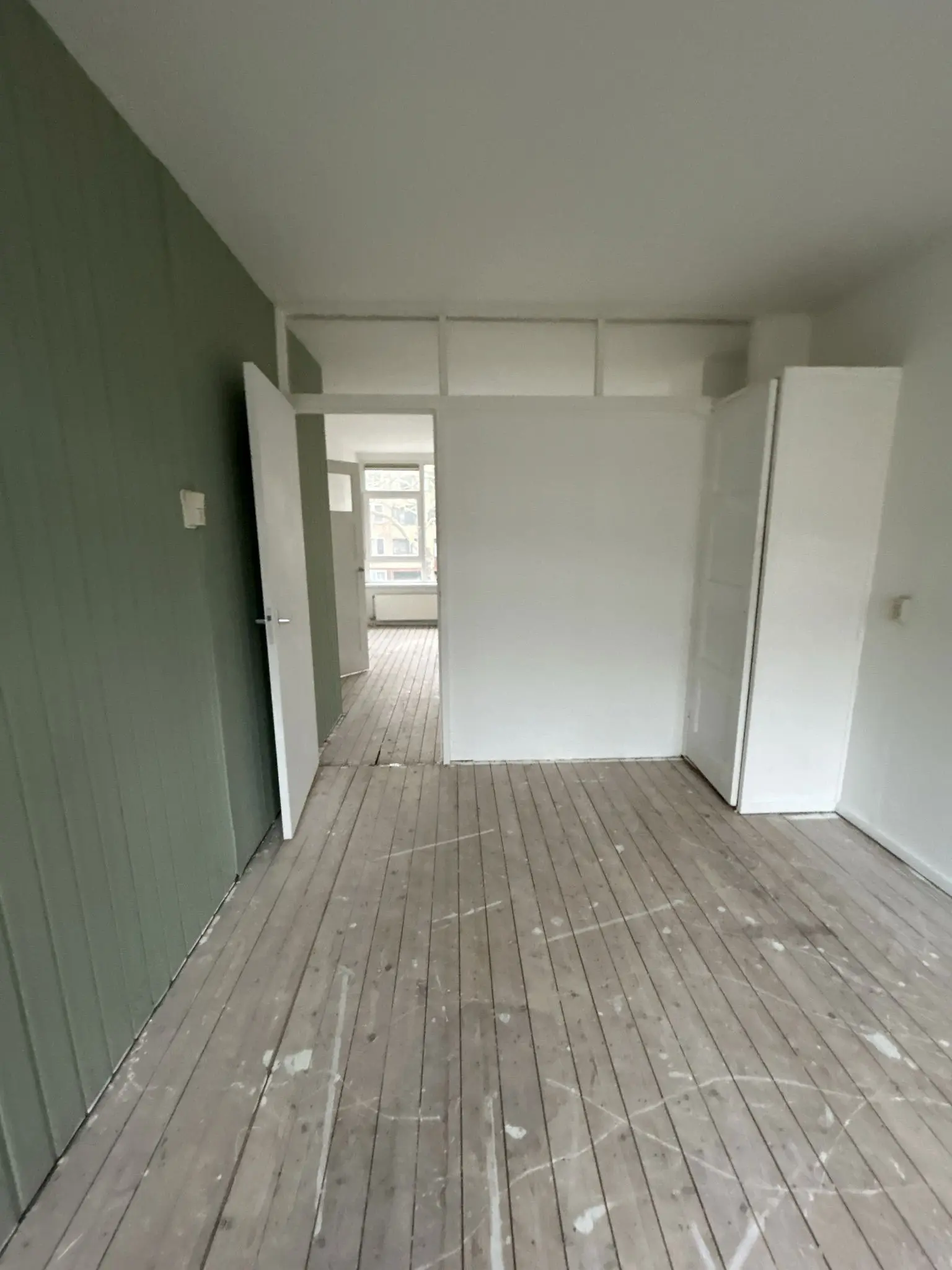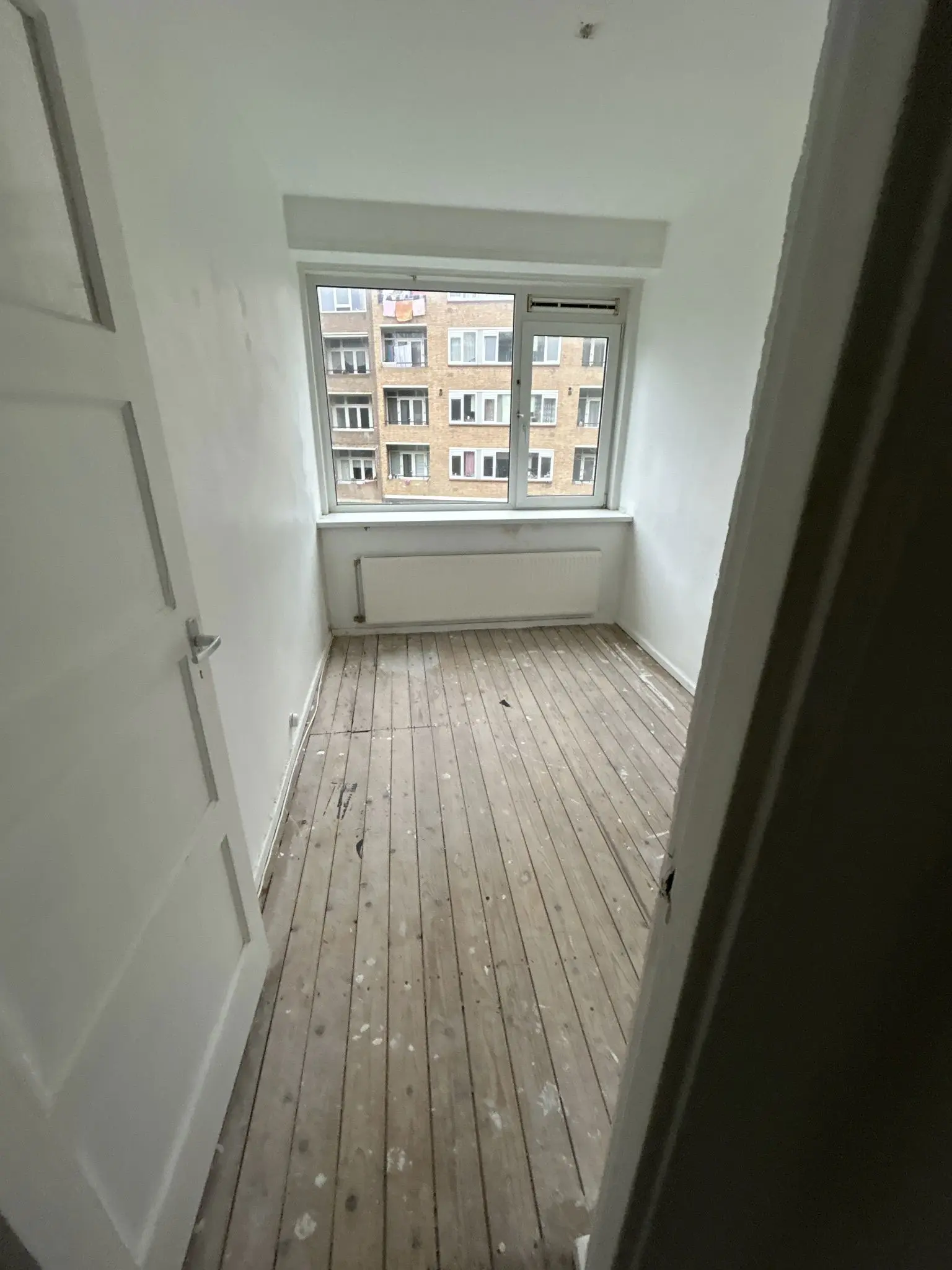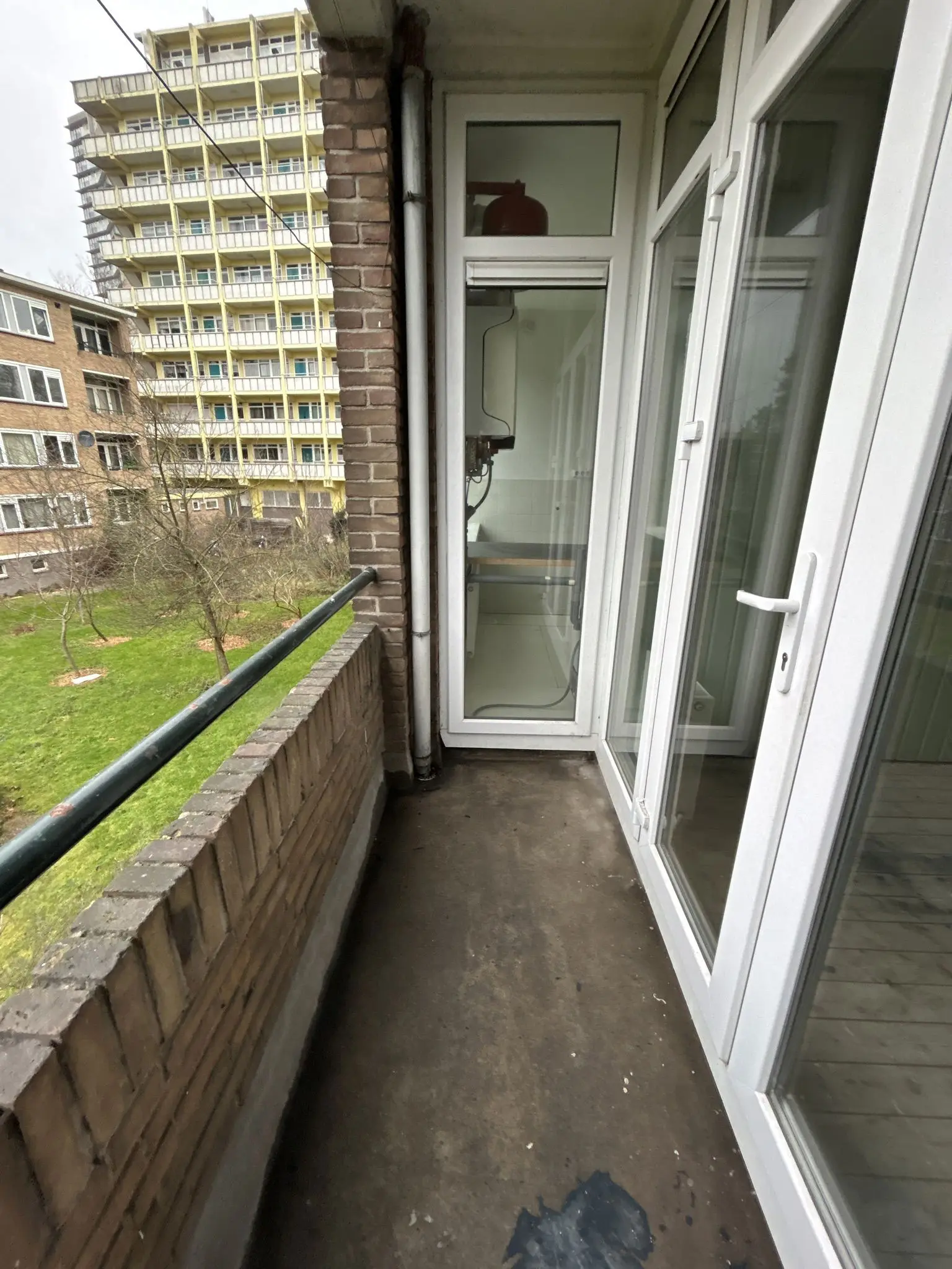 Vanuit het portiek komt u via de voordeur de woning binnen. Via de gang treft u de verschillende vertrekken. Aan de voorzijde van de woning treft u de woonkamer met veel lichtinval en een vaste kast. Daarnaast is er een grote slaapkamer die toegang heeft tot het balkon.