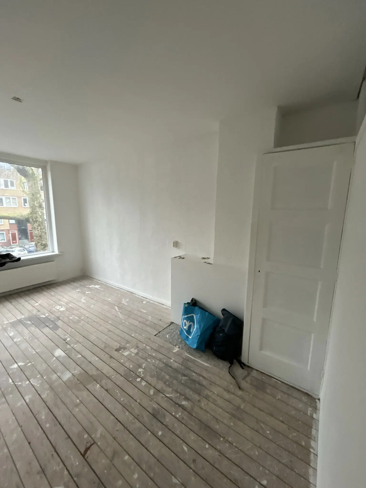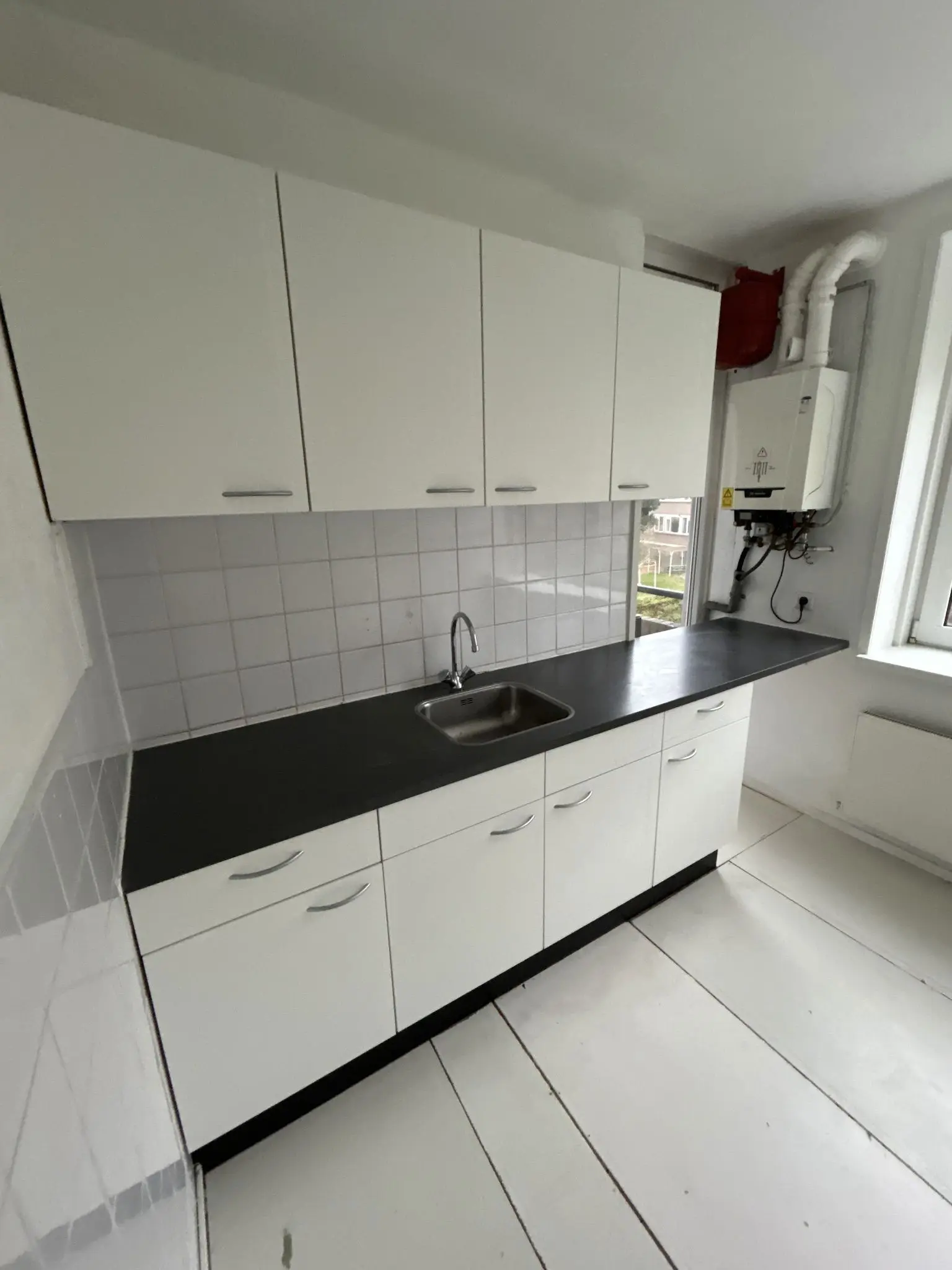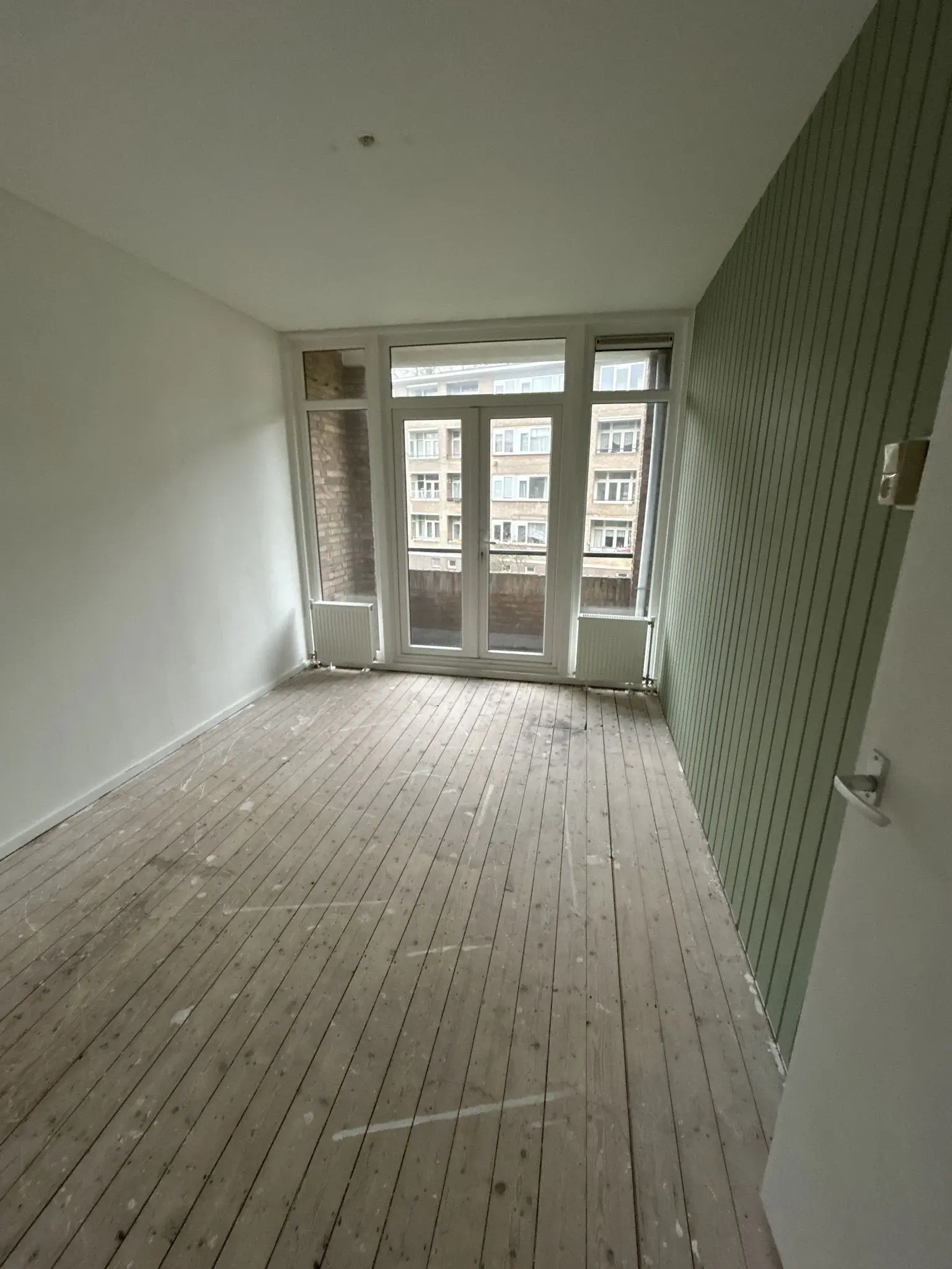 Vanuit het portiek komt u via de voordeur de woning binnen. Via de gang treft u de verschillende vertrekken. Aan de voorzijde van de woning treft u de woonkamer met veel lichtinval en een vaste kast. Daarnaast is er een grote slaapkamer die toegang heeft tot het balkon.