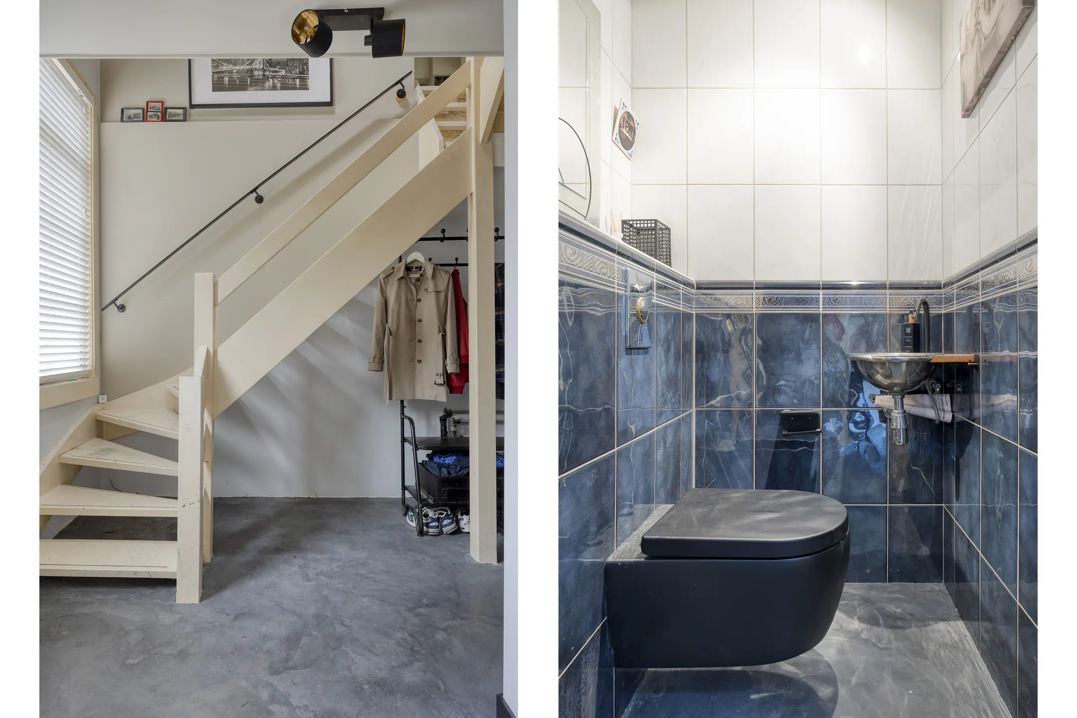 Via de entree/hal met trapopgang bereikt u de moderne toiletruimte met fonteintje.