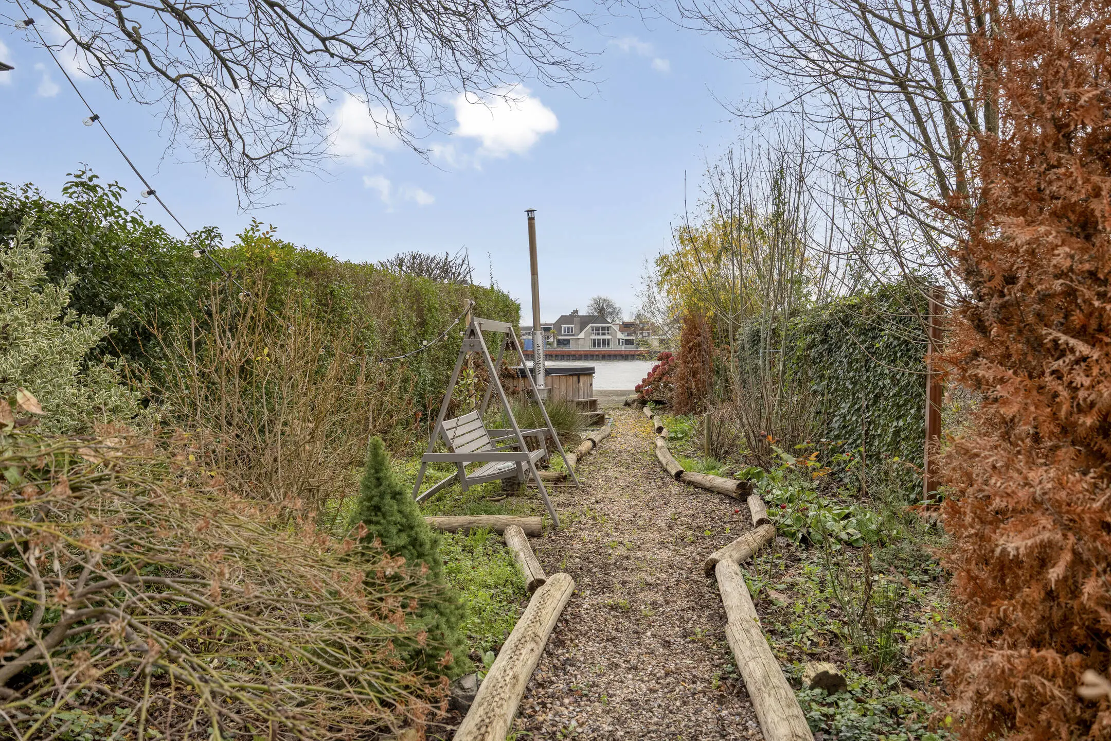 De achtertuin is een absoluut hoogtepunt: professioneel en royaal aangelegd, gelegen op het zuiden, voorzien van meerdere terrassen, een hottub (blijft achter) en directe toegang tot het water. Hier geniet u dagelijks van rust, privacy en een fenomenaal uitzicht. Het is zelfs mogelijk om een boot aan te leggen, mits voorzien van een bootlift.