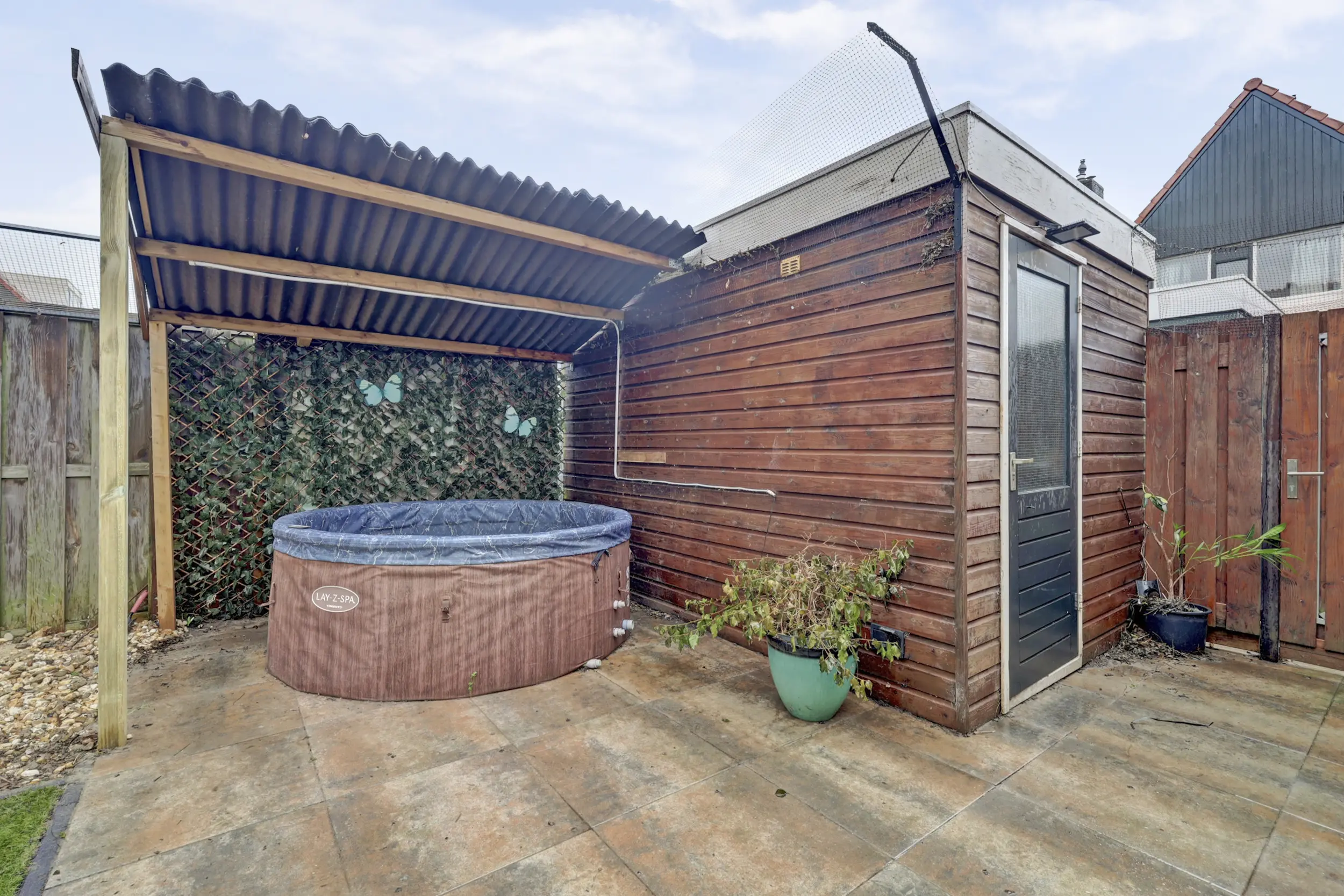 Achter de woning vind je een fijne tuin met borders, een terras en een houten berging. Aan de achtergevel is een zonwering aanwezig. Tevens kun je via de poort aan de achterzijde via het pad naar de openbare weg. In de directe omgeving is voldoende plaats om te parkeren. Aan de voorzijde is de tuin voorzien van bestrating.