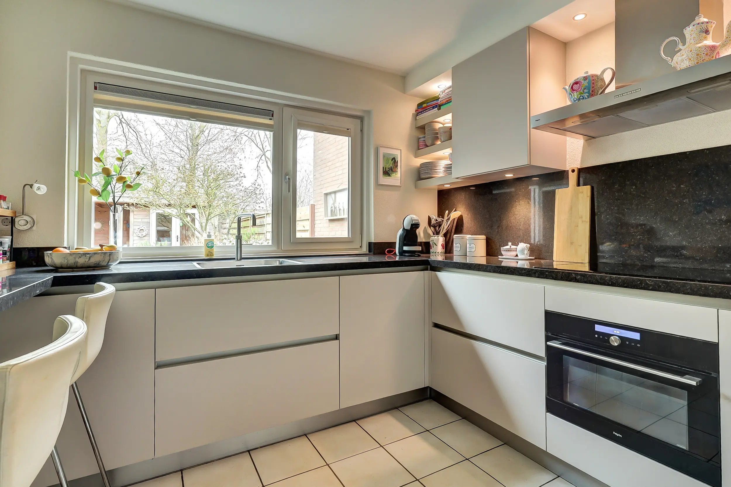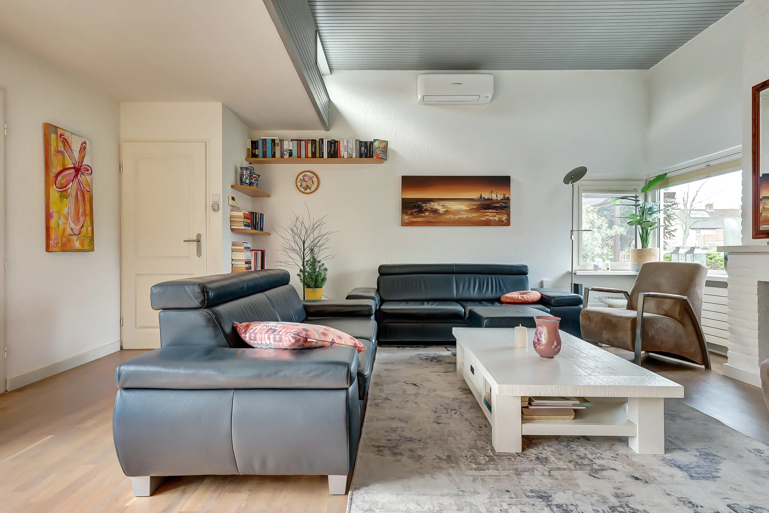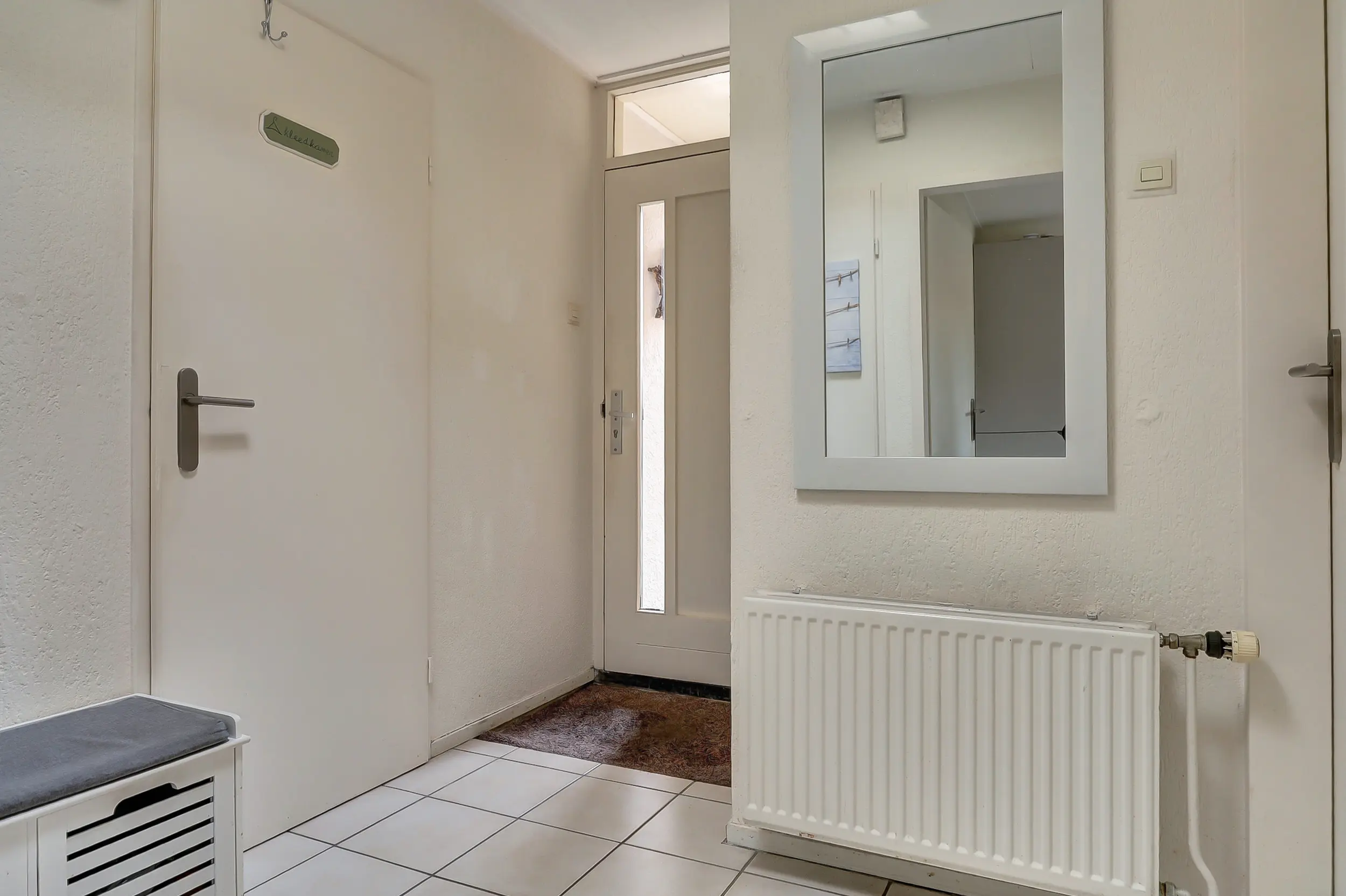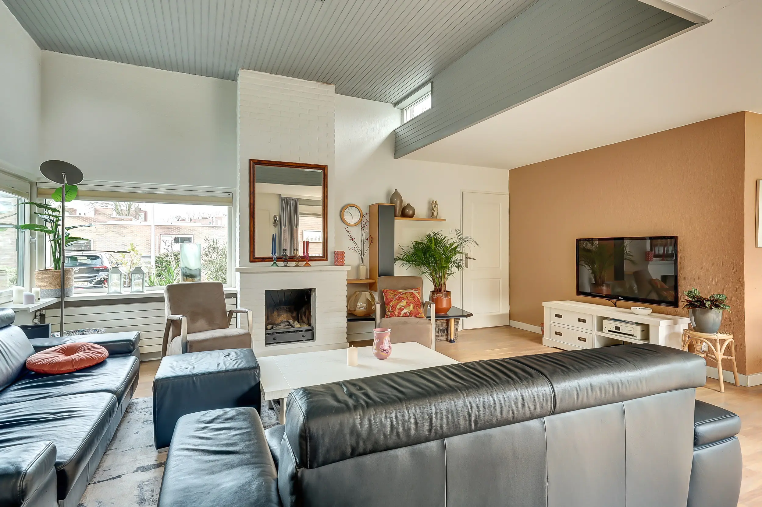 Entree met meterkast en moderne toiletruimte. De moderne greeploze keuken gelegen aan de tuinzijde is in een U-opstelling voorzien van inbouwapparatuur en een stenen werkblad. Ook is er een inbouwkast en een gezellige eetbar. Aangrenzend een praktische bijkeuken met daarin de CV-ketel (2003 Nefit) en wasmachine- en drogeraansluiting. Vanuit de hal en bijkeuken is de (werk) kamer toegankelijk. De sfeervolle lichte woonkamer is centraal in de woning gelegen. Door de uitbreiding aan de tuinzijde is de kamer ruim en licht. De gashaard geeft extra sfeer aan de woonkamer. Verder heeft de woonkamer een airconditioning en een nieuwe schuifpui. De gang geeft toegang tot vier slaapkamers en de badkamer. De badkamer is voorzien van een ligbad, losse douche, een wastafelmeubel en 2e toilet. Een van de slaapkamers is voorzien van een airconditioning en een tuindeur.
