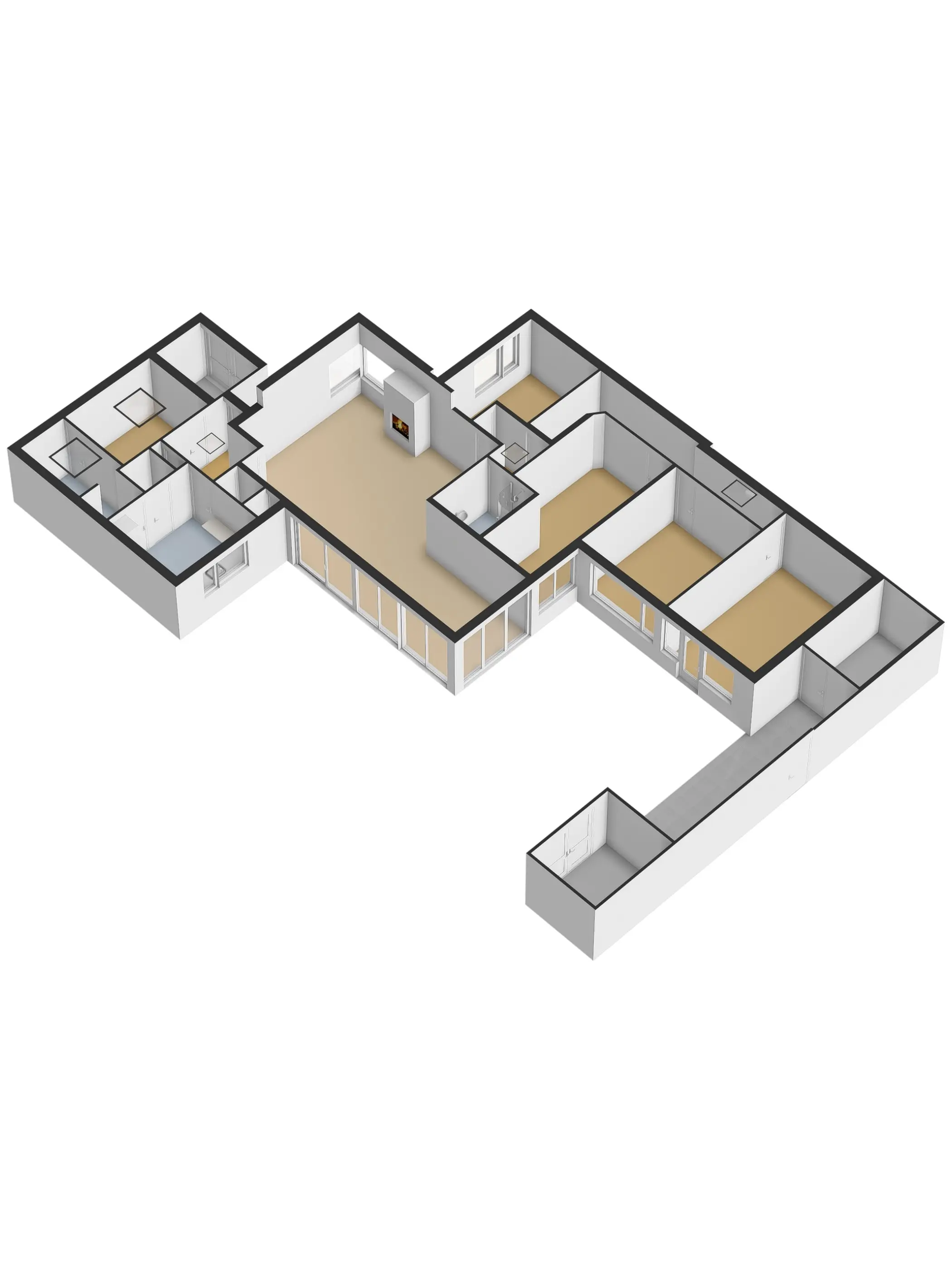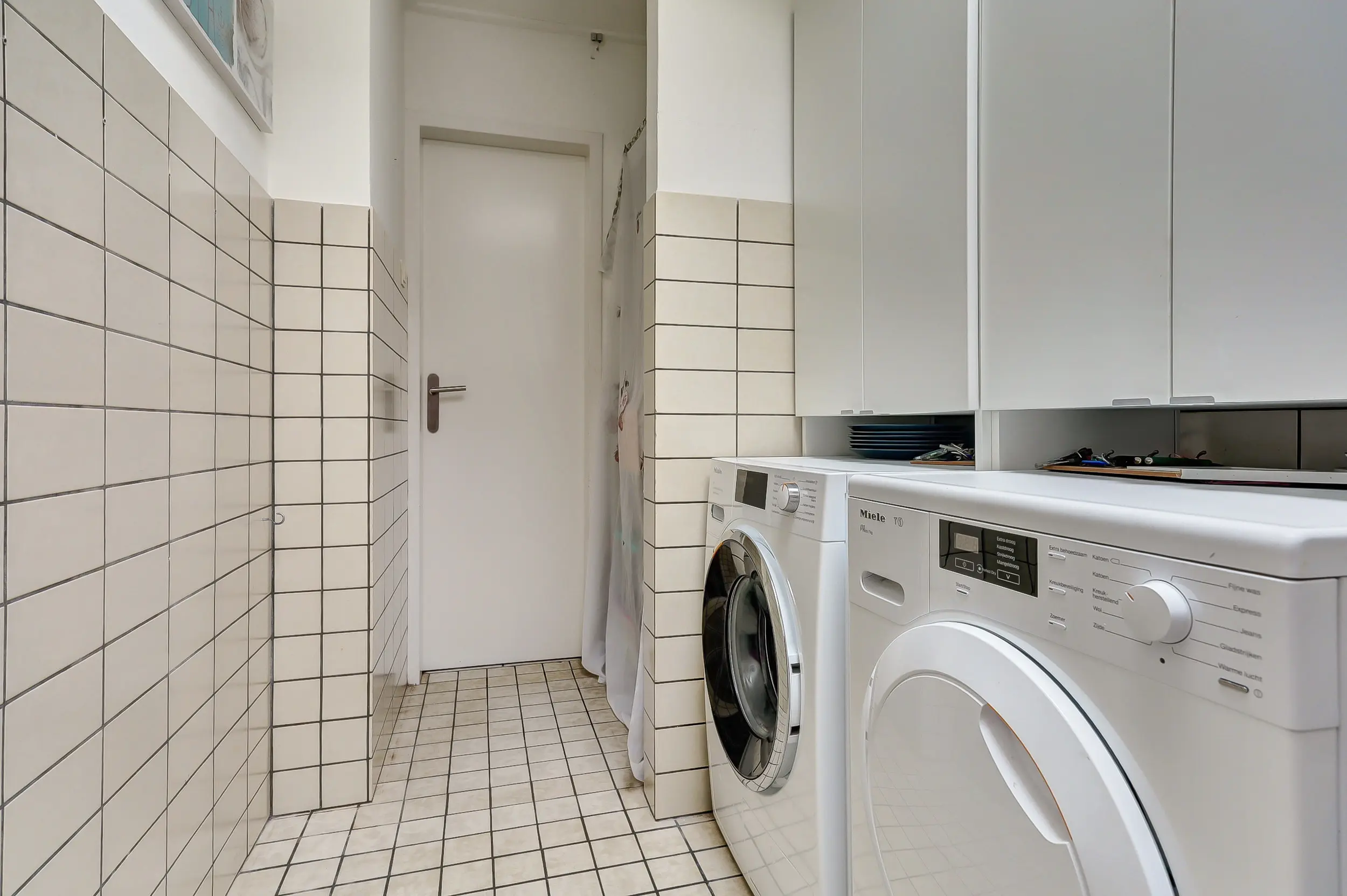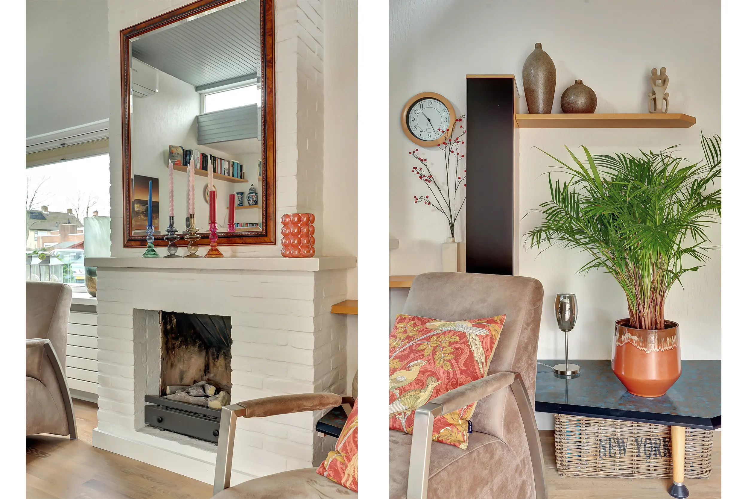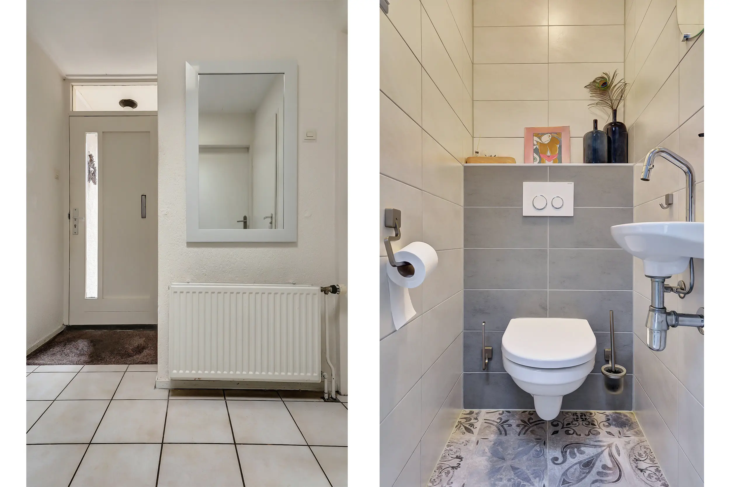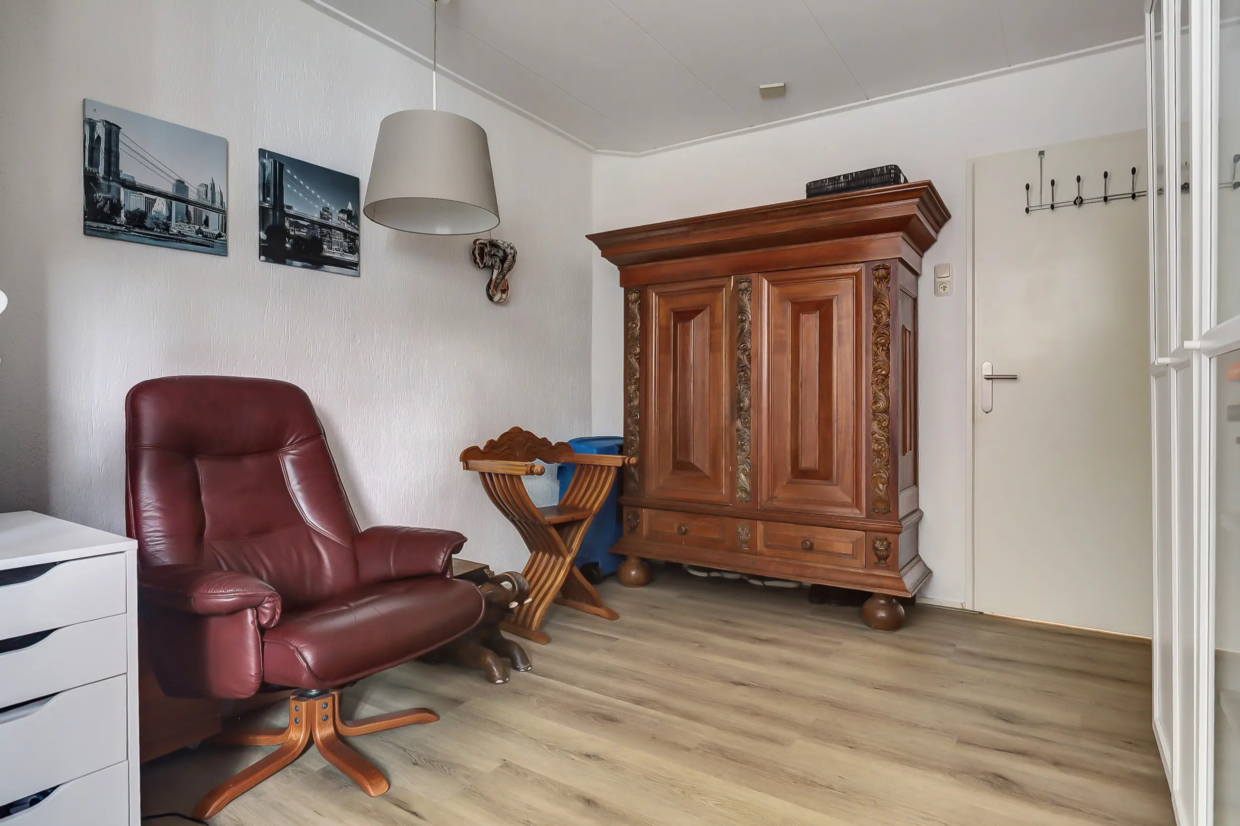 Entree met meterkast en moderne toiletruimte. De moderne greeploze keuken gelegen aan de tuinzijde is in een U-opstelling voorzien van inbouwapparatuur en een stenen werkblad. Ook is er een inbouwkast en een gezellige eetbar. Aangrenzend een praktische bijkeuken met daarin de CV-ketel (2003 Nefit) en wasmachine- en drogeraansluiting. Vanuit de hal en bijkeuken is de (werk) kamer toegankelijk. De sfeervolle lichte woonkamer is centraal in de woning gelegen. Door de uitbreiding aan de tuinzijde is de kamer ruim en licht. De gashaard geeft extra sfeer aan de woonkamer. Verder heeft de woonkamer een airconditioning en een nieuwe schuifpui. De gang geeft toegang tot vier slaapkamers en de badkamer. De badkamer is voorzien van een ligbad, losse douche, een wastafelmeubel en 2e toilet. Een van de slaapkamers is voorzien van een airconditioning en een tuindeur.