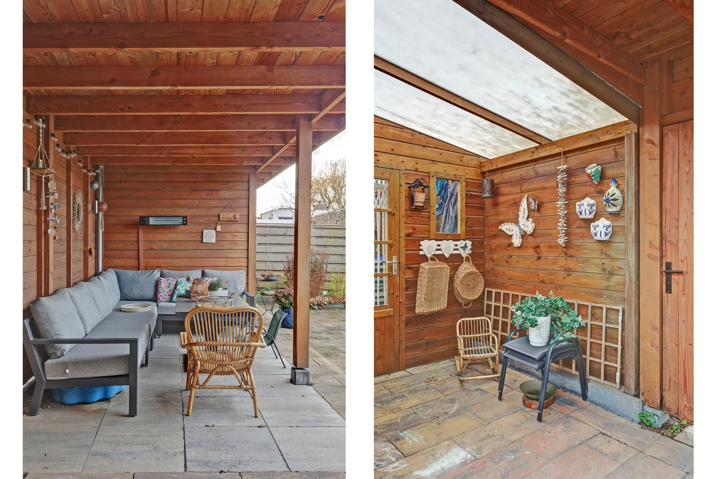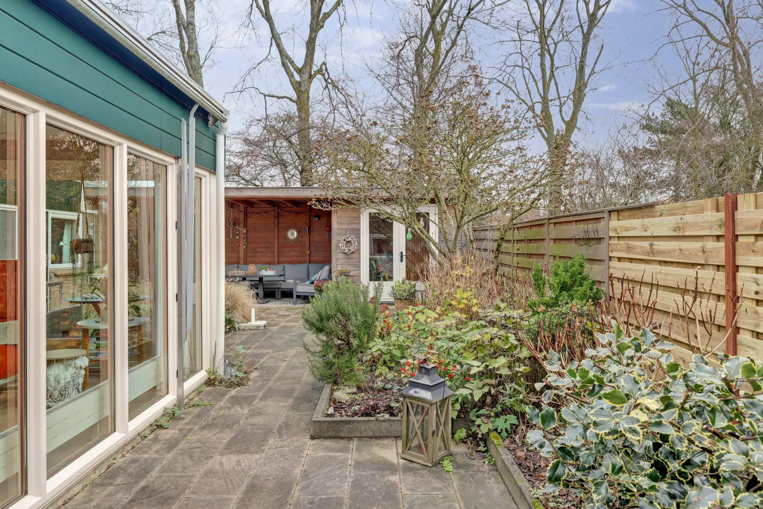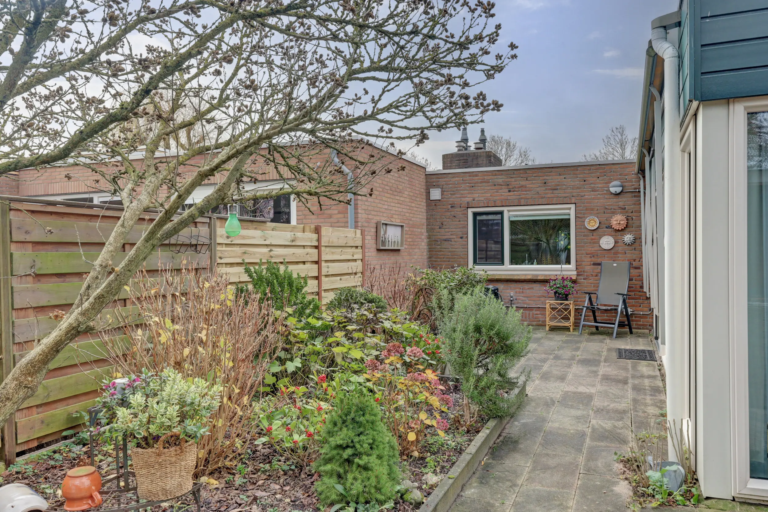 Aan de voorzijde is een ruime oprit met plaats voor twee auto’s, een stenen berging en een tuin met beplanting. De beschutte zonnige achtertuin gelegen op het Zuidoosten heeft een terras met borders, een overkapping met aan de ene zijde een houten berging en de andere kant een tuinhuis. Ook is een achterom naar het achtergelegen pad.
