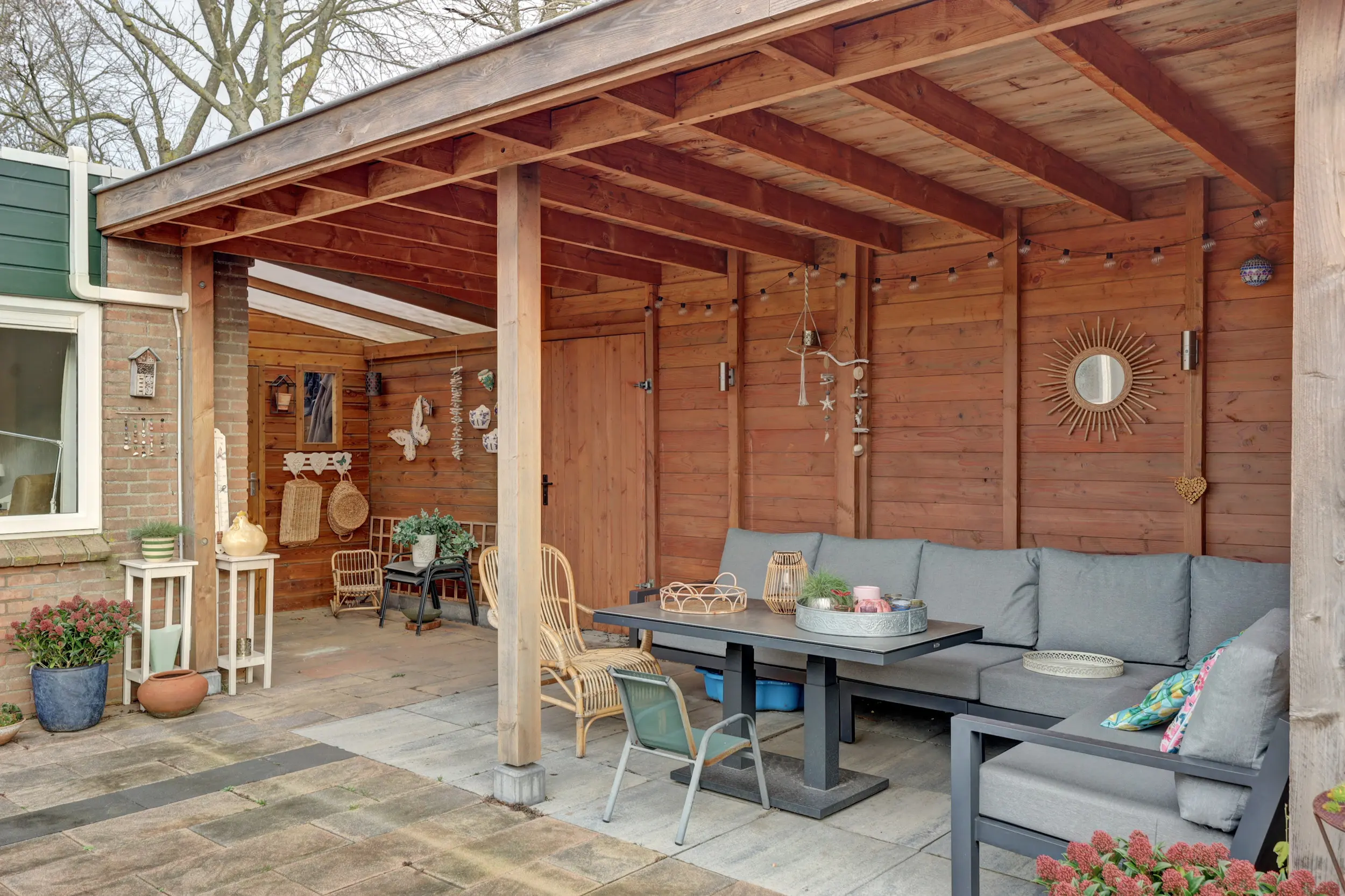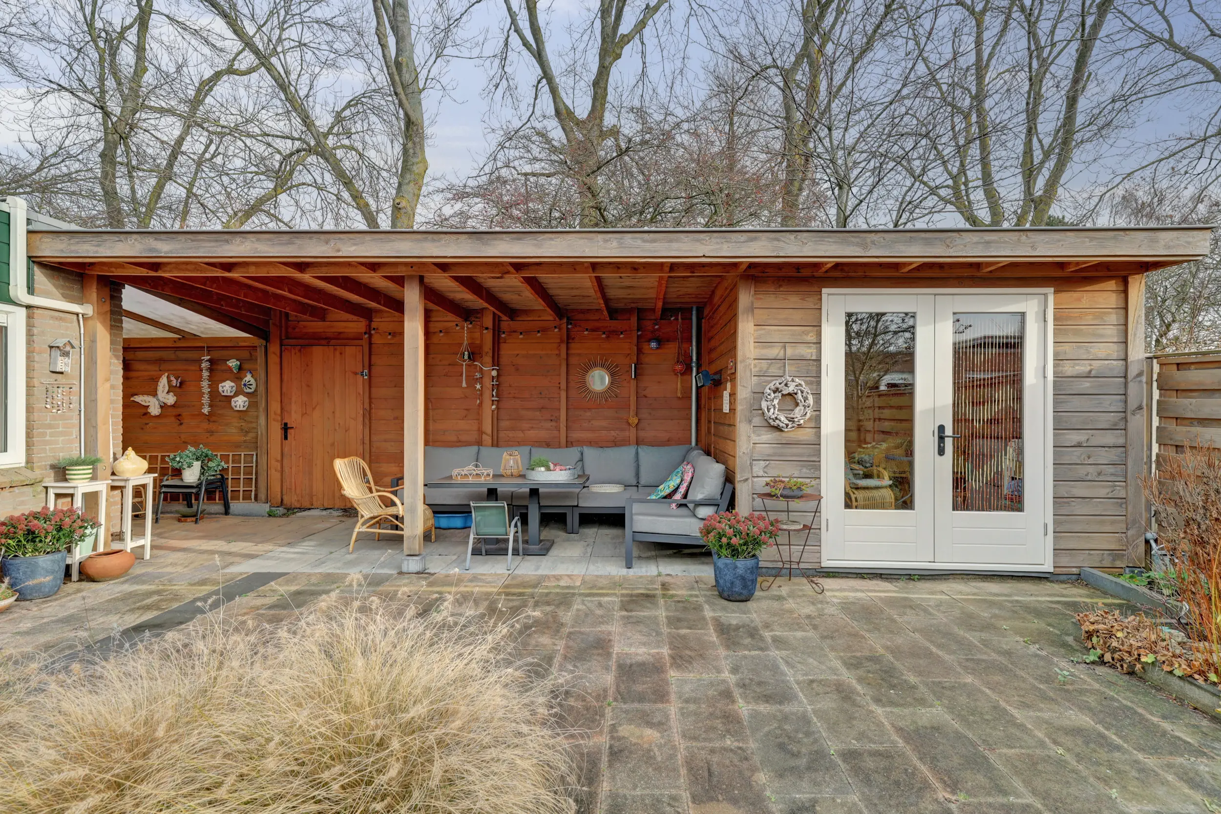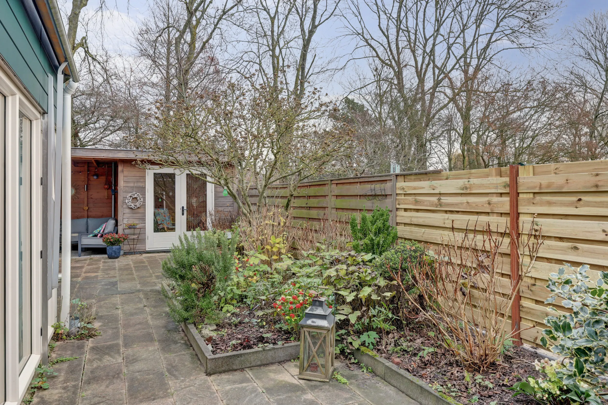 Aan de voorzijde is een ruime oprit met plaats voor twee auto’s, een stenen berging en een tuin met beplanting. De beschutte zonnige achtertuin gelegen op het Zuidoosten heeft een terras met borders, een overkapping met aan de ene zijde een houten berging en de andere kant een tuinhuis. Ook is een achterom naar het achtergelegen pad.