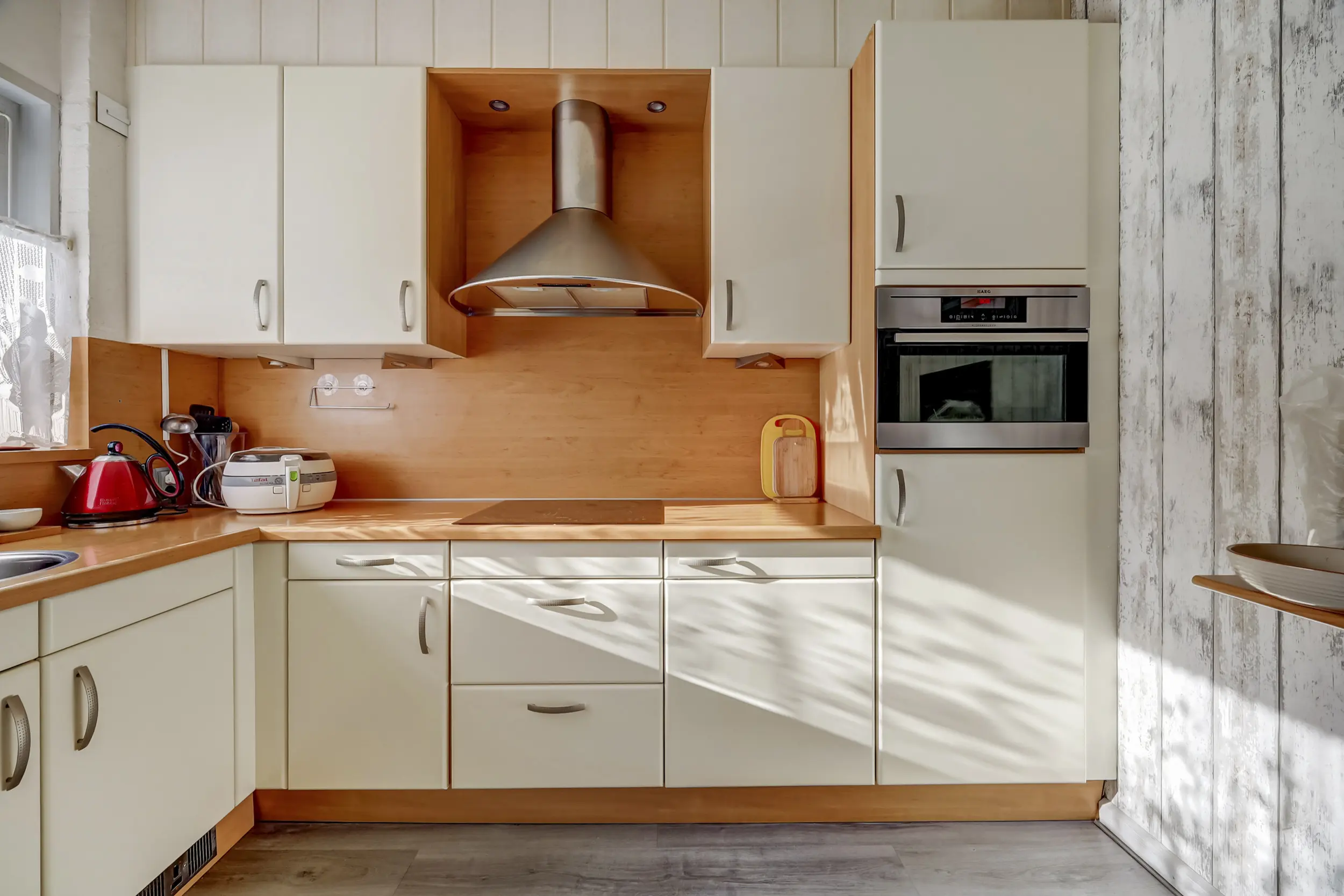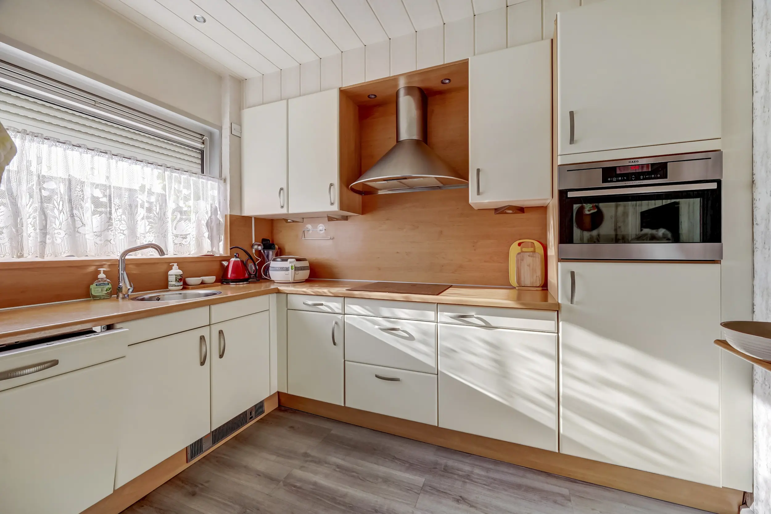 De keukenruimte aan de voorzijde is uitgevoerd met inbouwapparatuur als koelkast, vriezer, kookplaat en vaatwasser.
