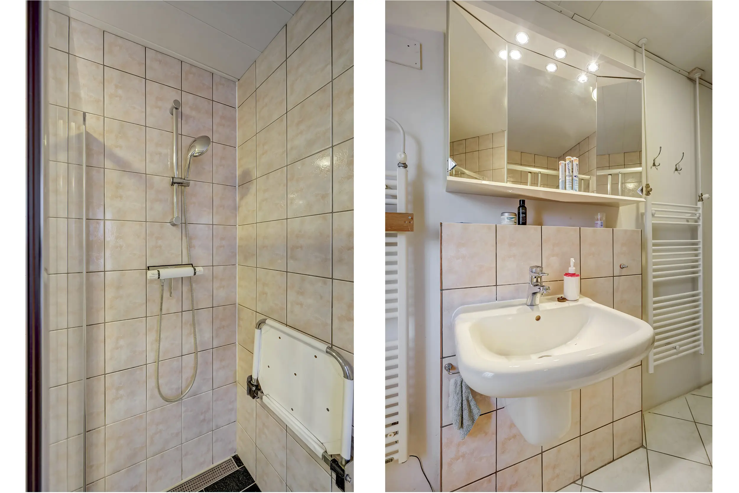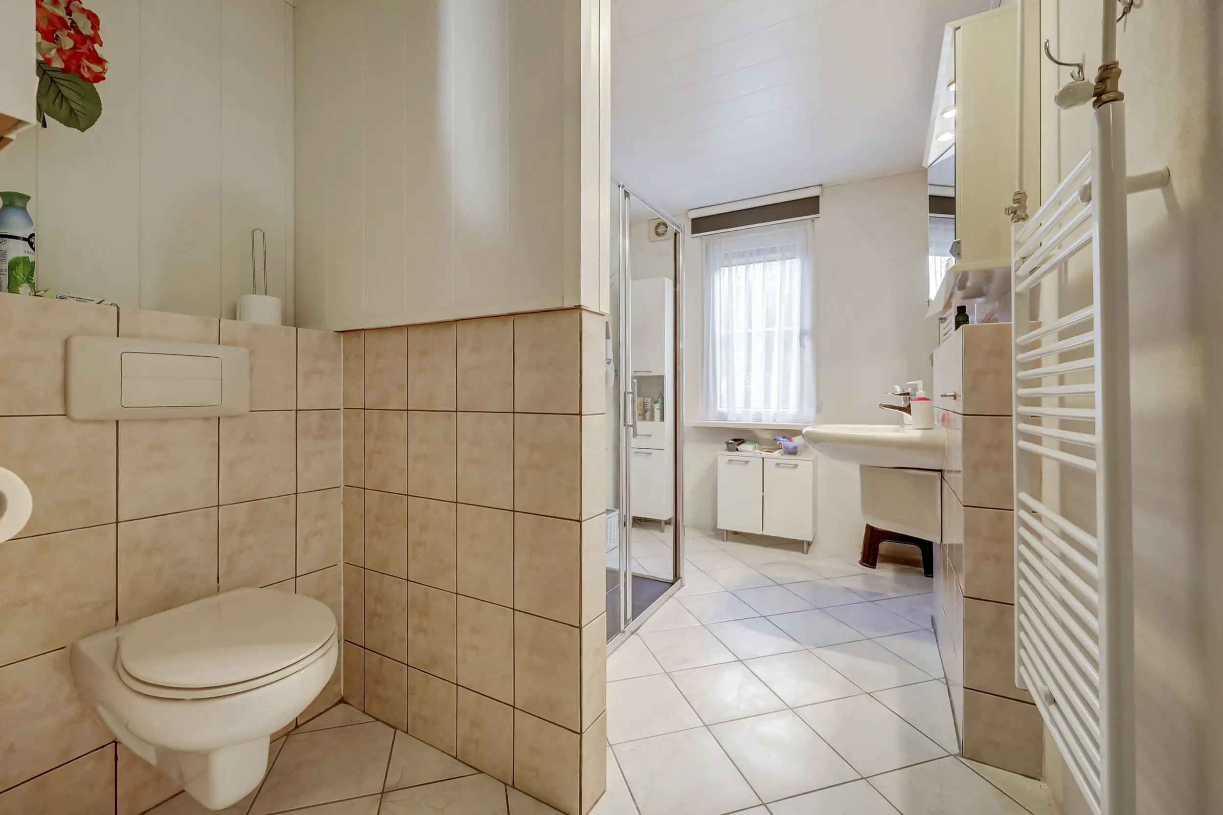 De ruime badkamer heeft een toilet, douchecabine en wastafelmeubel.