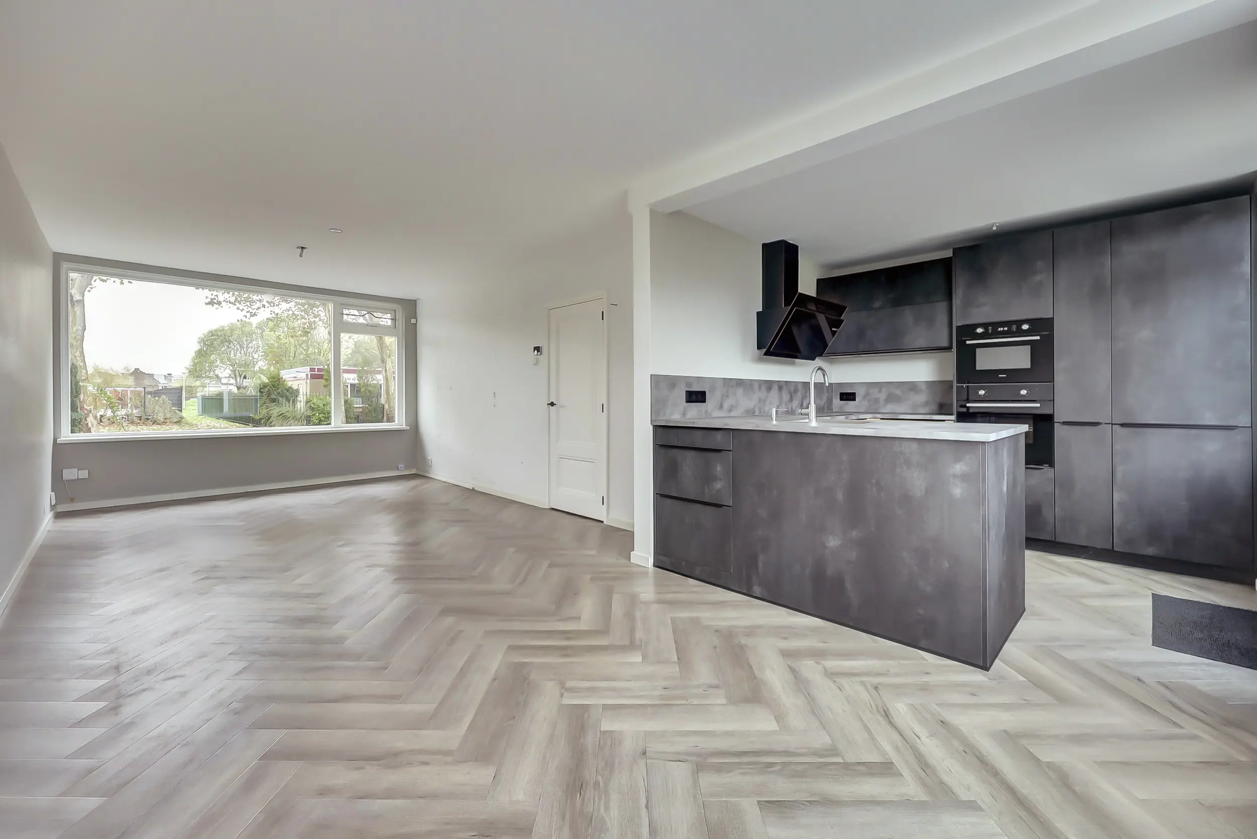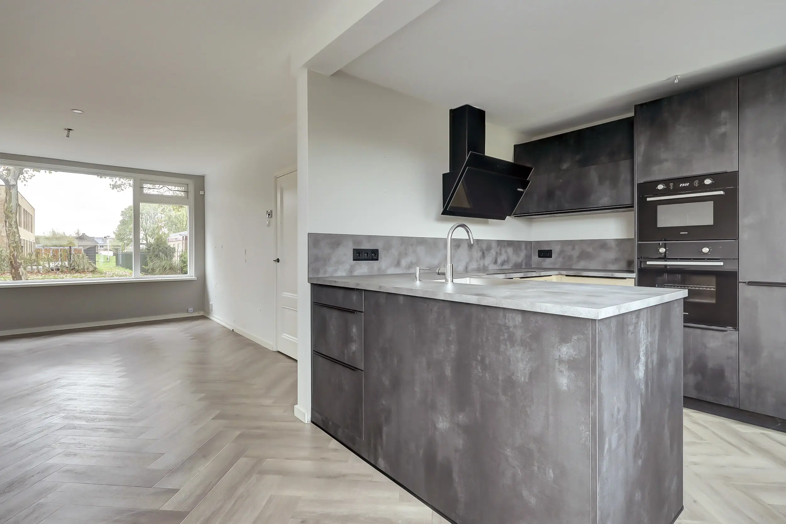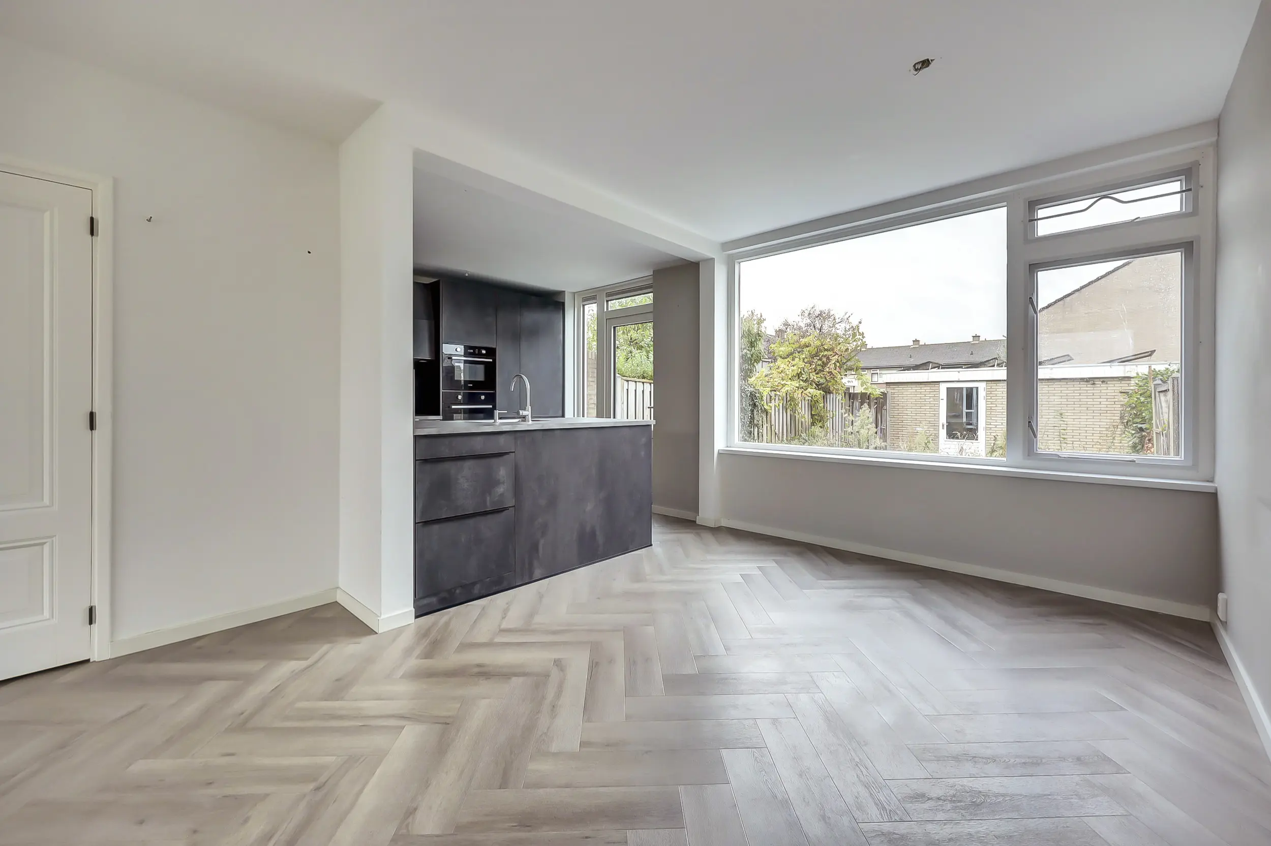 Op de begane grond is de woonkamer uitgevoerd met een visgraatvloer en vloerverwarming. De luxe open keuken in U-vorm heeft veel kastruimte en inbouwapparatuur.