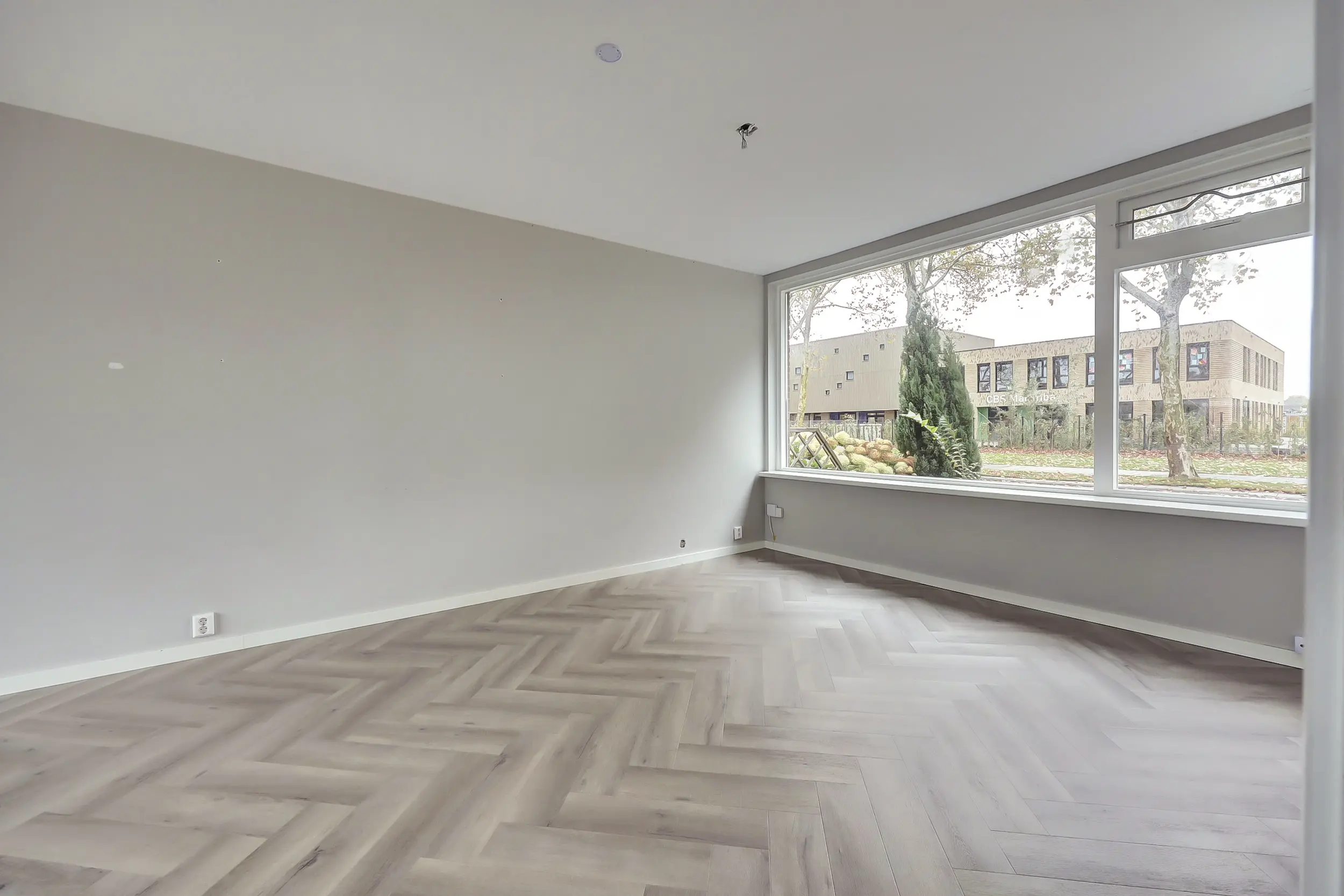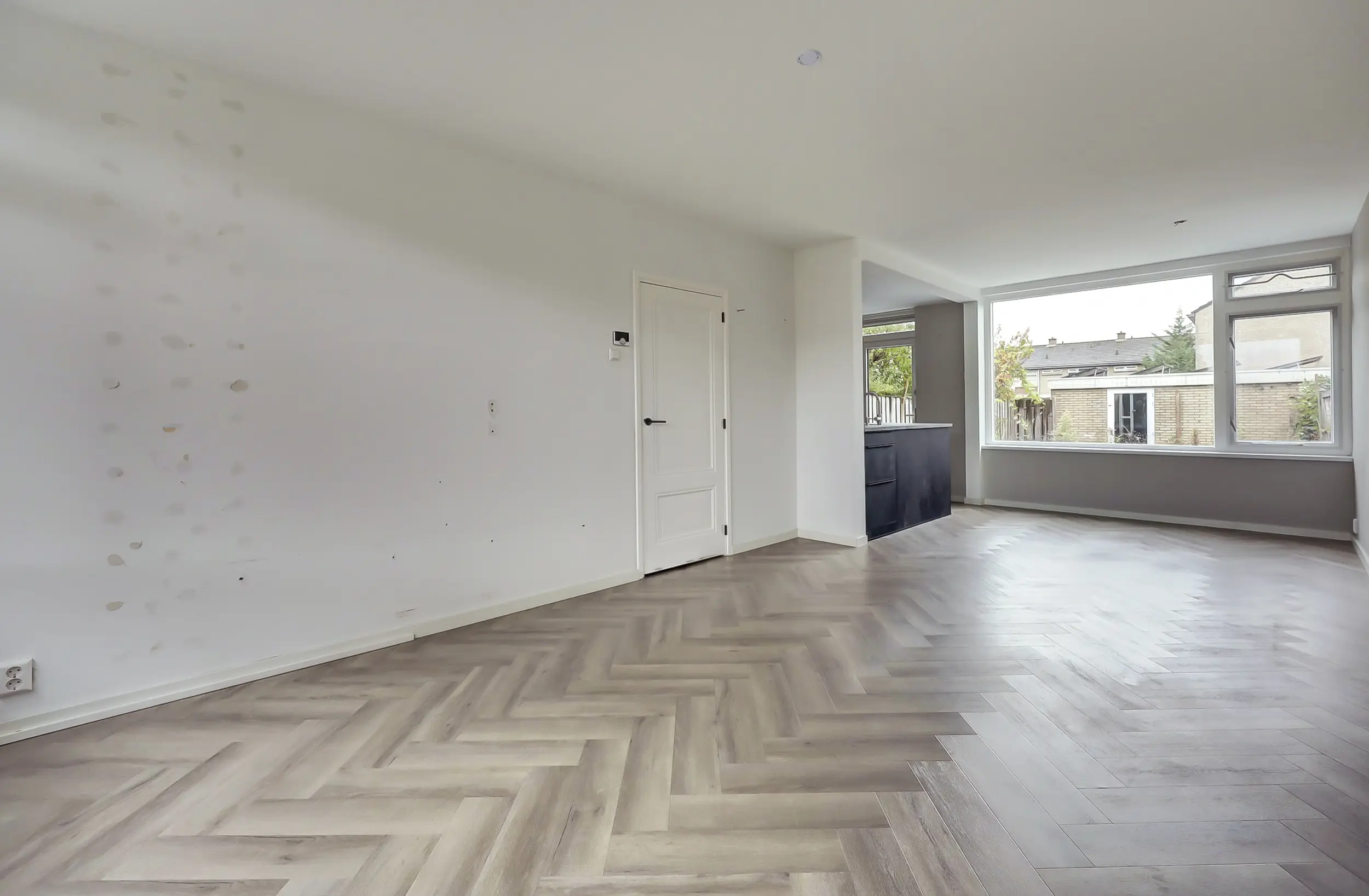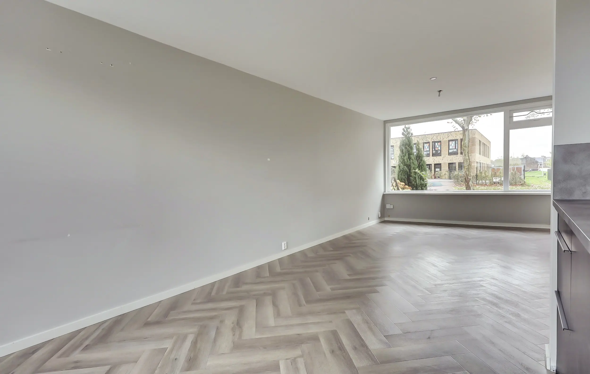 Op de begane grond is de woonkamer uitgevoerd met een visgraatvloer en vloerverwarming. De luxe open keuken in U-vorm heeft veel kastruimte en inbouwapparatuur.