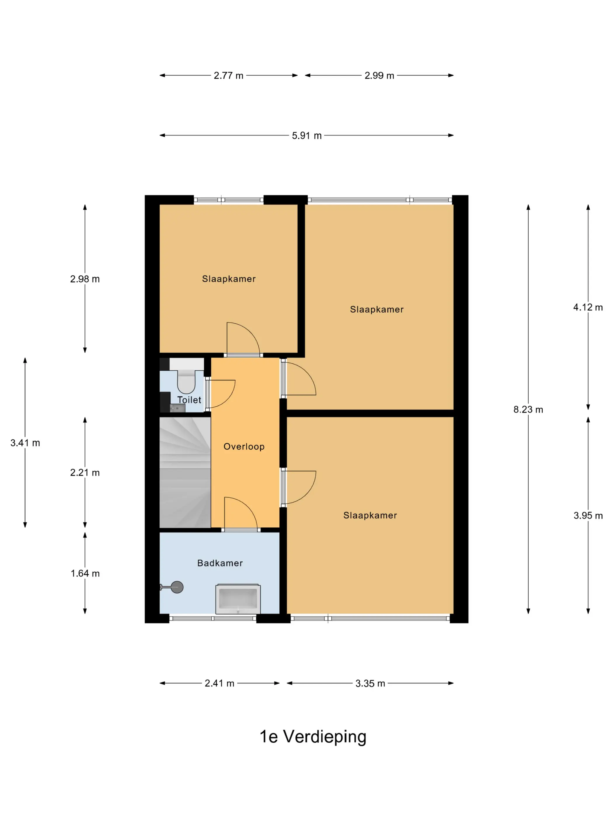 Er zijn 3 slaapkamers en een tweede toilet op de 1e etage, de badkamer is uitgevoerd met douche en wastafelmeubel.