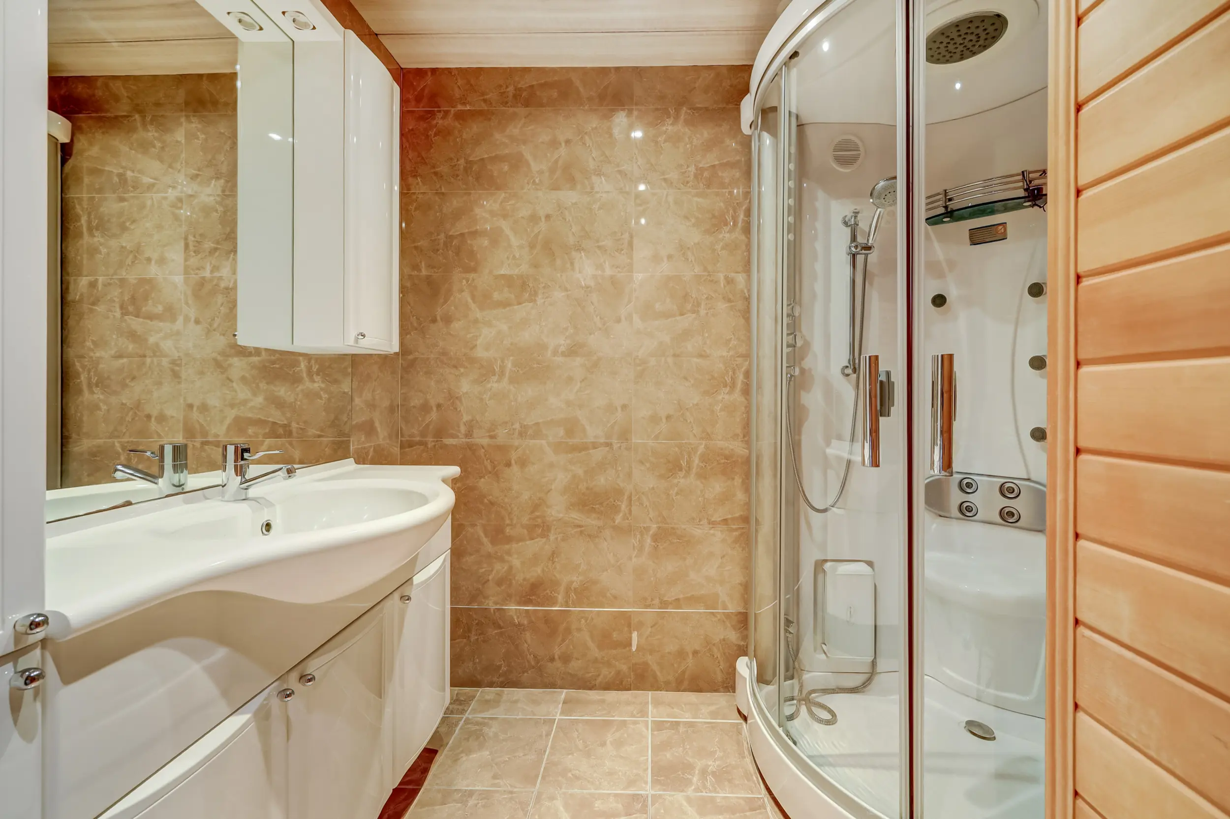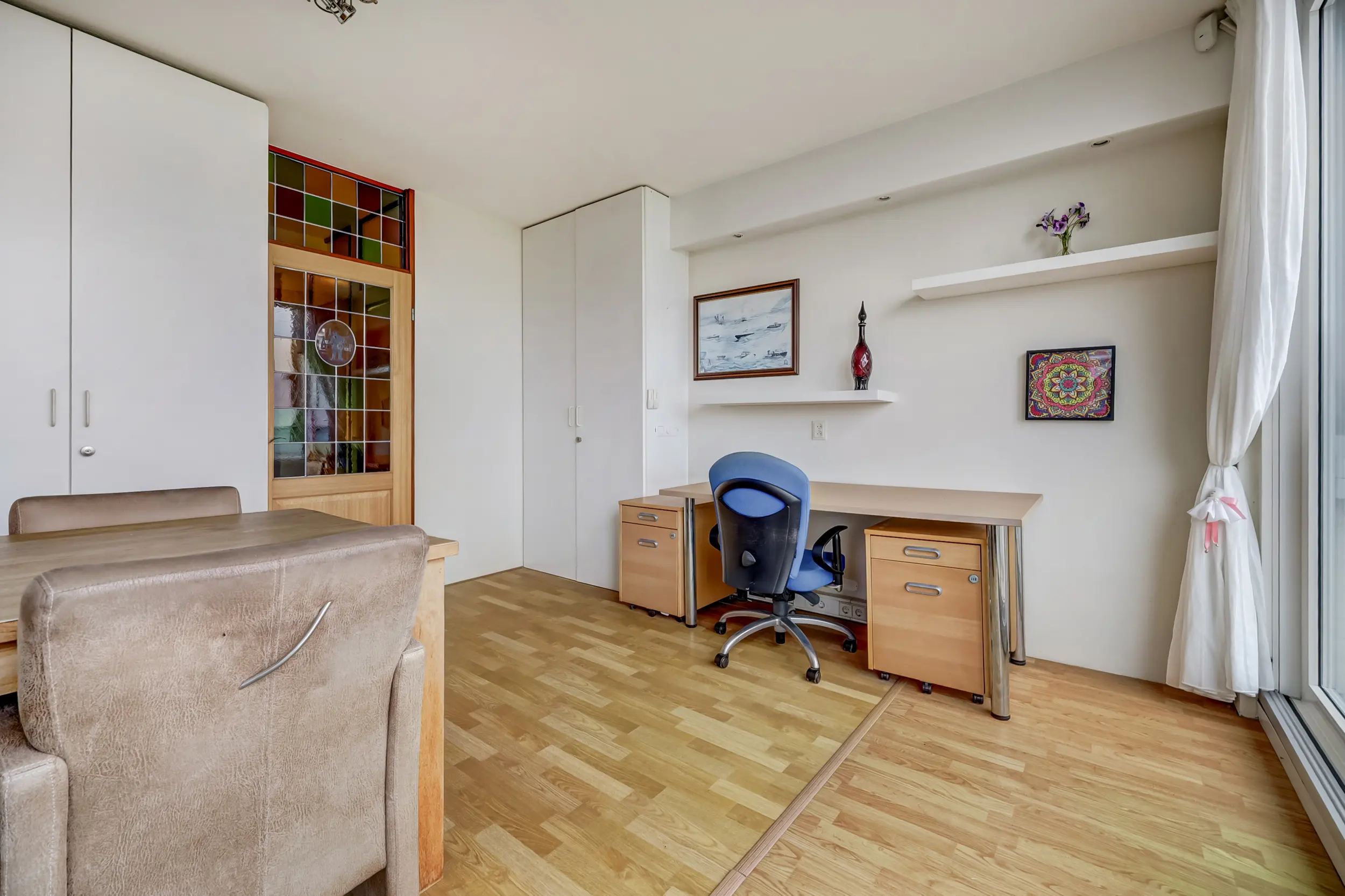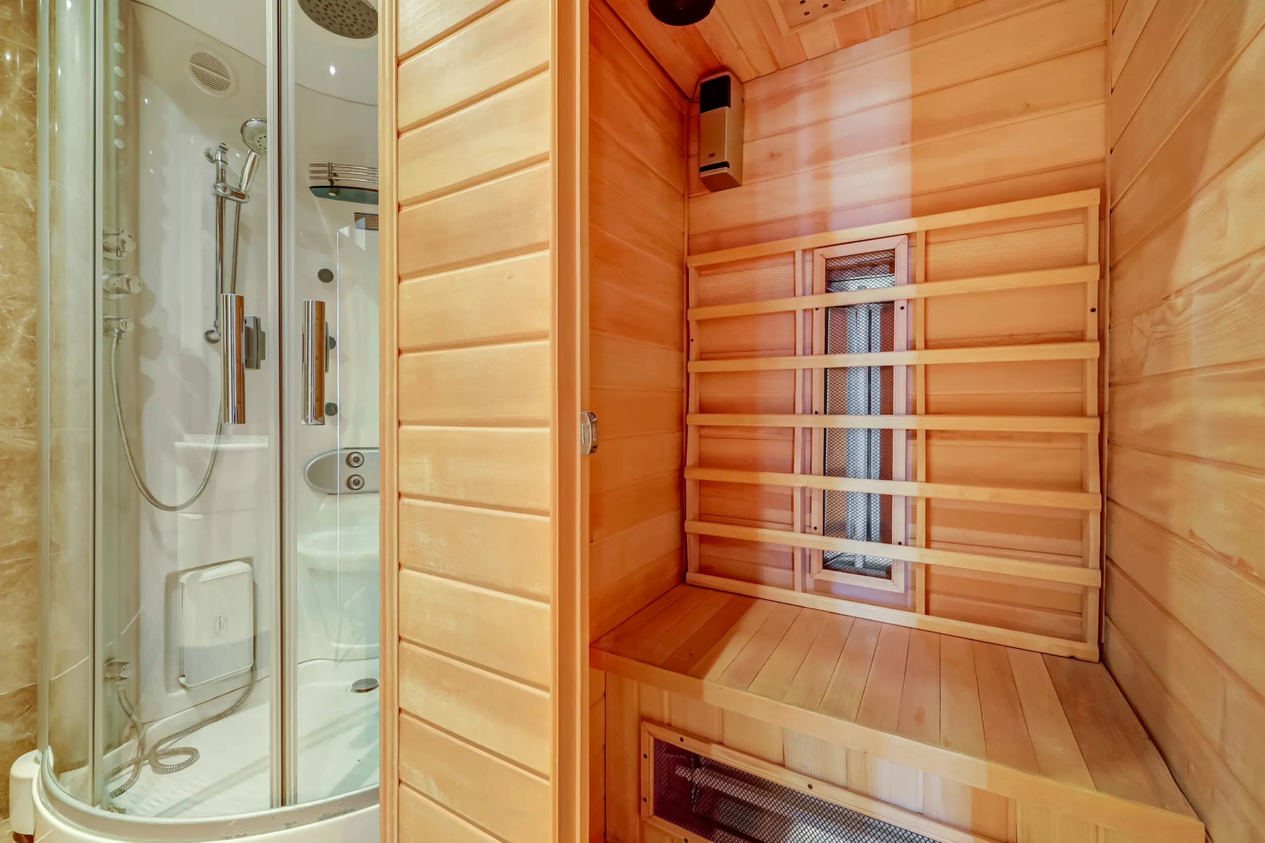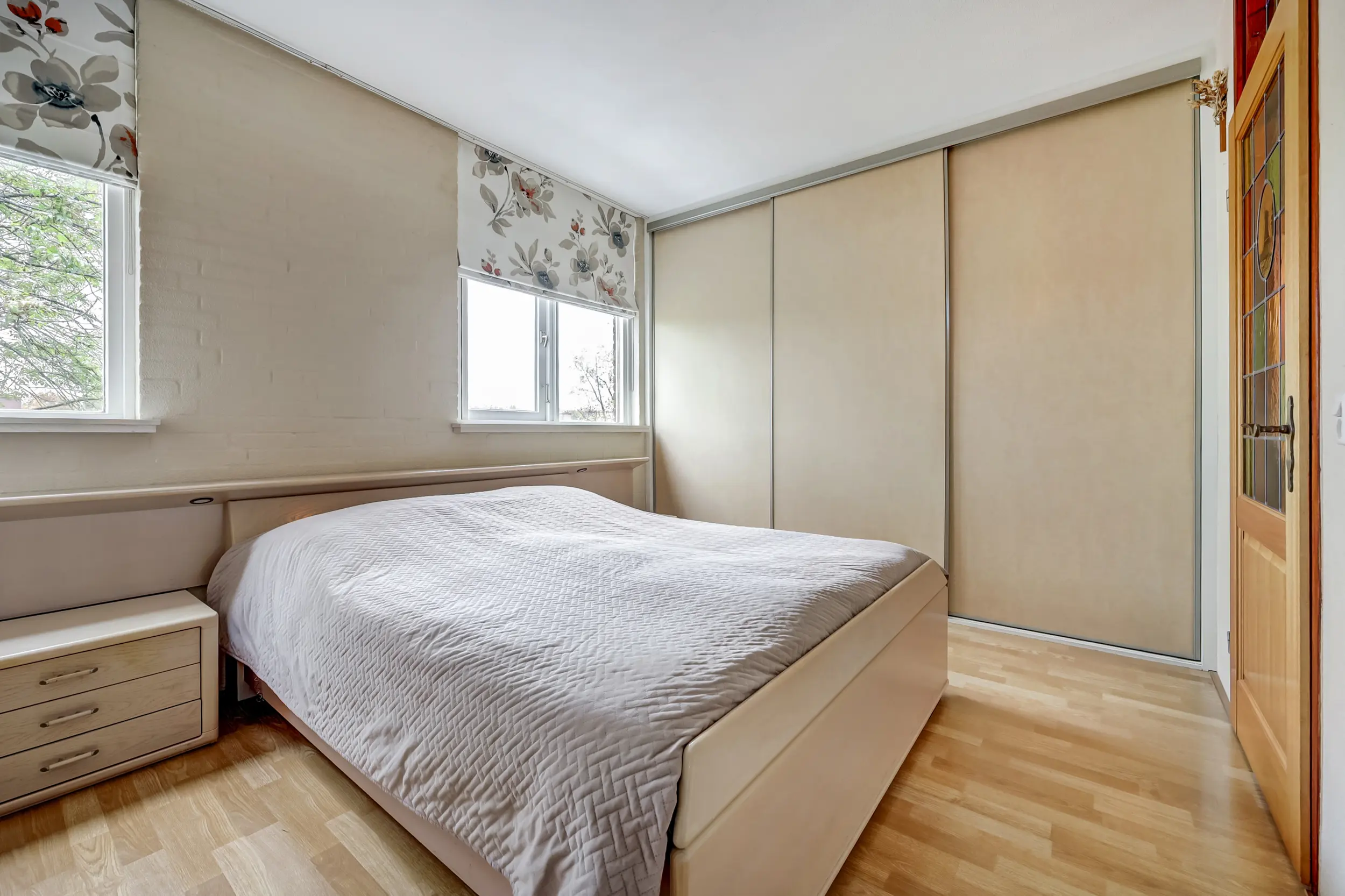 Een gang brengt je bij de 2 slaapkamers, de badkamer en het separate toilet. De badkamer is luxe! Deze is uitgerust met een eigen sauna, stoomdouchecabine, wastafelmeubel en is voorzien van vloerverwarming. Ideaal is dat in dit appartement een separaat toilet aanwezig is. Voor de CV-ketel (Vaillant 2024) en de mechanische ventilatie box is een aparte bergruimte. De slaapkamers zijn ruim. De slaapkamer aan de voorzijde heeft een deur naar de noodtrap en de andere slaapkamer met kastenwand grenst aan het dakterras. Deze kamer is vergroot waardoor er nog meer woonruimte is gecreëerd.