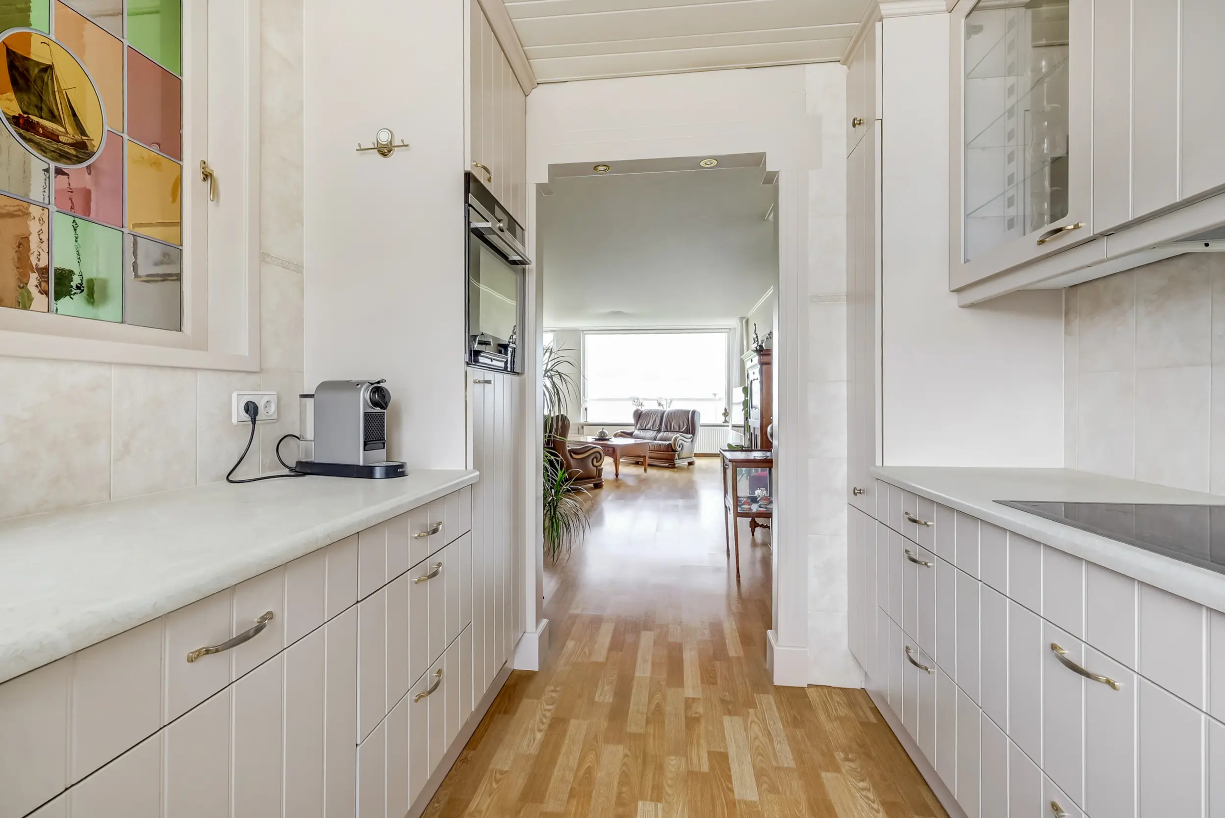 Aan het einde van de galerij, waaraan slechts 2 appartementen zijn, ligt dit hoekappartement. De entree van het appartement is ruim en doet zowel dienst als garderobe als bijkeuken. De wasmachine en droger zijn in het geheel uit zicht geplaatst. Vanuit hier kom je in de woonkamer met zicht op het Haringvliet. Dit uitzicht verveelt nooit! Elk jaargetijde is het anders. Bootjes, flora en fauna voor de deur! De keuken in U-opstelling met inbouwapparatuur is in een neutrale kleurstelling. De open keuken is gelegen aan de voorzijde van het appartement.