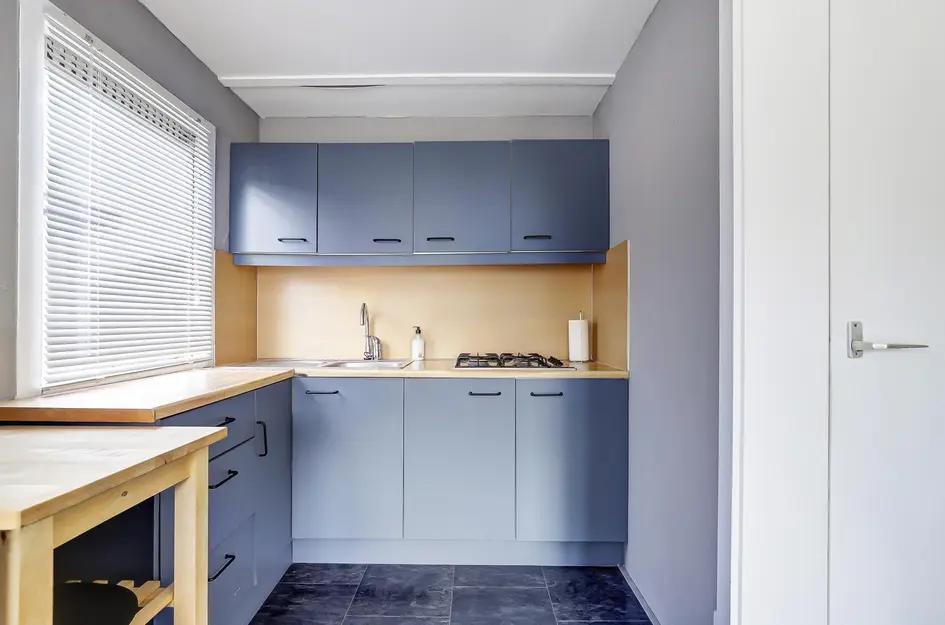 Door de dubbele deuren toegang tot de gezellige woonkamer met een ruimte voor een vier persoons eethoek en slaapbank. Een moderne open keuken voorzien van een gasfornuis en losse koelkast.
