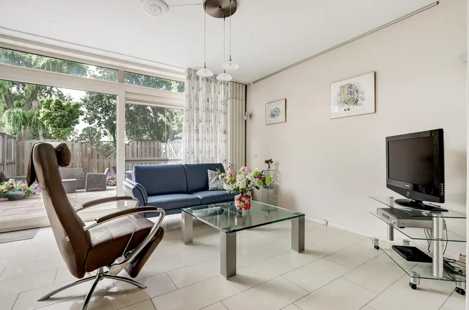 Woonkamer met grote schuifpui aan de achterzijde, doordat de achterzijde op het Zuidwesten ligt is er veel daglichttoetreding in het woongedeelte. De open keuken aan de voorzijde is uitgevoerd met inbouwapparatuur als vaatwasser, combi-oven, kookplaat en koel-vriescombinatie. De begane grond is voorzien van vloerverwarming en zonwering aan de achterzijde.
