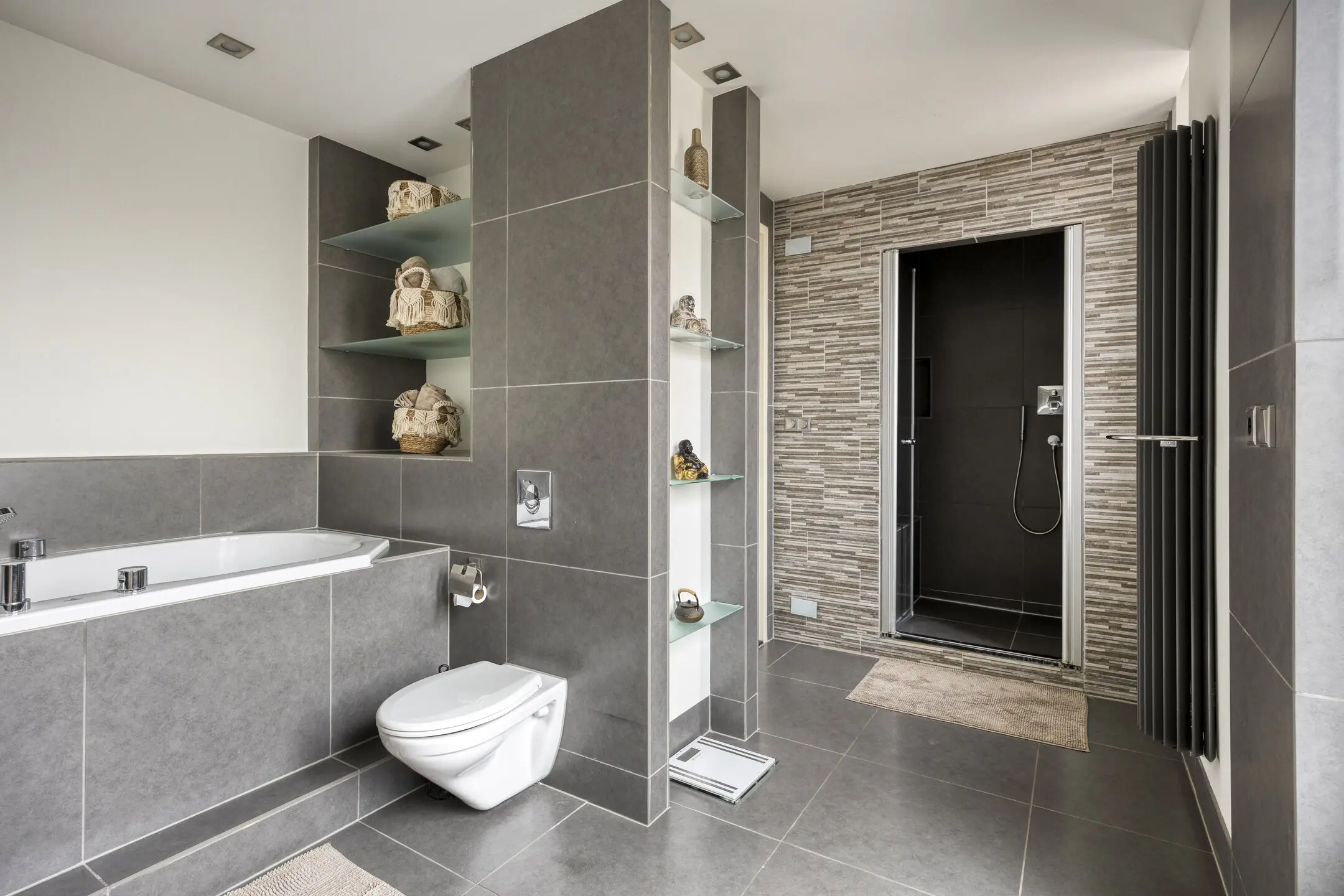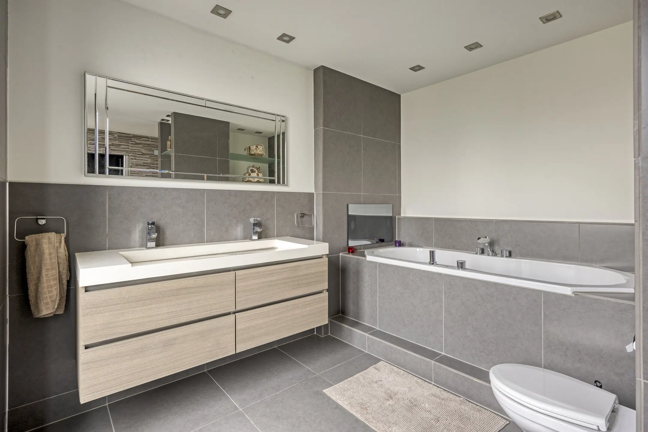 De moderne en ruime badkamer (een slaapkamer is hiervoor opgeofferd) aan de voorzijde is compleet uitgerust met een ligbad/whirlpool, inloopdouche met infrarood sauna, toilet en dubbele wastafel. Tevens biedt de badkamer toegang tot het balkon.