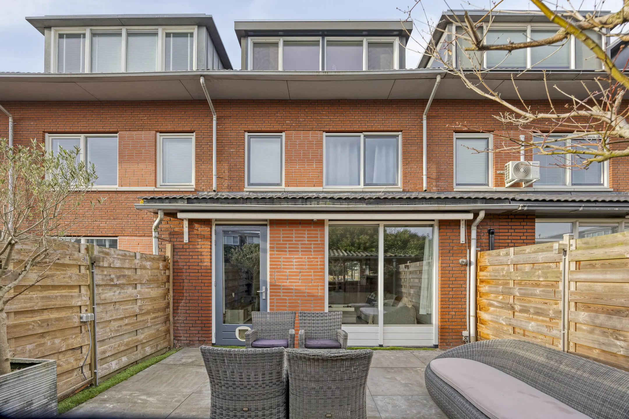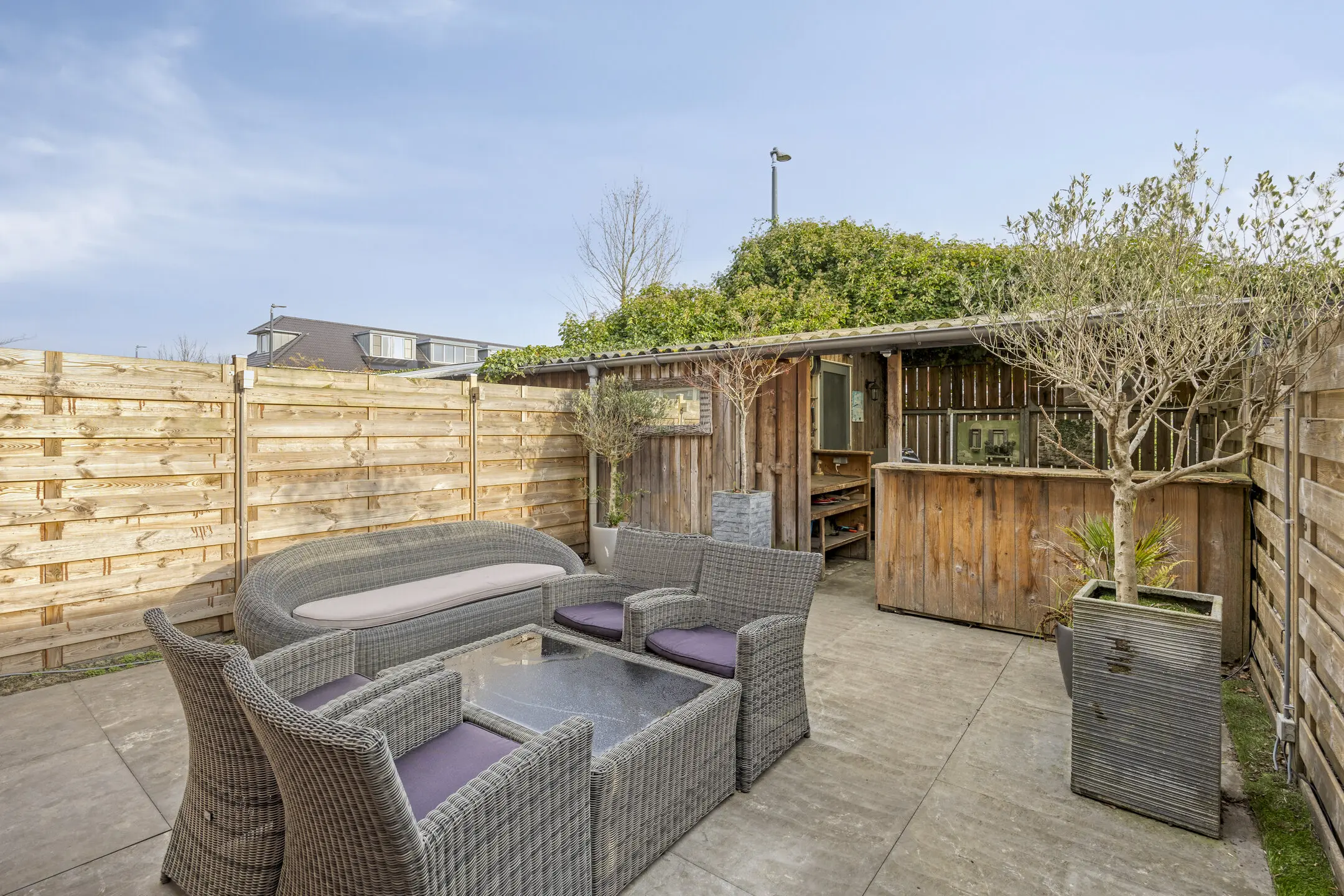 Via de woonkeuken bereik je de zonnige, diepe achtertuin met ruime houten berging en overkapping met een zitplek- een perfecte plek om te ontspannen of gezellig buiten te eten.