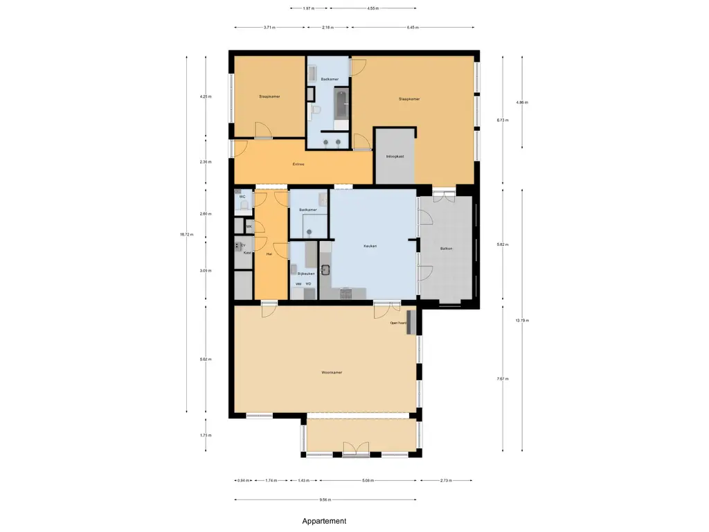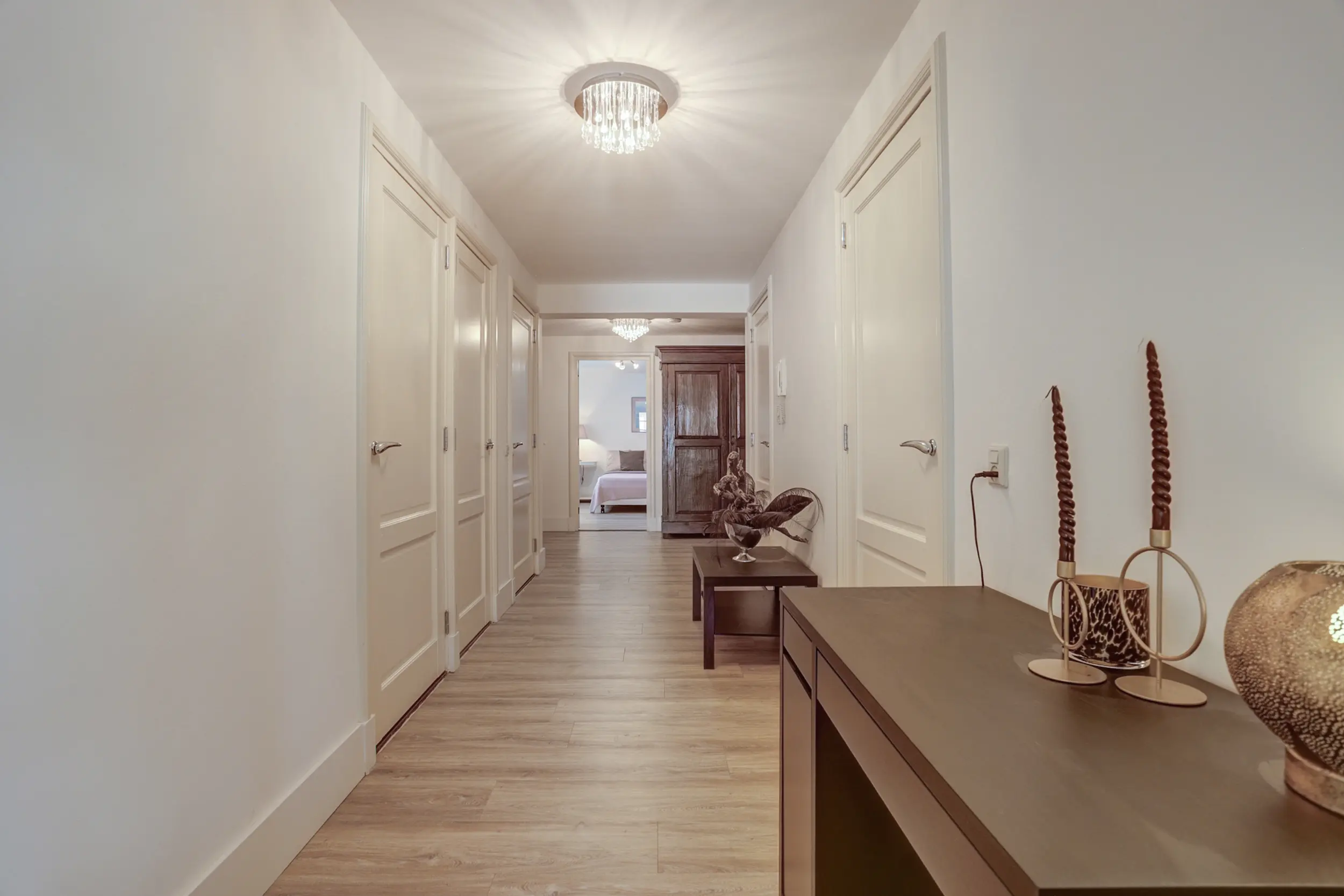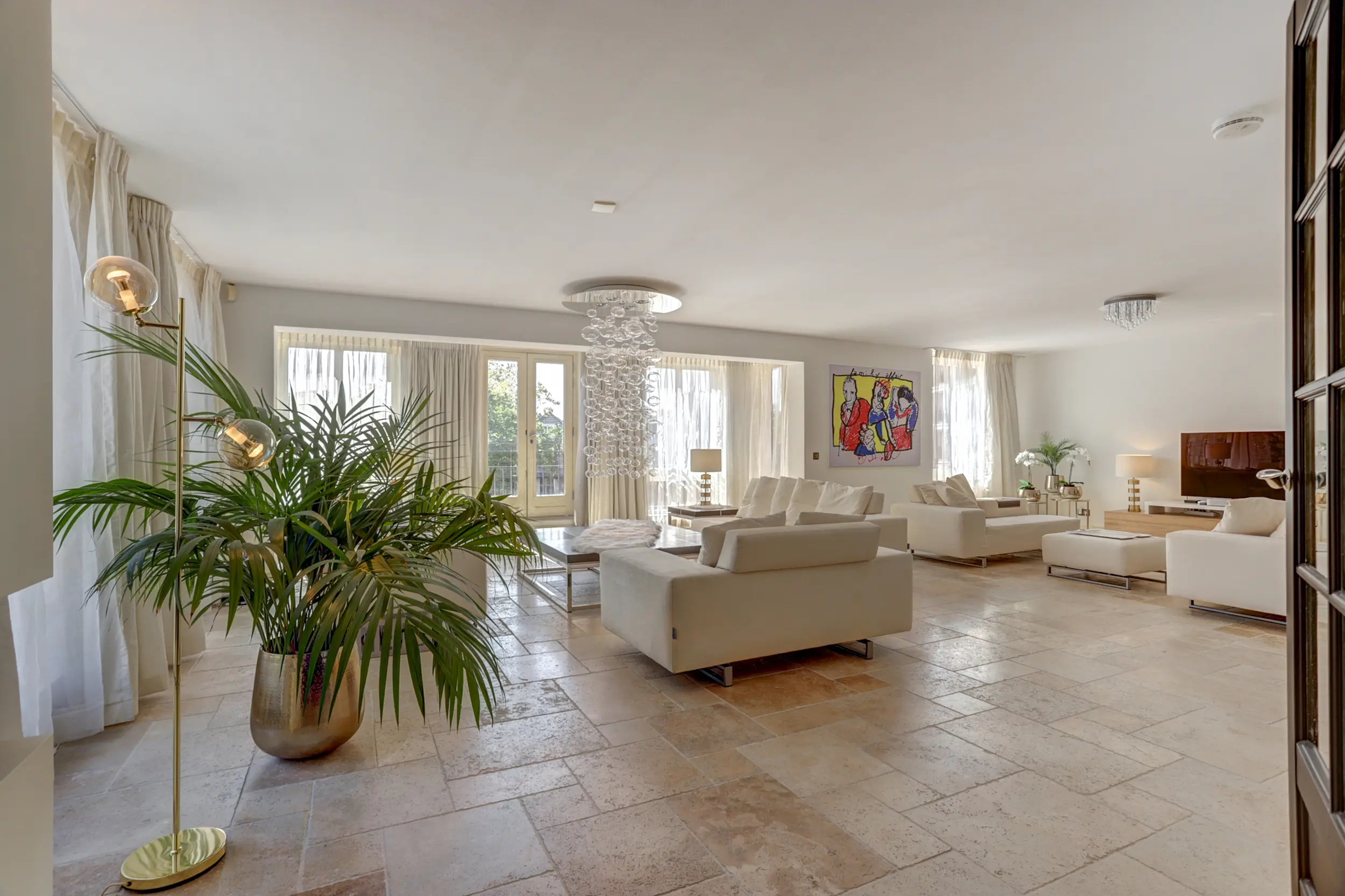 Via de entree kom je binnen in een ruime hal die toegang biedt tot alle vertrekken van het appartement. Aan de voorzijde bevindt zich de royale woonkamer, die dankzij de vele ramen over de volle breedte heerlijk licht is. Het natuurstenen vloeroppervlak en de strak gestuukte wanden en plafonds geven de ruimte een moderne en stijlvolle uitstraling. Vanuit de woonkamer leiden openslaande deuren naar de afgesloten keuken. De strakke, zwarte inrichting met hoogwaardige inbouwapparatuur geeft de keuken een luxe en eigentijdse sfeer.