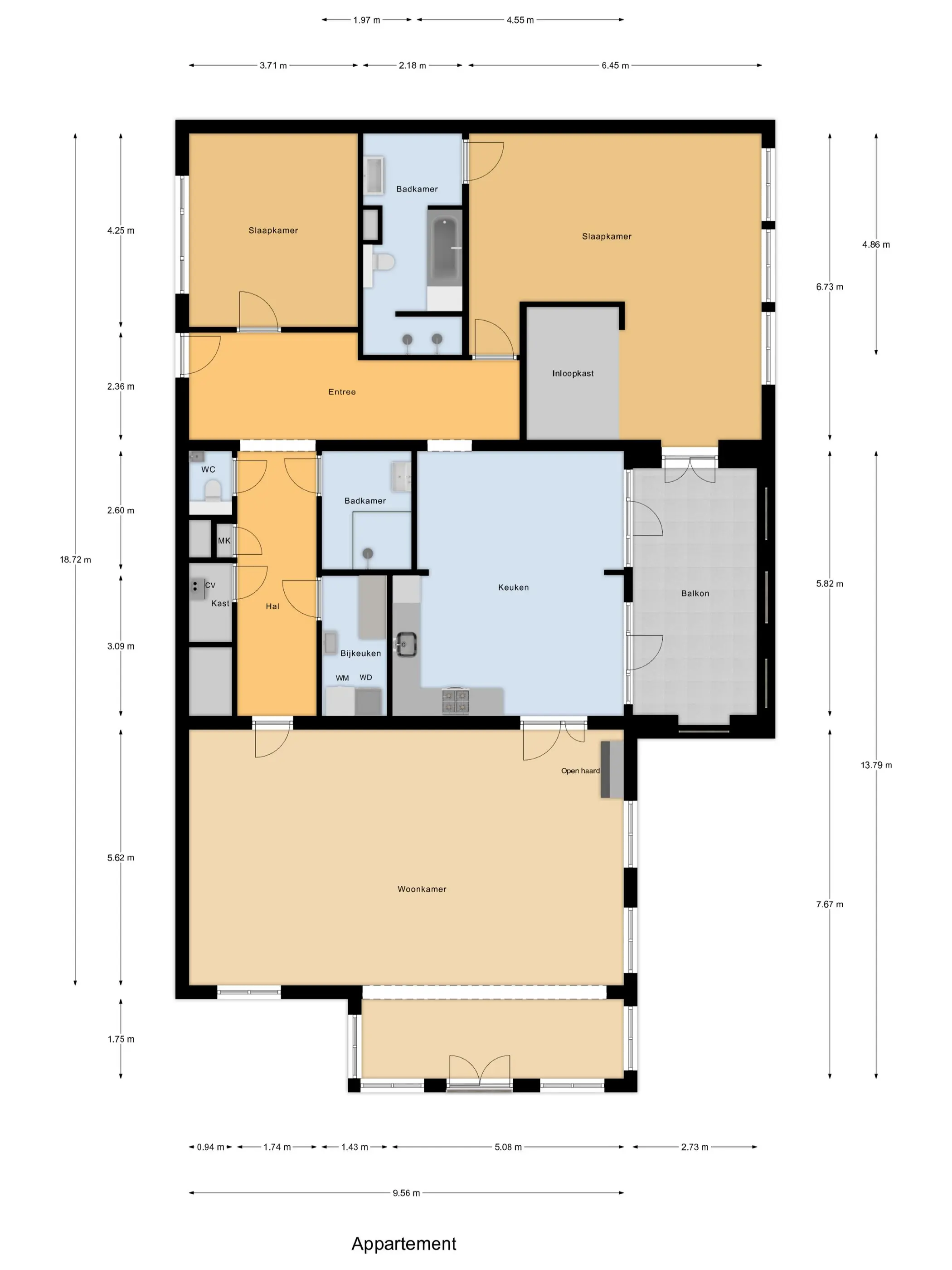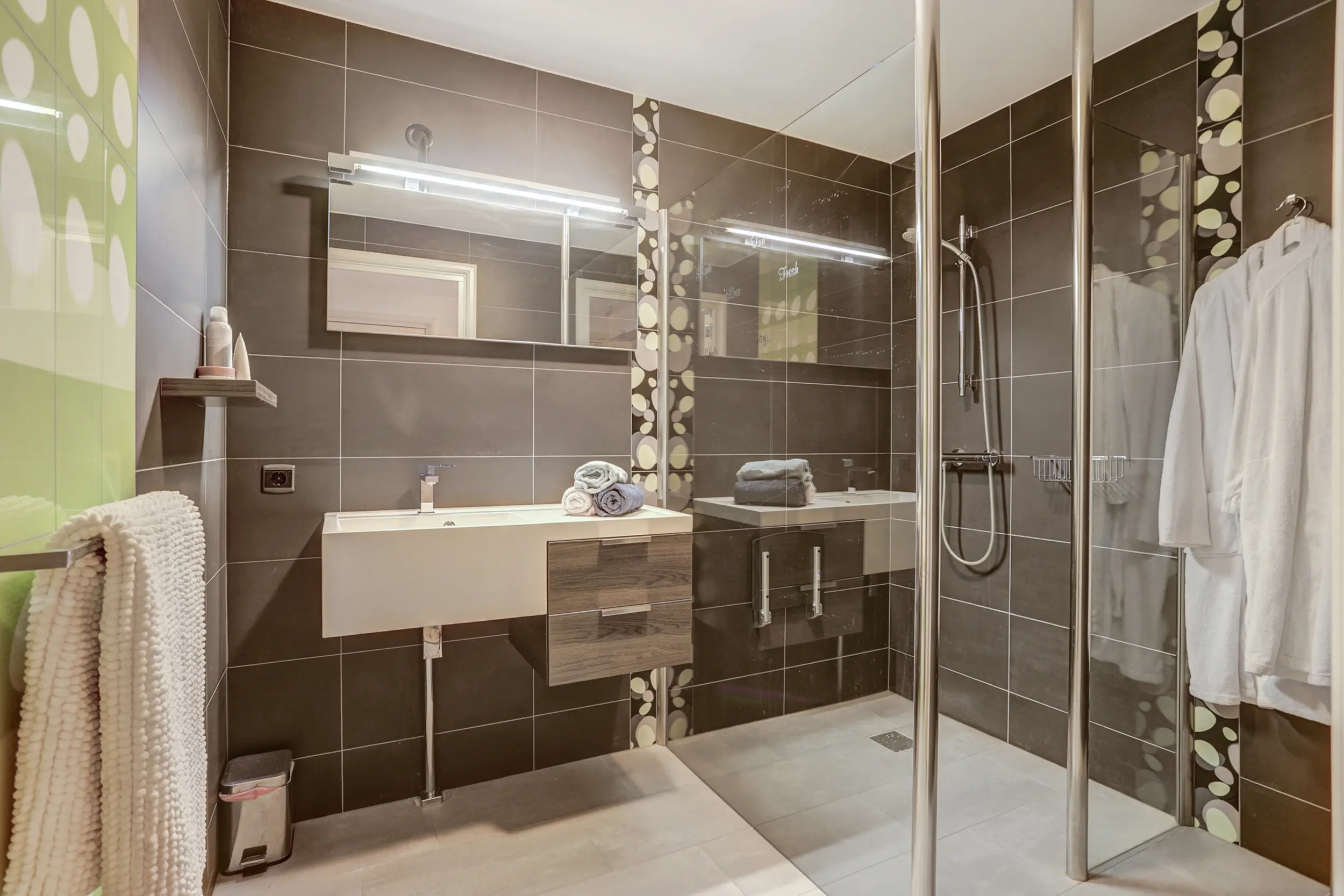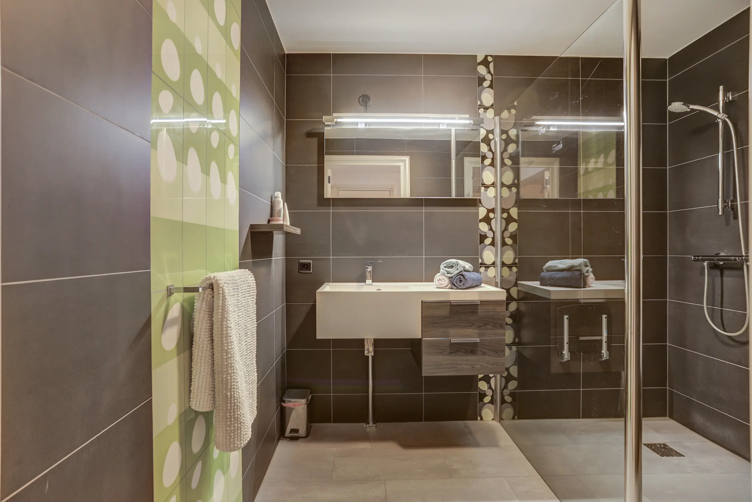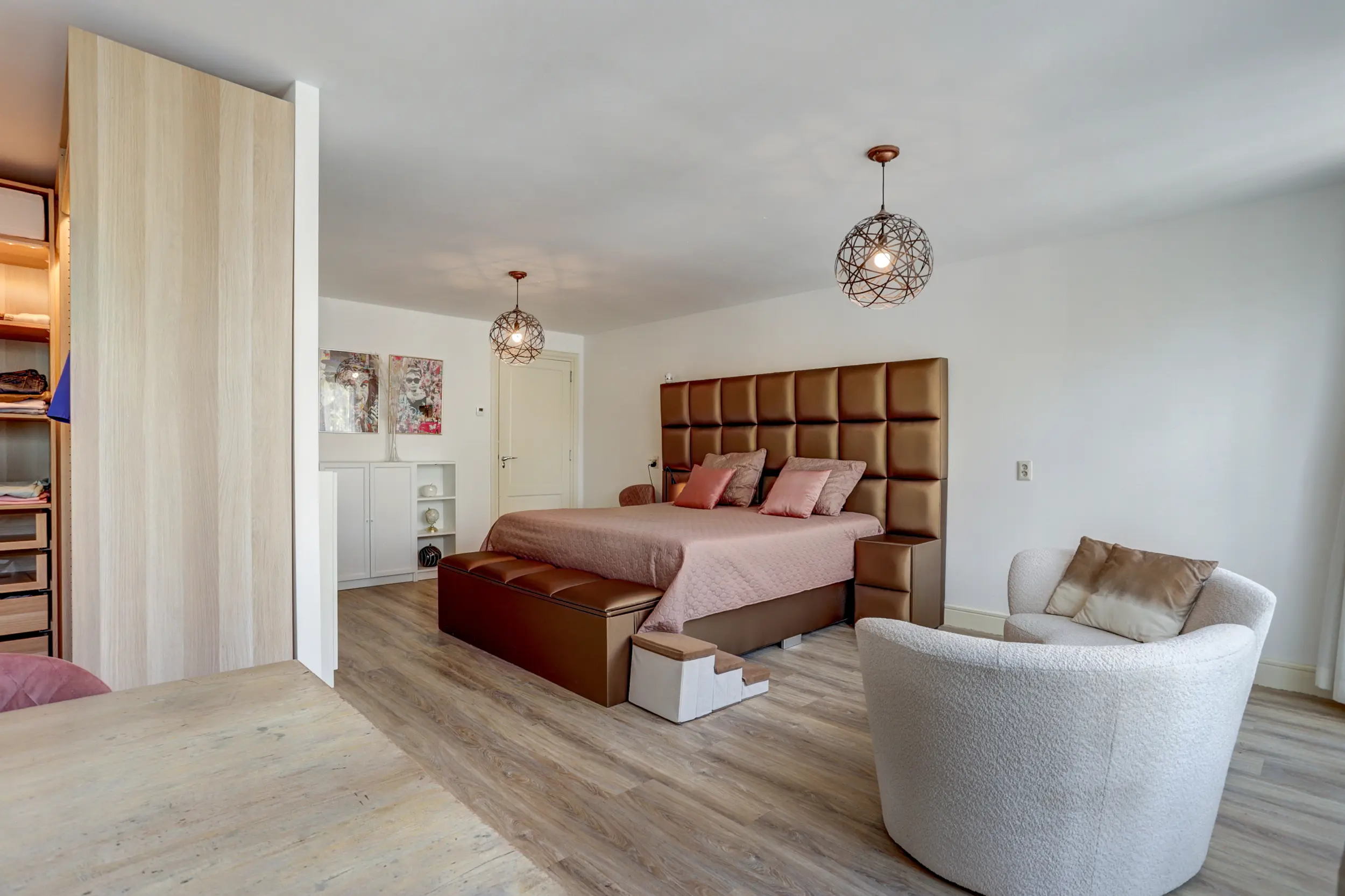 Het appartement beschikt over twee comfortabele slaapkamers, beide afgewerkt met een PVC vloer en glad gestuukte wanden. De hoofdslaapkamer is voorzien van een eigen badkamer met inloopdouche, ligbad, toilet en wastafel. De tweede slaapkamer maakt gebruik van de tweede badkamer, die eveneens modern is uitgevoerd met een inloopdouche en wastafel.