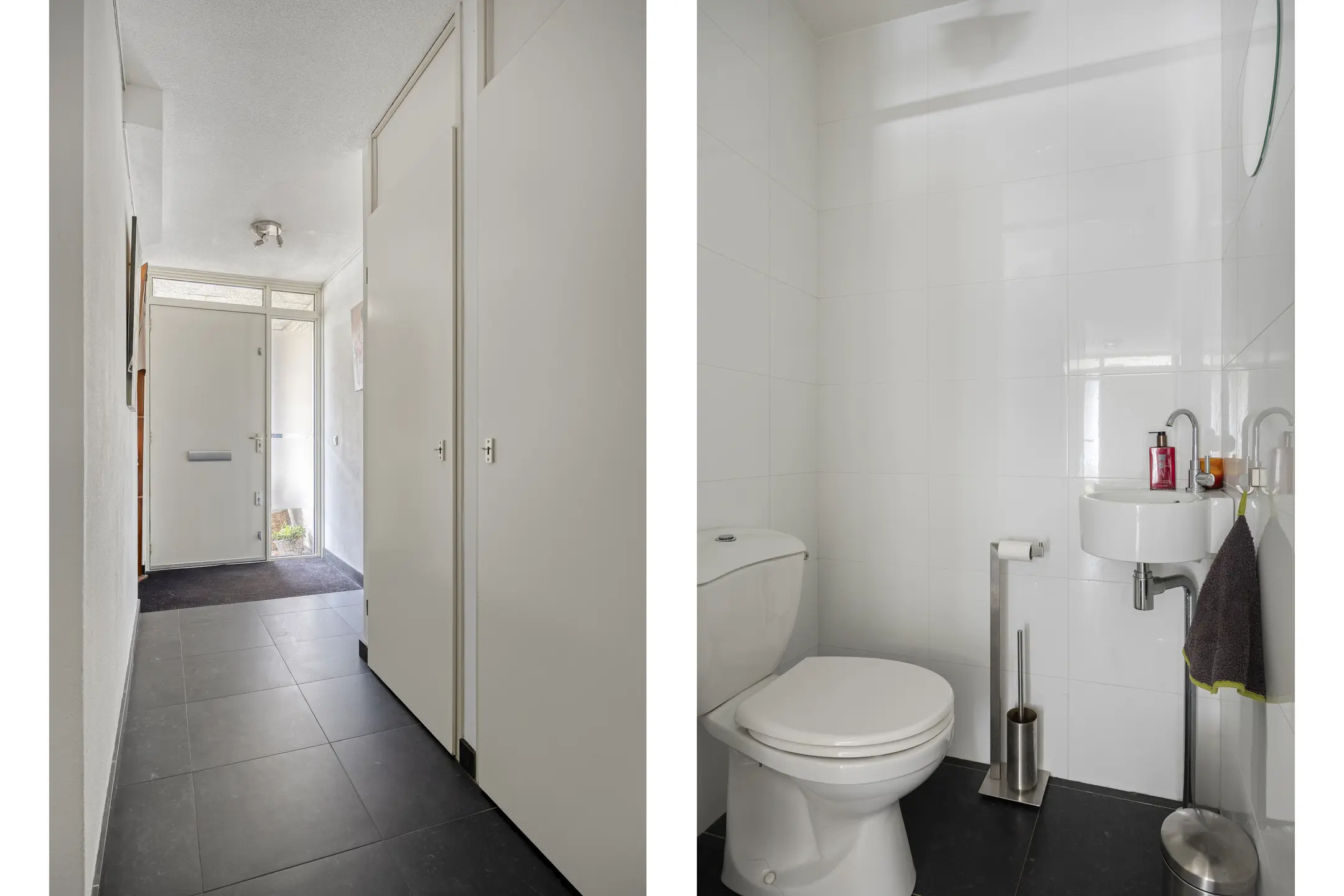 Via de entree kom je in de royale hal met meterkast en een modern, volledig betegeld toilet met hoekfonteintje.