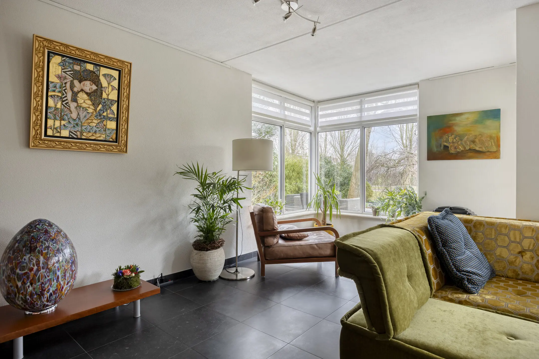 De gehele begane grond is afgewerkt met een antracietkleurige plavuizenvloer met comfortabele vloerverwarming die drempelloos doorloopt.