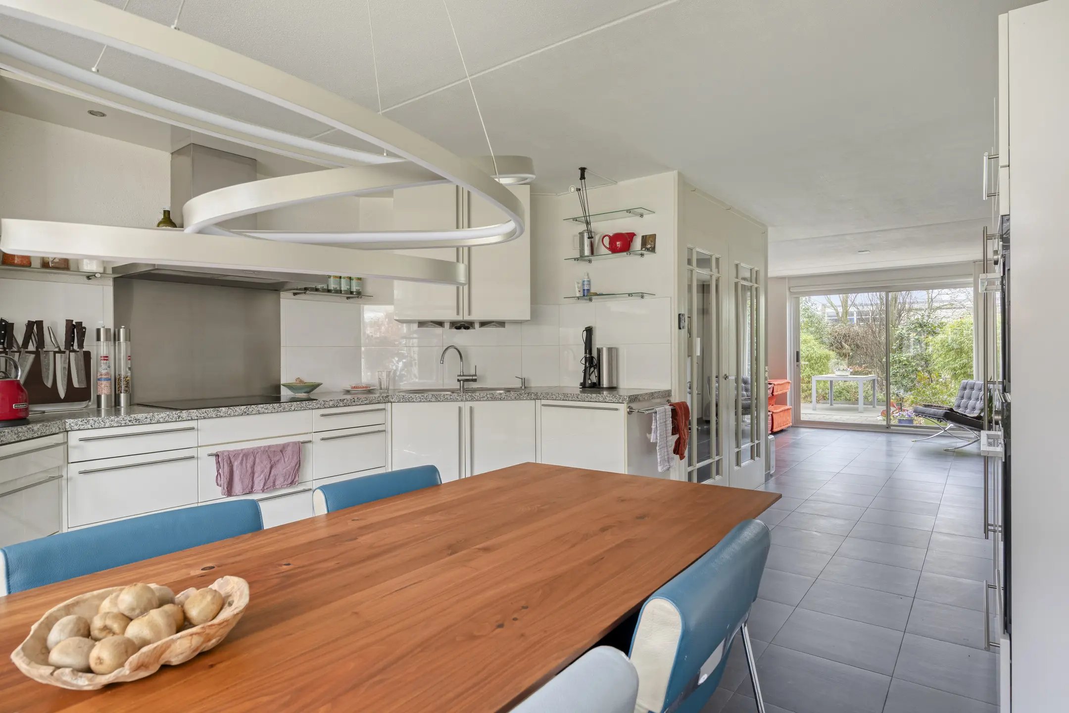 Aan de voorzijde bevindt zich de complete woonkeuken in hoogglans wit, voorzien van diverse inbouwapparatuur, waaronder een gaskookplaat, RVS-afzuigkap, combimagnetron en oven, vaatwasser, koelkast en vriezer