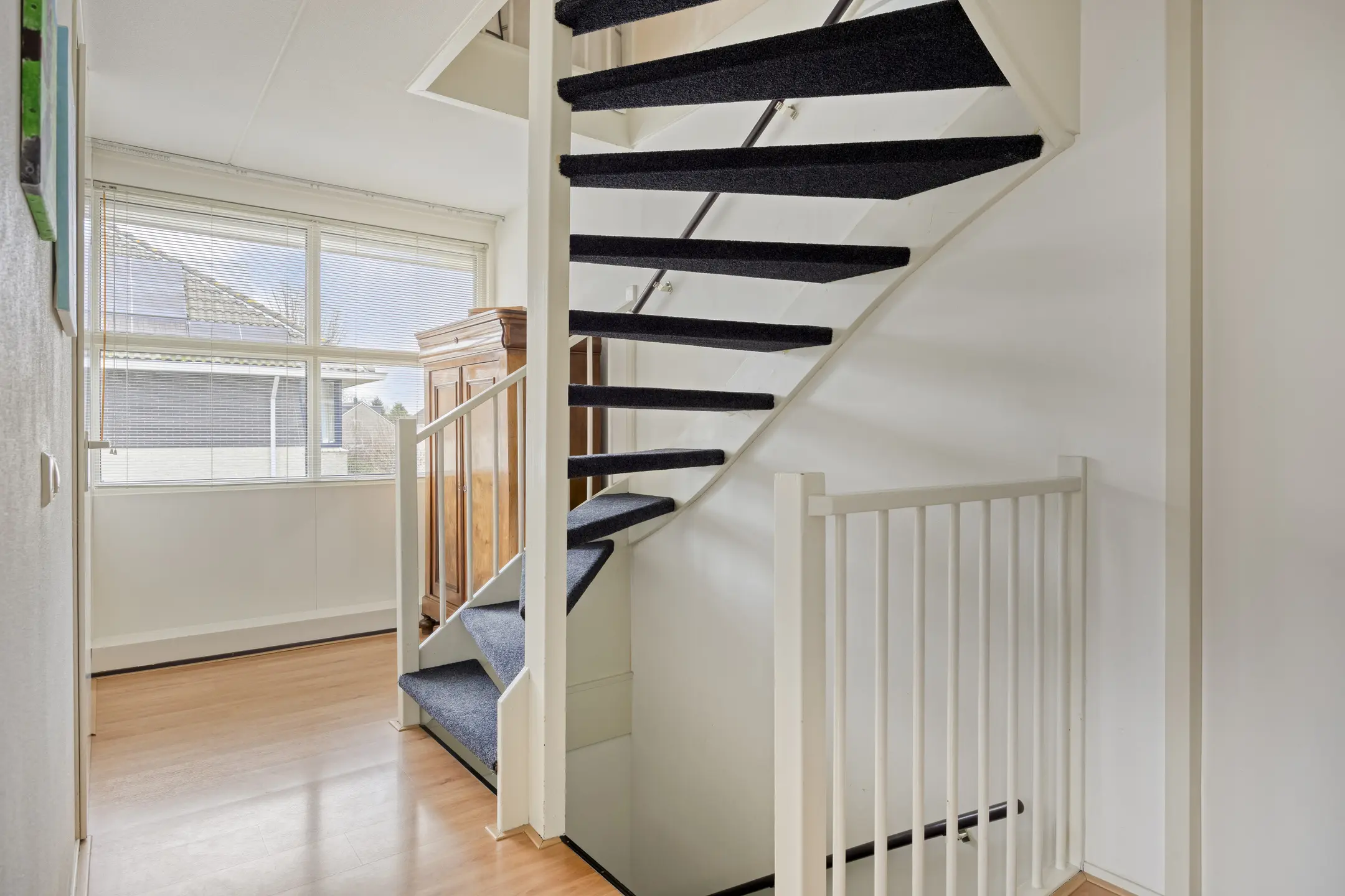 De gehele verdieping is voorzien van een laminaatvloer die netjes doorloopt. Op de overloop bevindt zich een inbouwkast met aluminium/glas schuifdeuren.