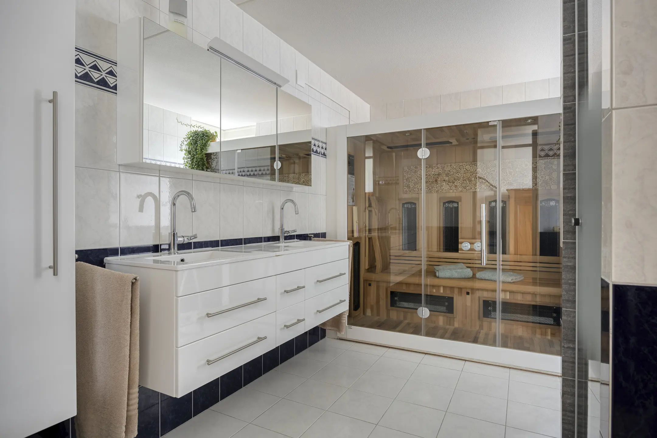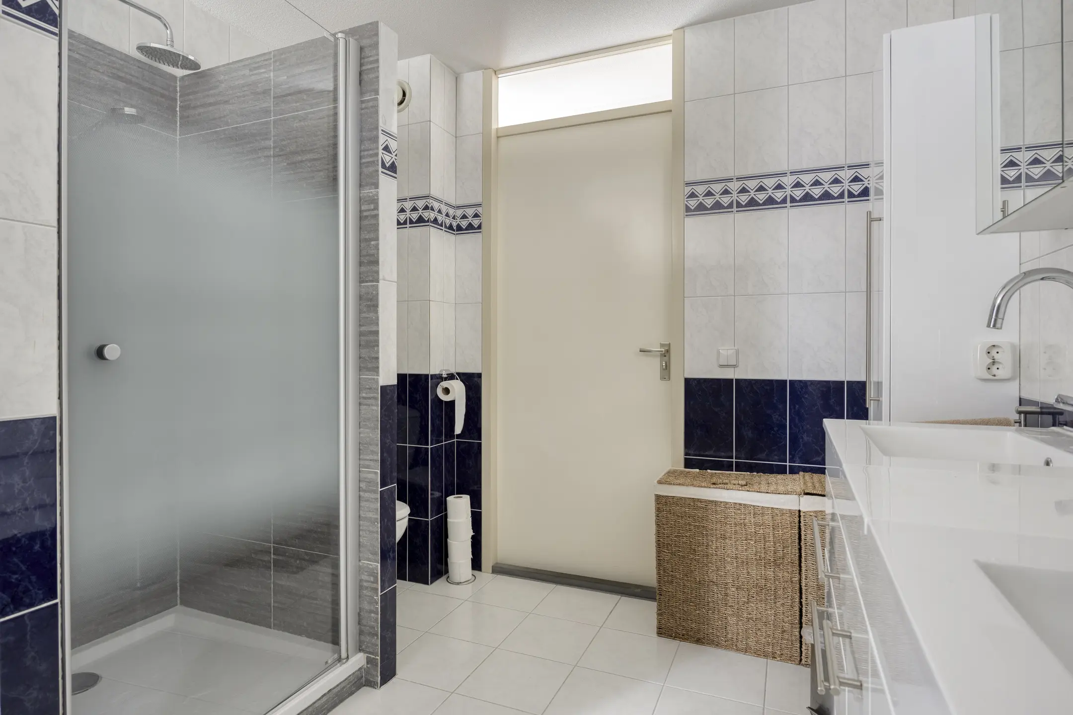 De ruime badkamer is volledig betegeld en uitgerust met een geweldige sauna, douchecabine, toilet, dubbele wastafel en een te openen raam voor natuurlijke ventilatie.