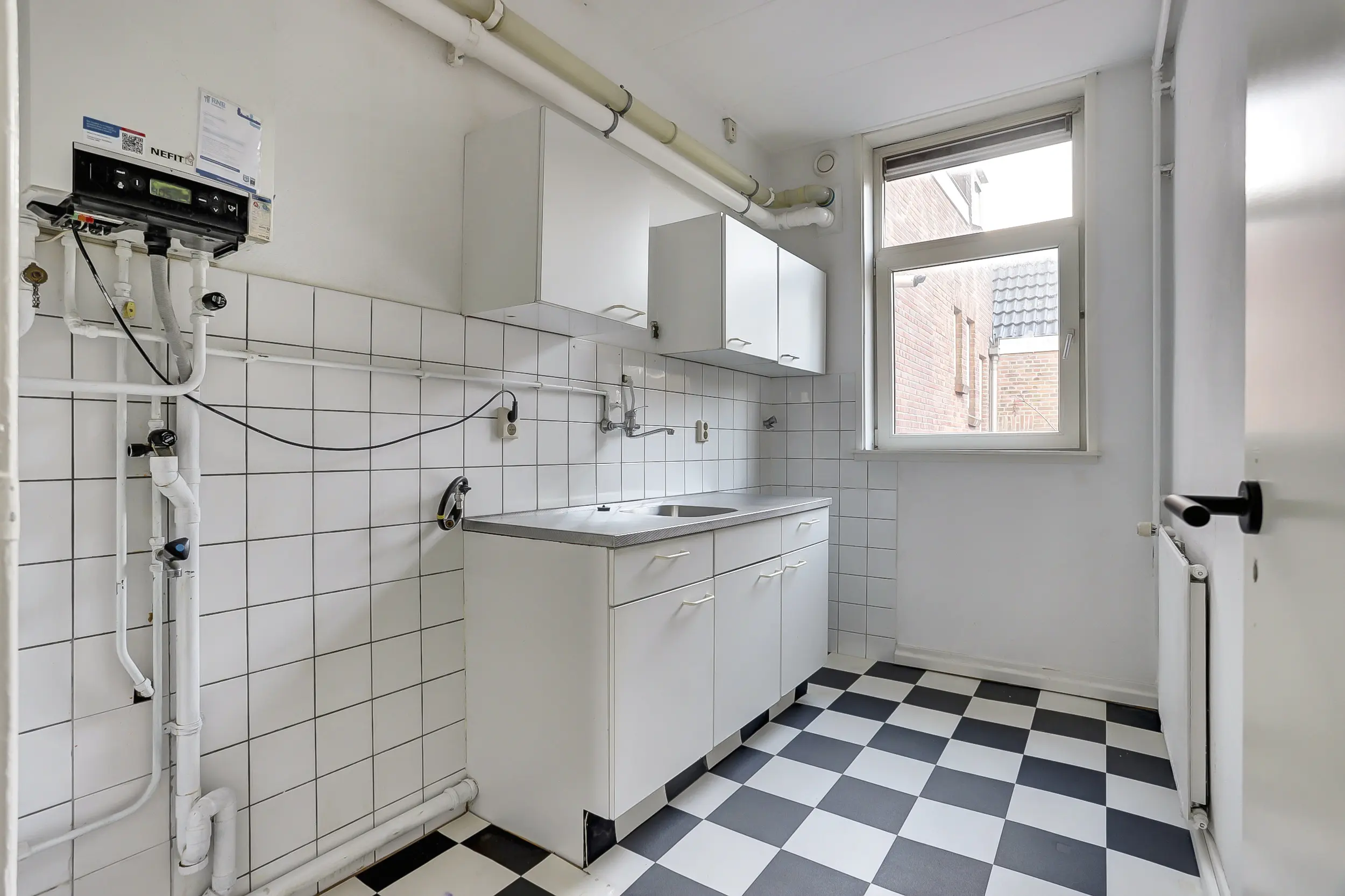 Keuken met eenvoudige opstelling en CV-ketel (Nefit, bouwjaar 2011).