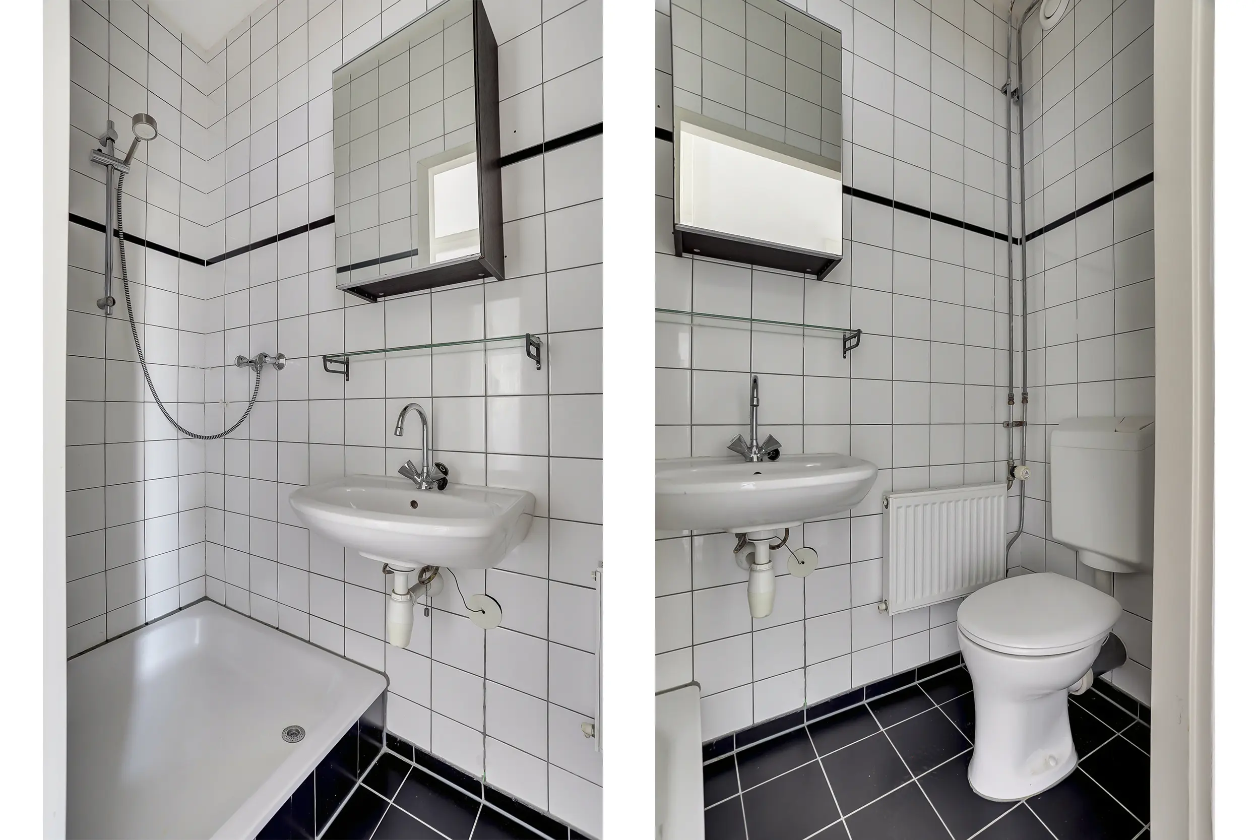 Badkamer met douche, wastafel en toilet.