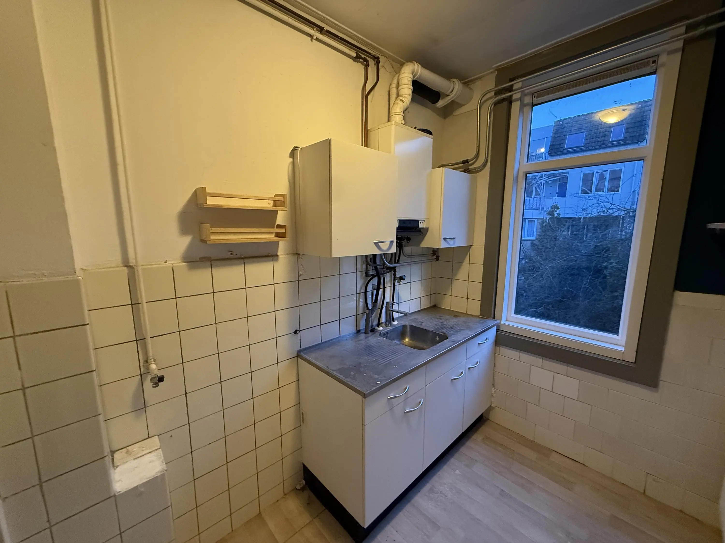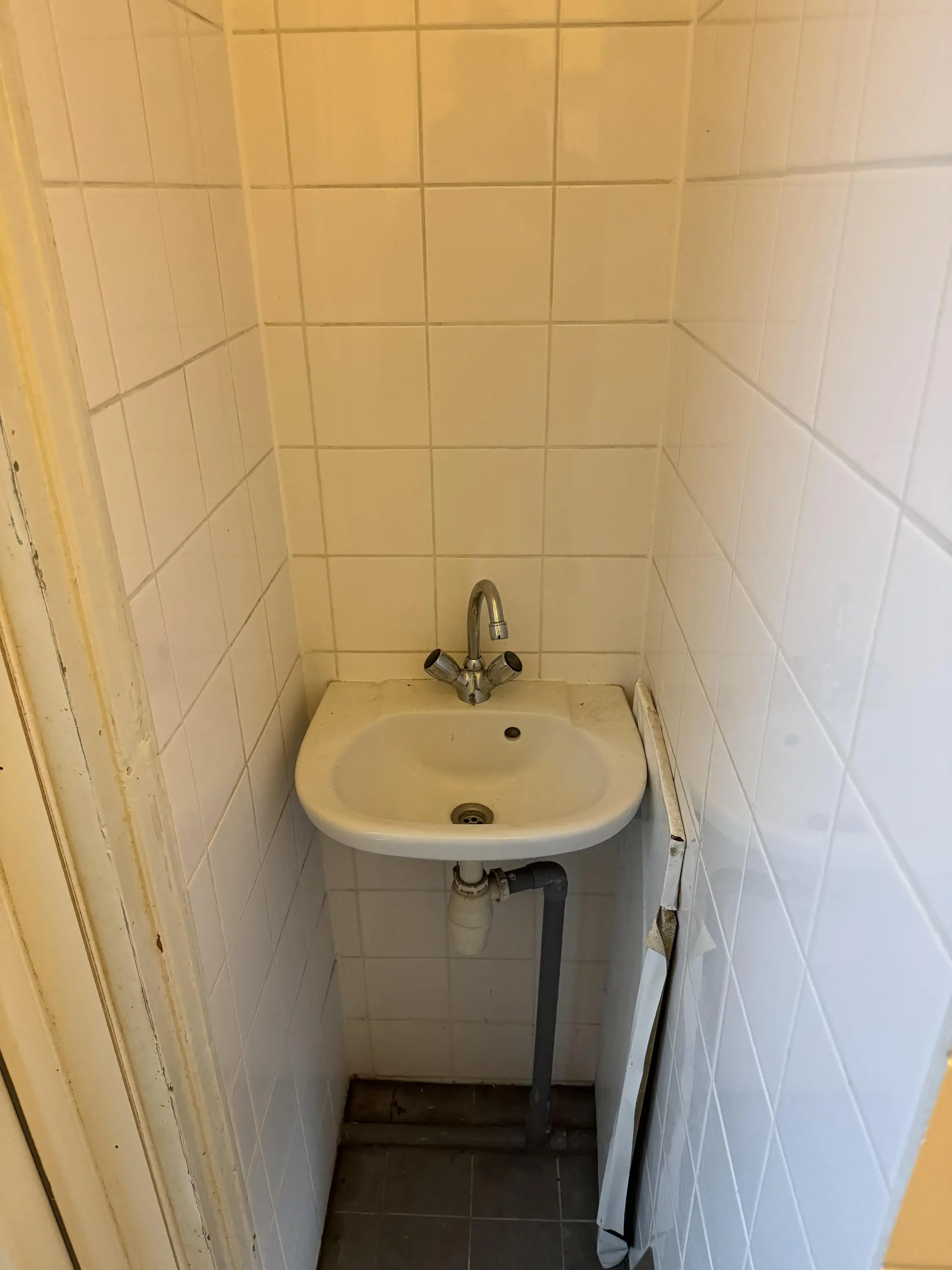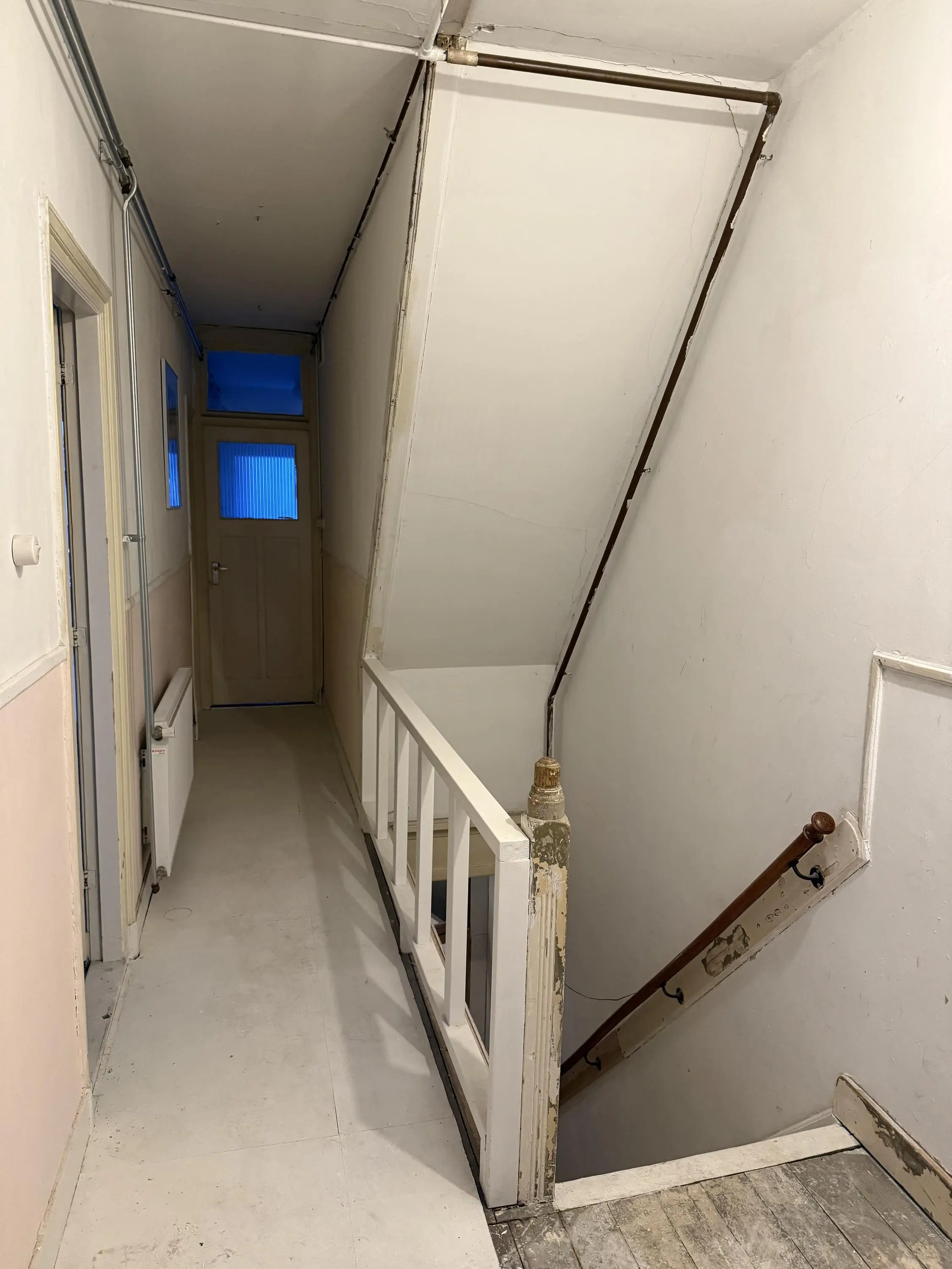 De woning komt u via een smalle gang binnen vervolgens kunt u de trap op naar boven. Aan de linkerzijde treft u ruime keuken. Door de gang naar de badkamer zit een appart toilet ernaast treft u de badkamer met douche en een wastafel.
