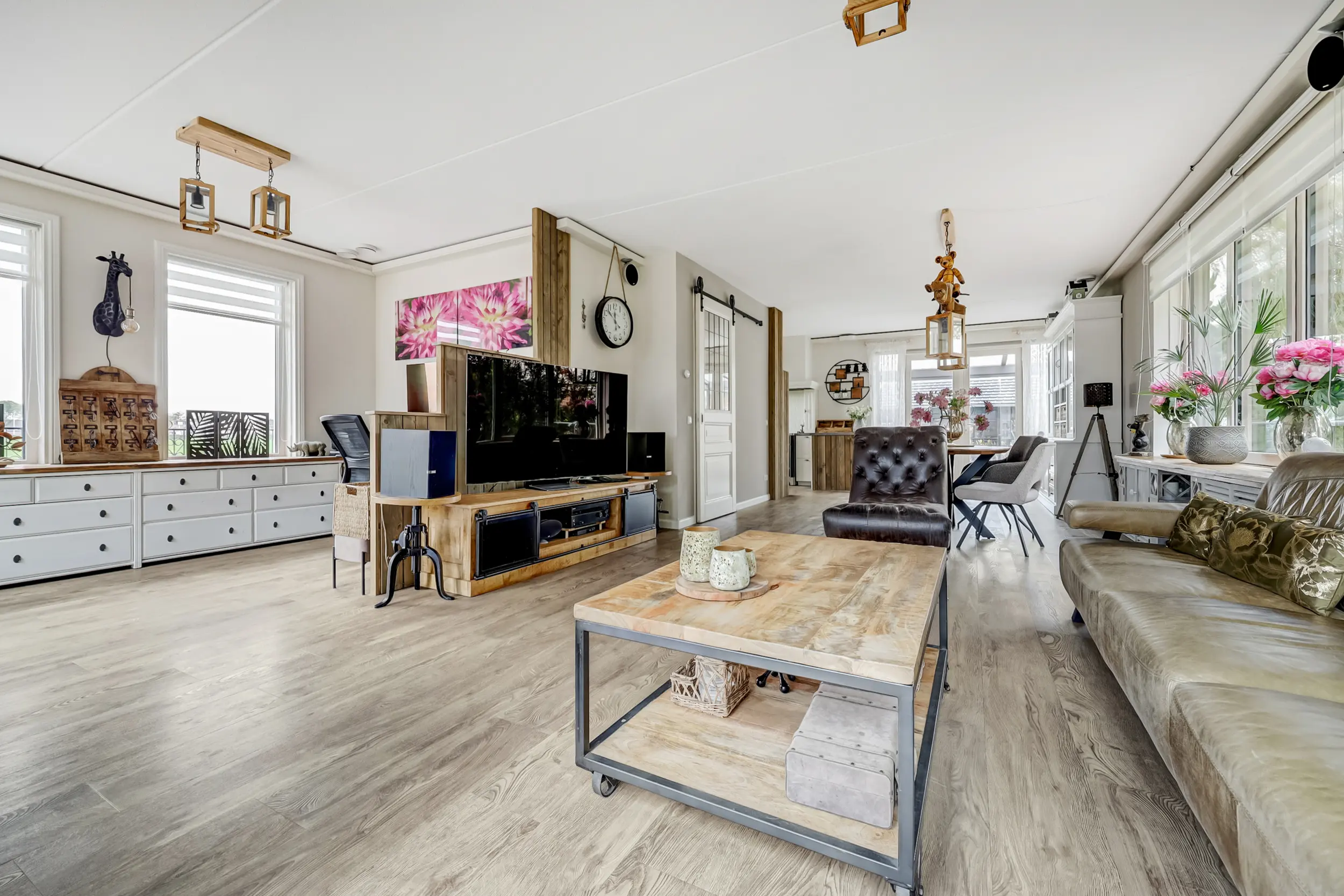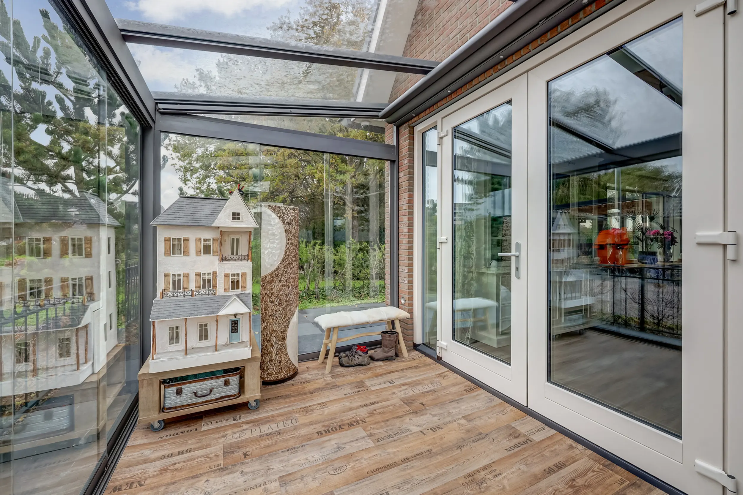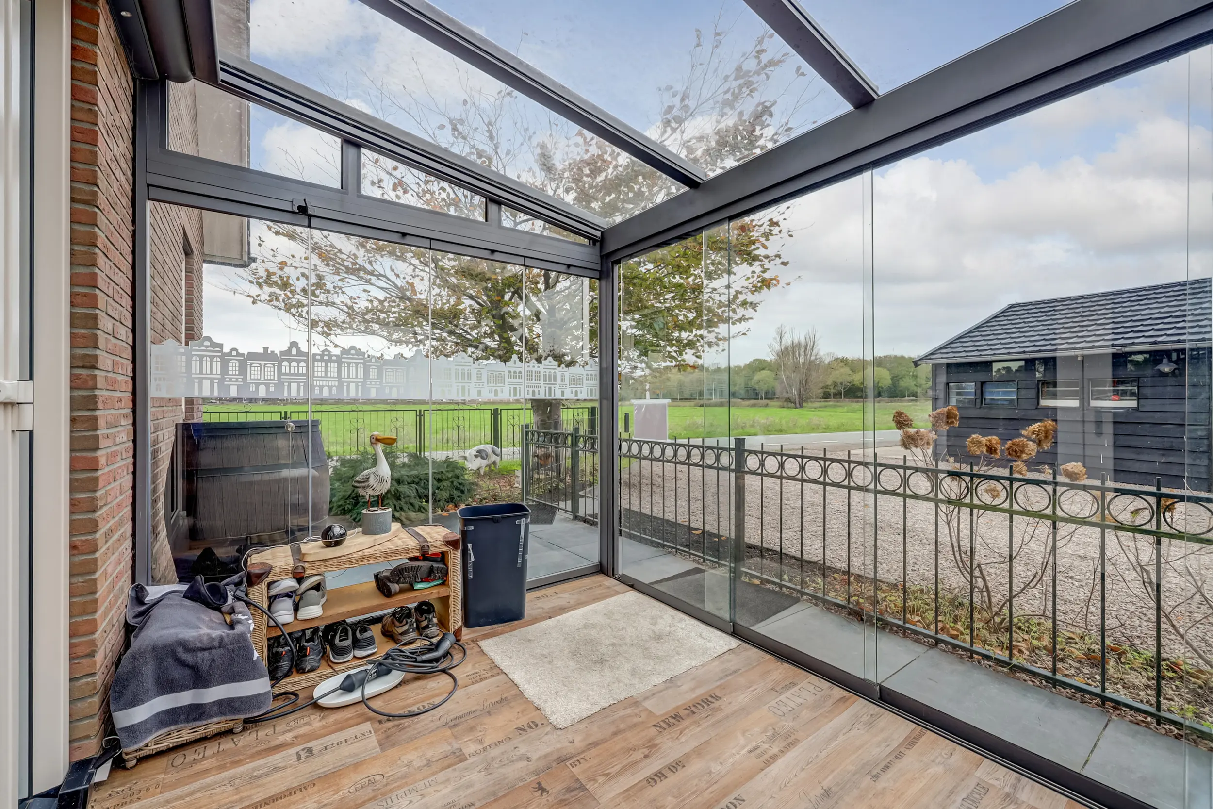 De begane grond heeft een ruime open woonkamer met schitterend zicht over de weilanden. De ruimte is gevuld met veel natuurlijk licht door de raampartijen rondom. Aan beide zijkanten van de woning treft u een fraaie glazen serre.