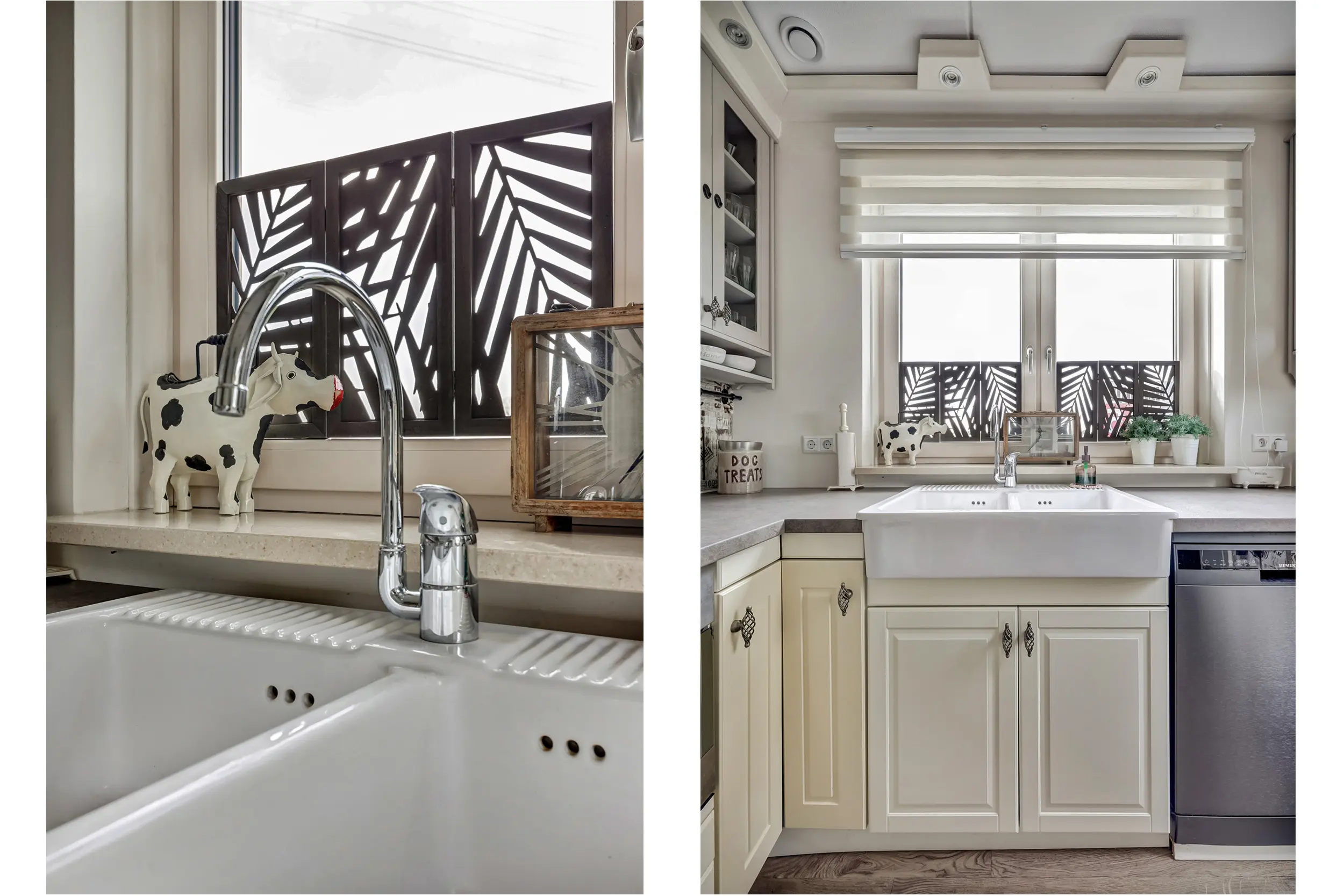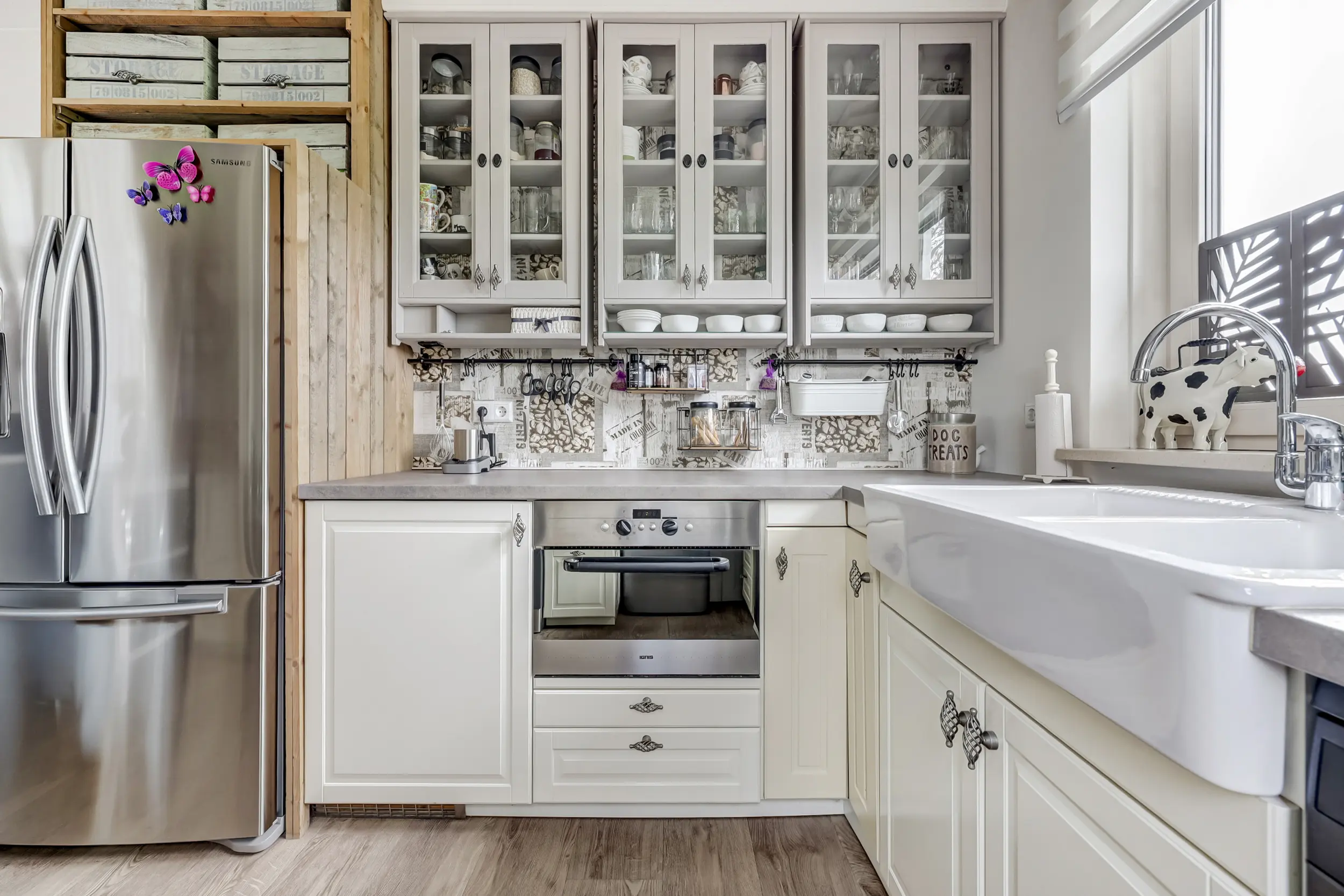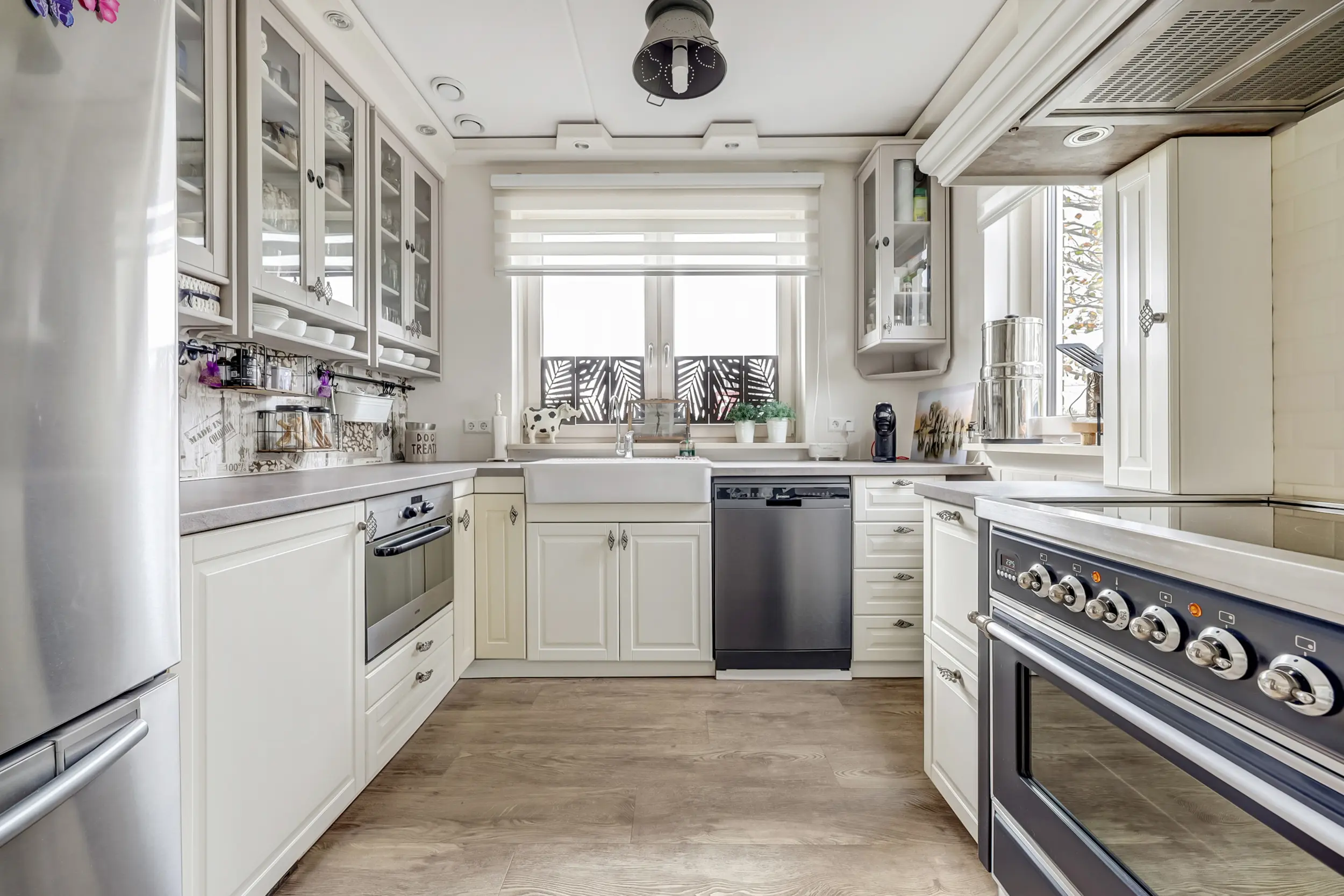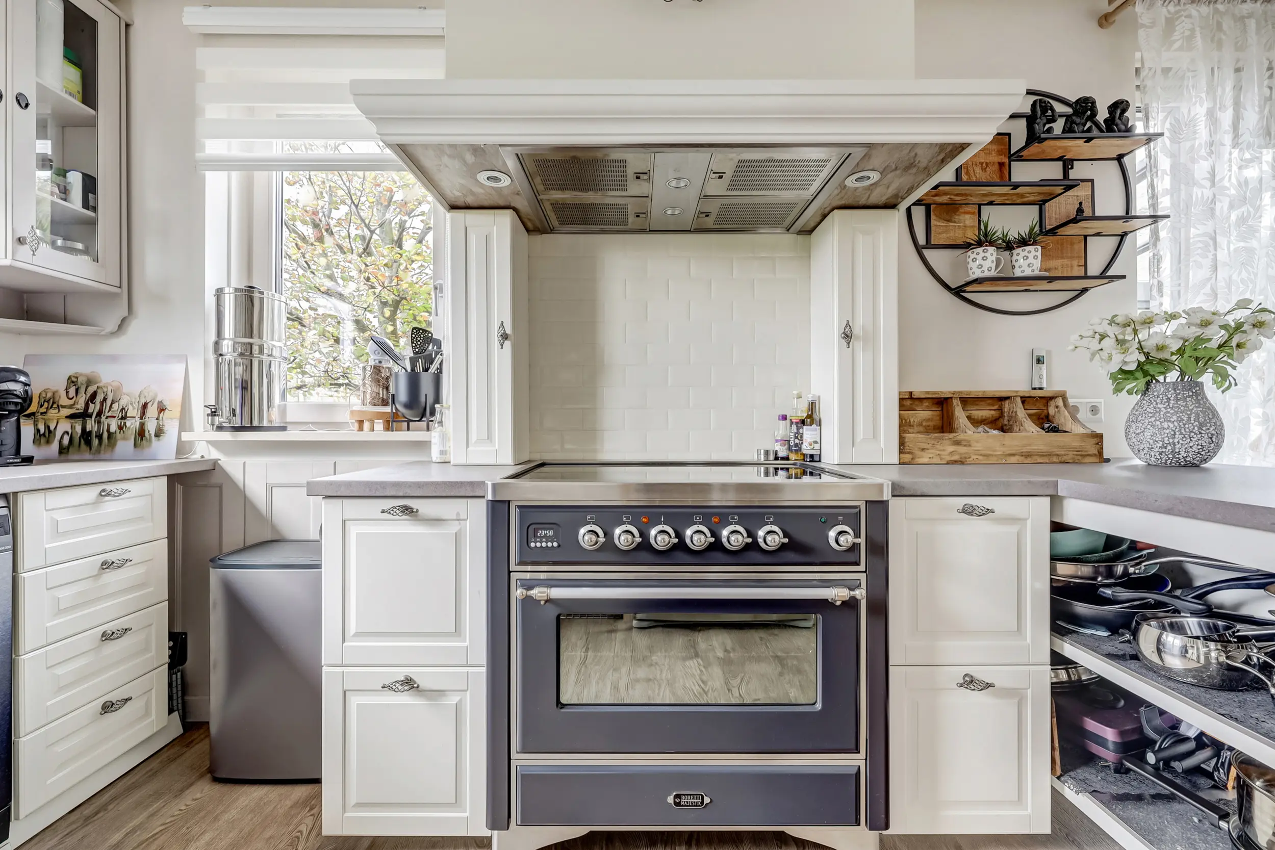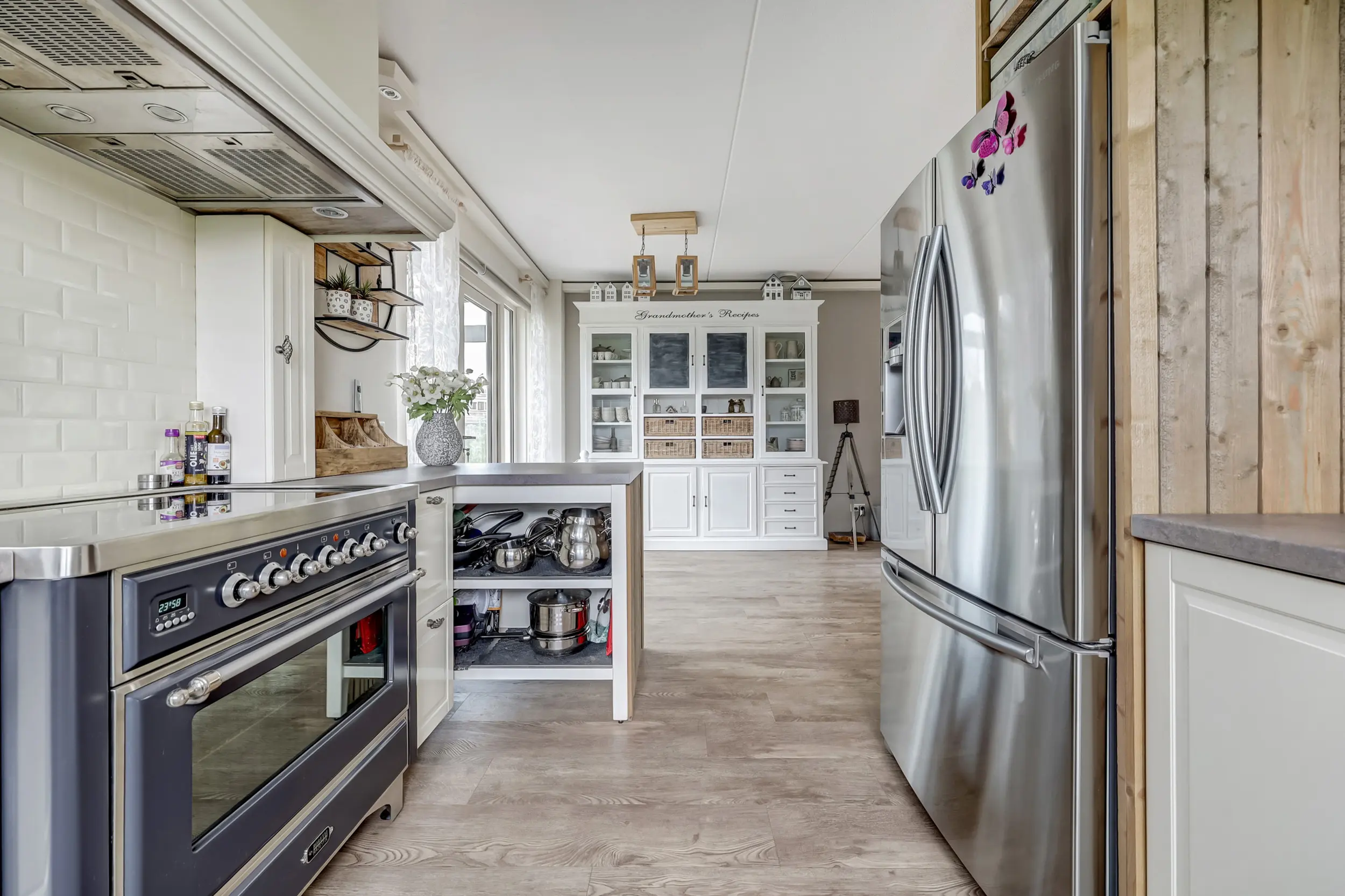 De open keuken in landelijke stijl is uitgevoerd met groot fornuis met oven, Amerikaanse koelkast en apparatuur als vatwasser en 15L keukenboiler.
