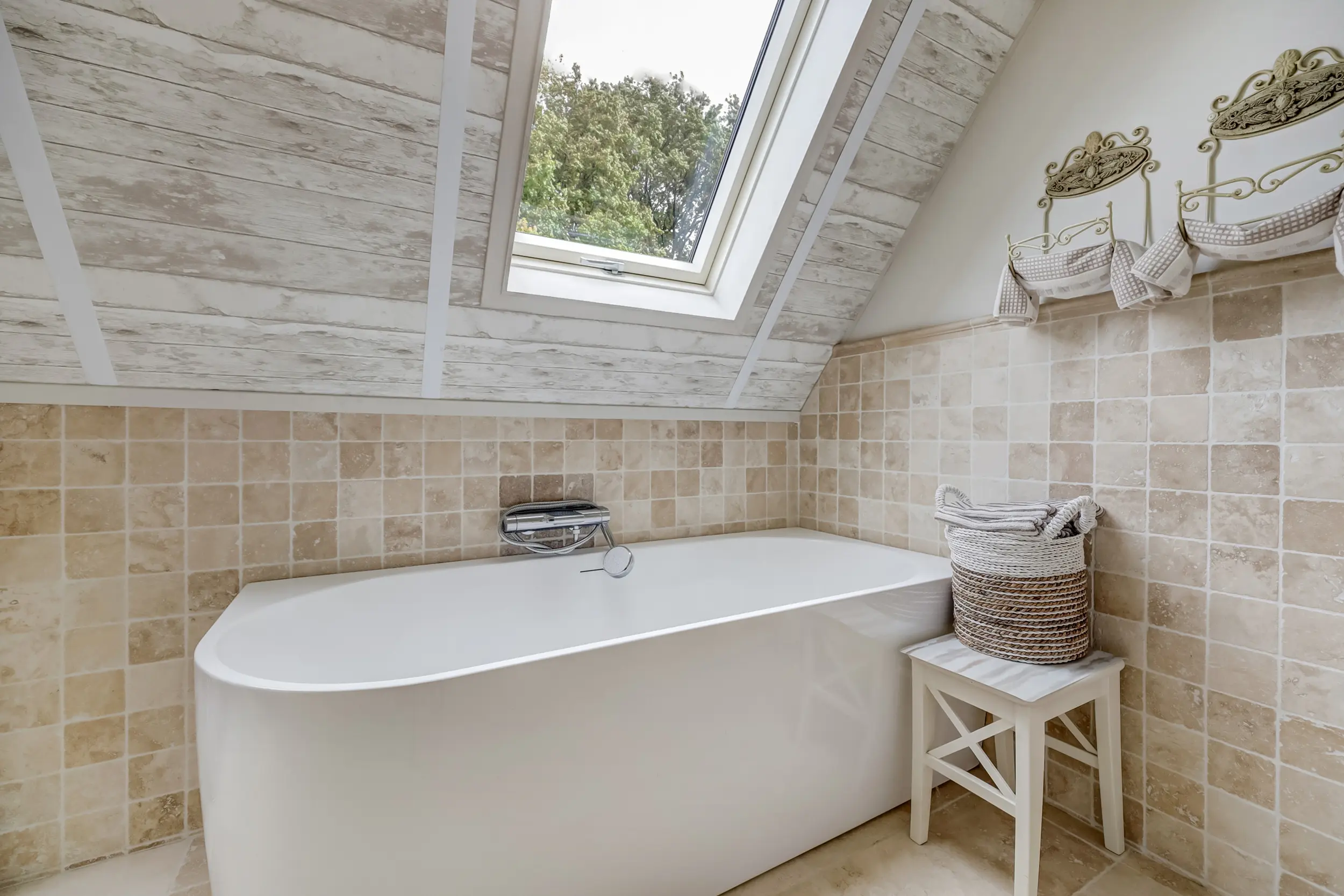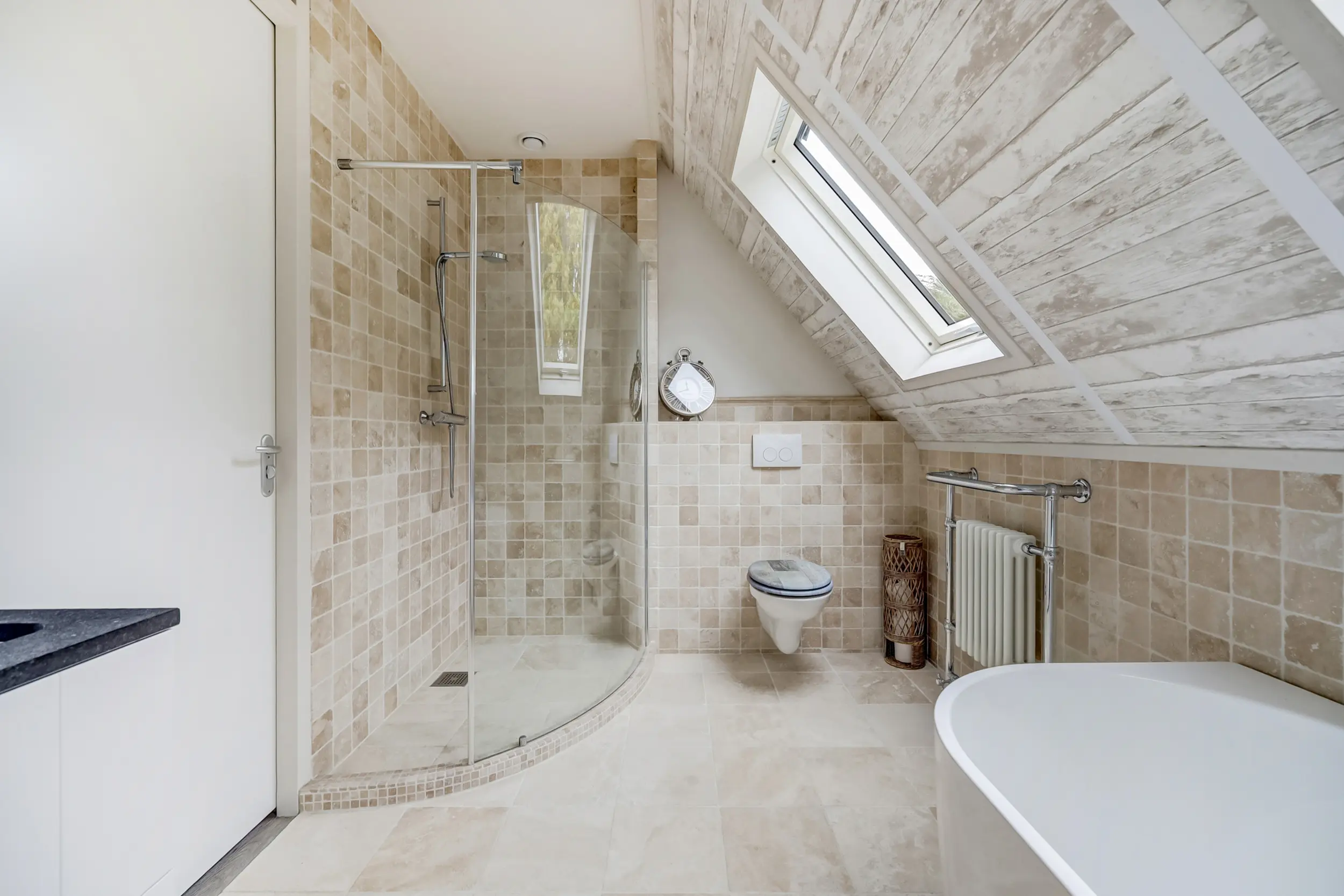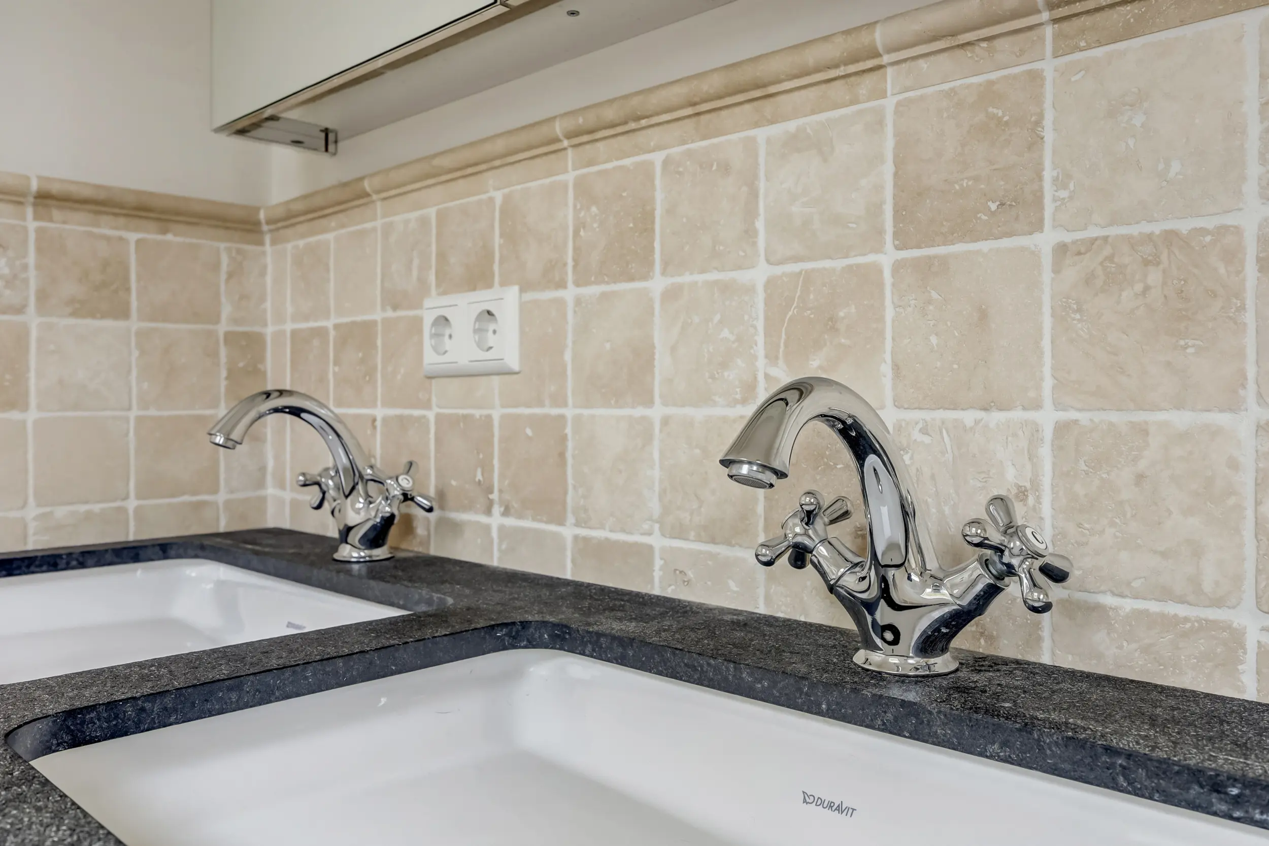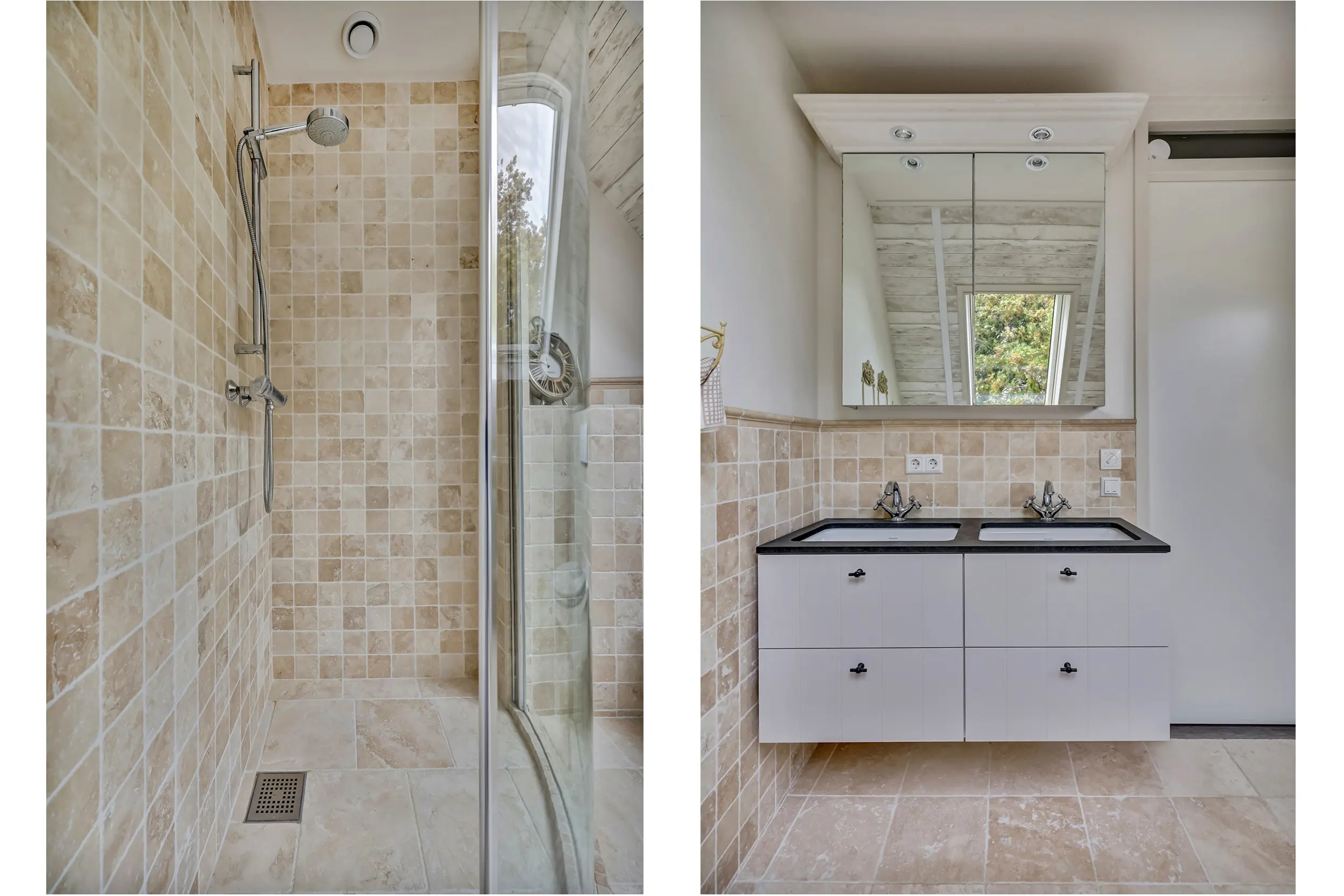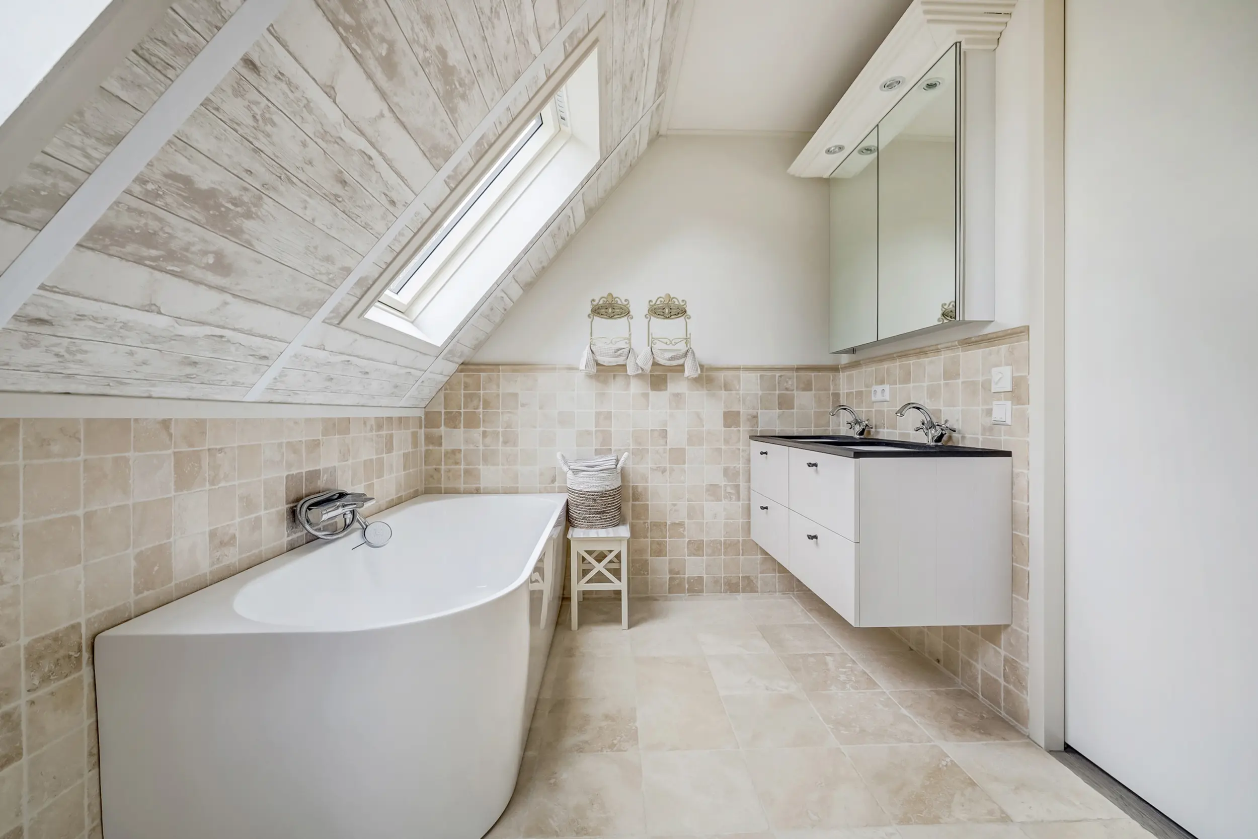 Op de eerste verdieping vindt u twee slaapkamers (mogelijkheid voor 3 slaapkamers) en een moderne badkamer met een ligbad, toilet, douche en dubbele wastafel. Verder een praktische was- en stookruimte.