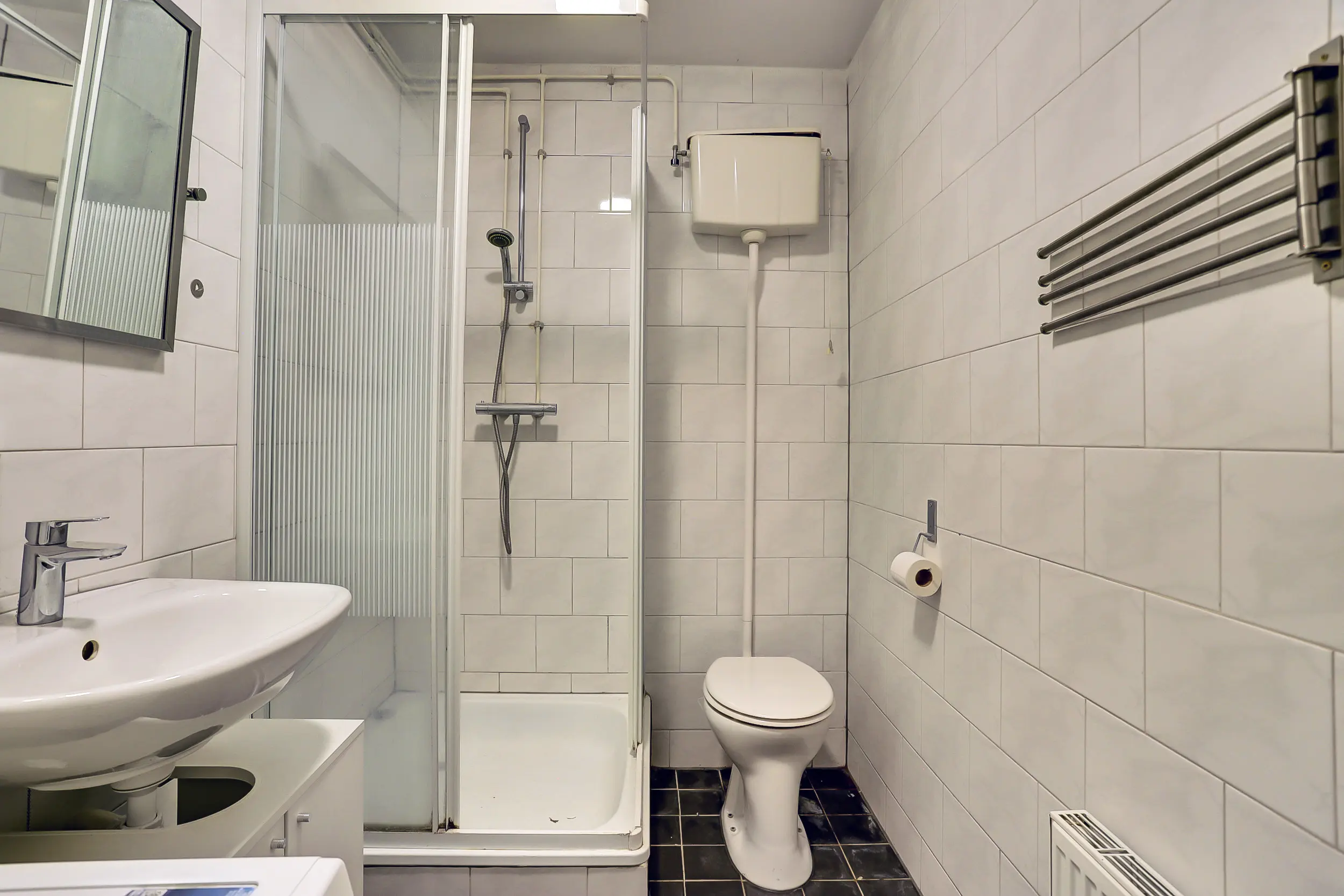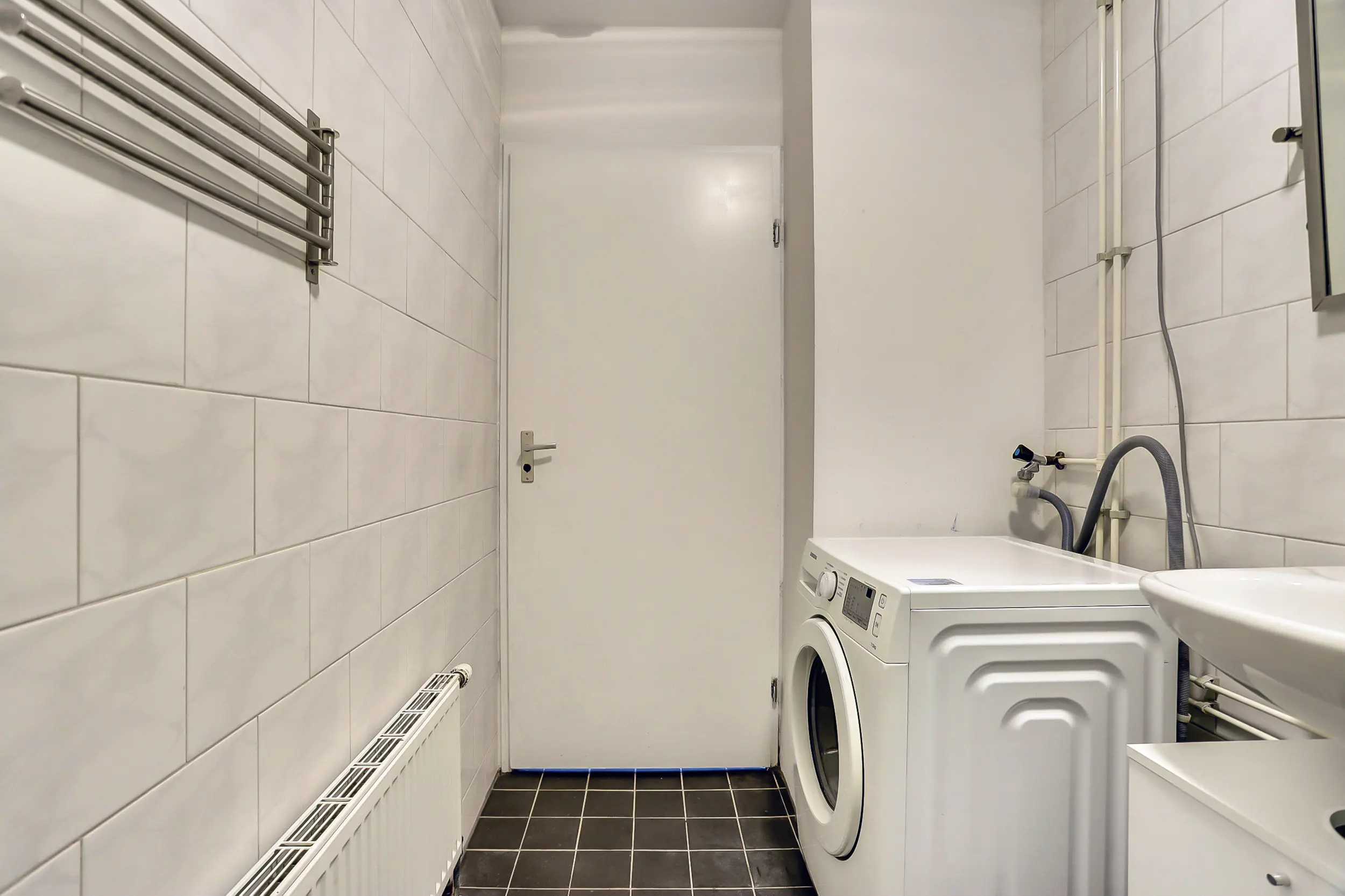 Ruime badkamer met douche, wastafel, toilet en wasmachineaansluiting.